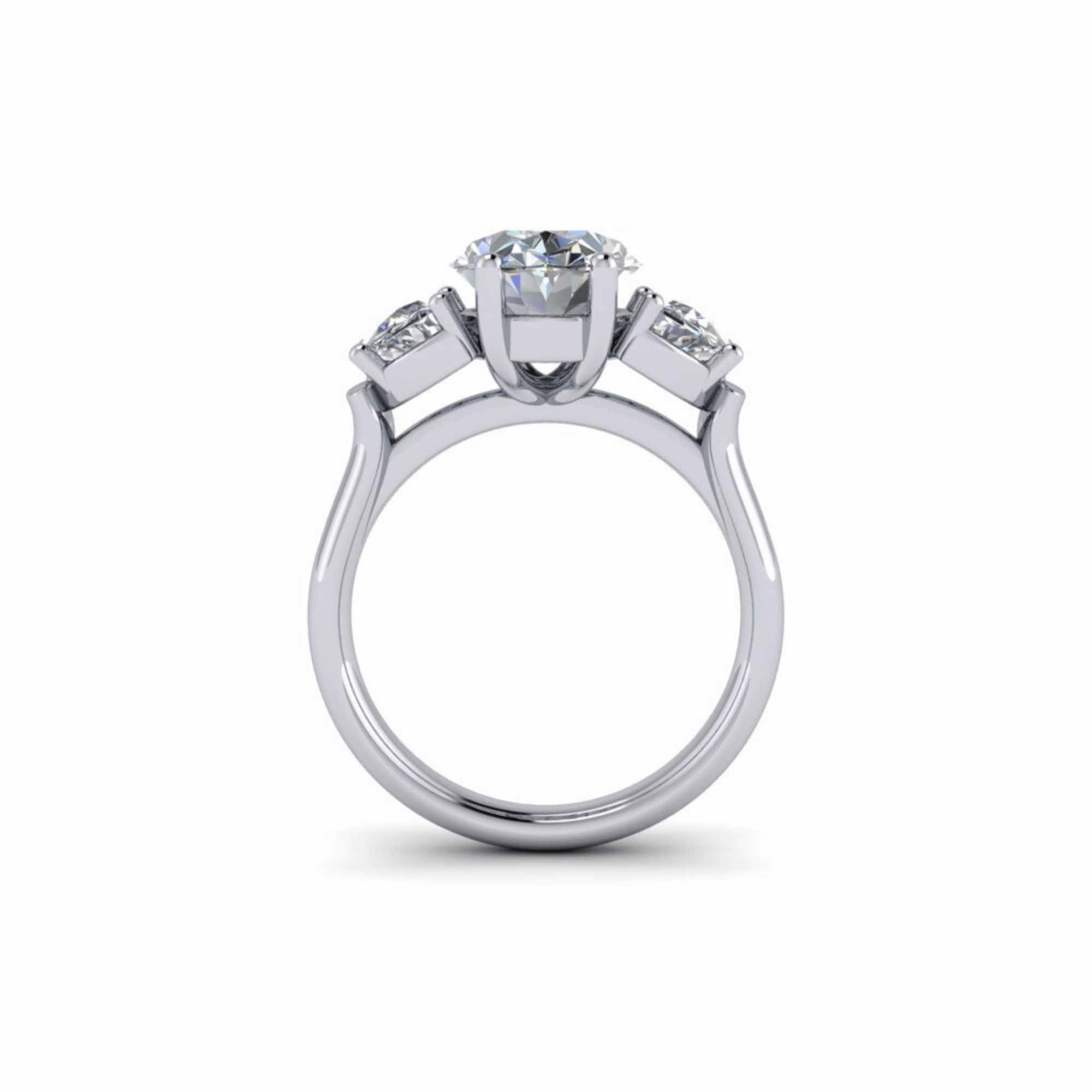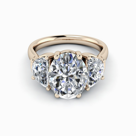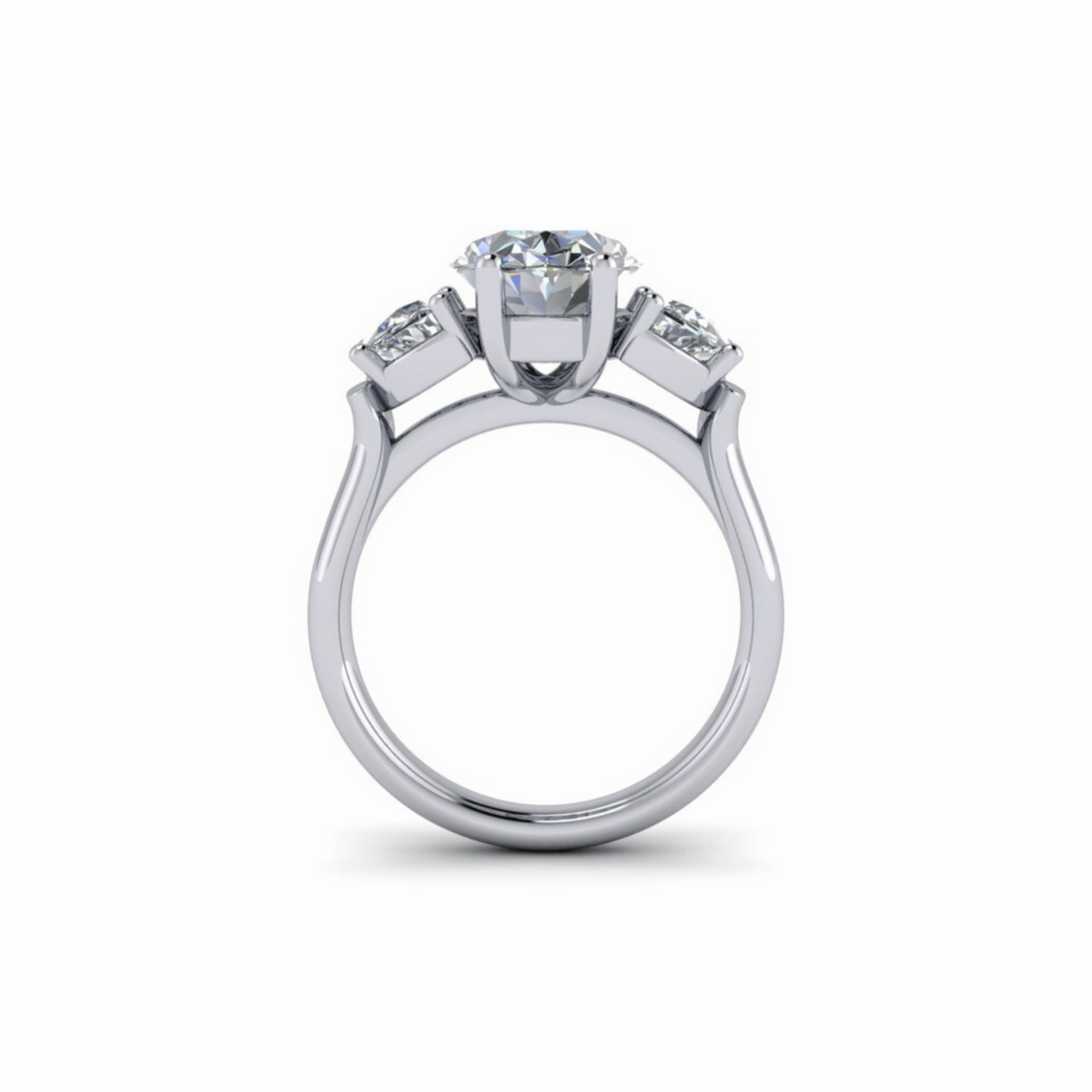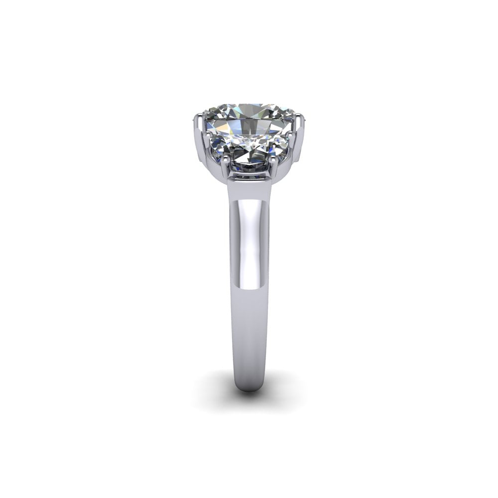 Lab diamond three stone ring, modern cathedral setting in gold or platinum.
