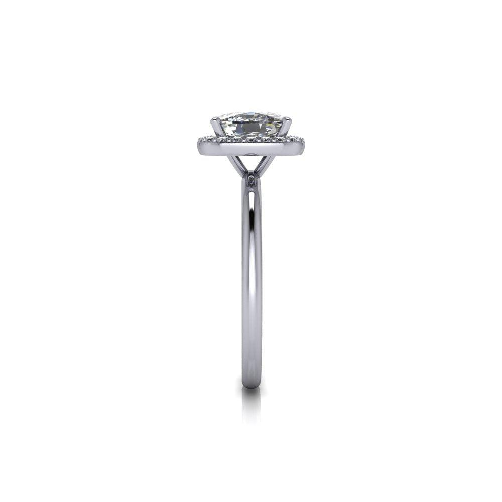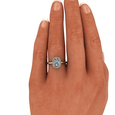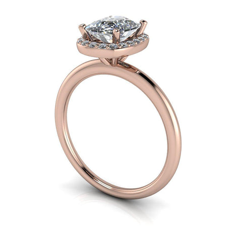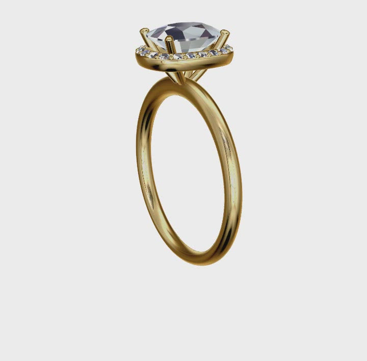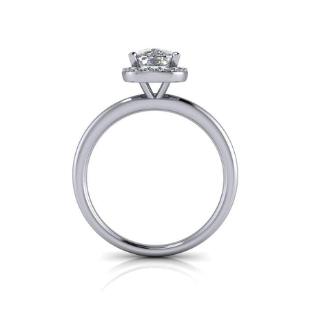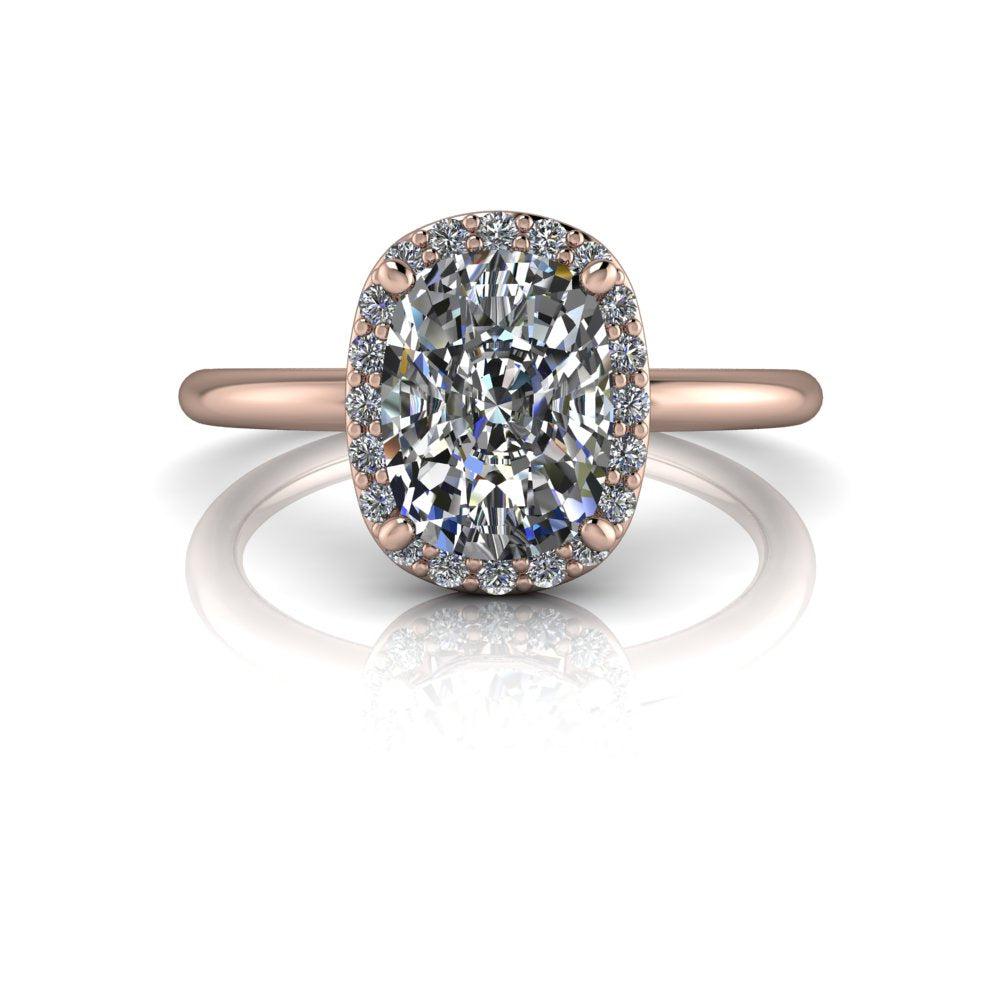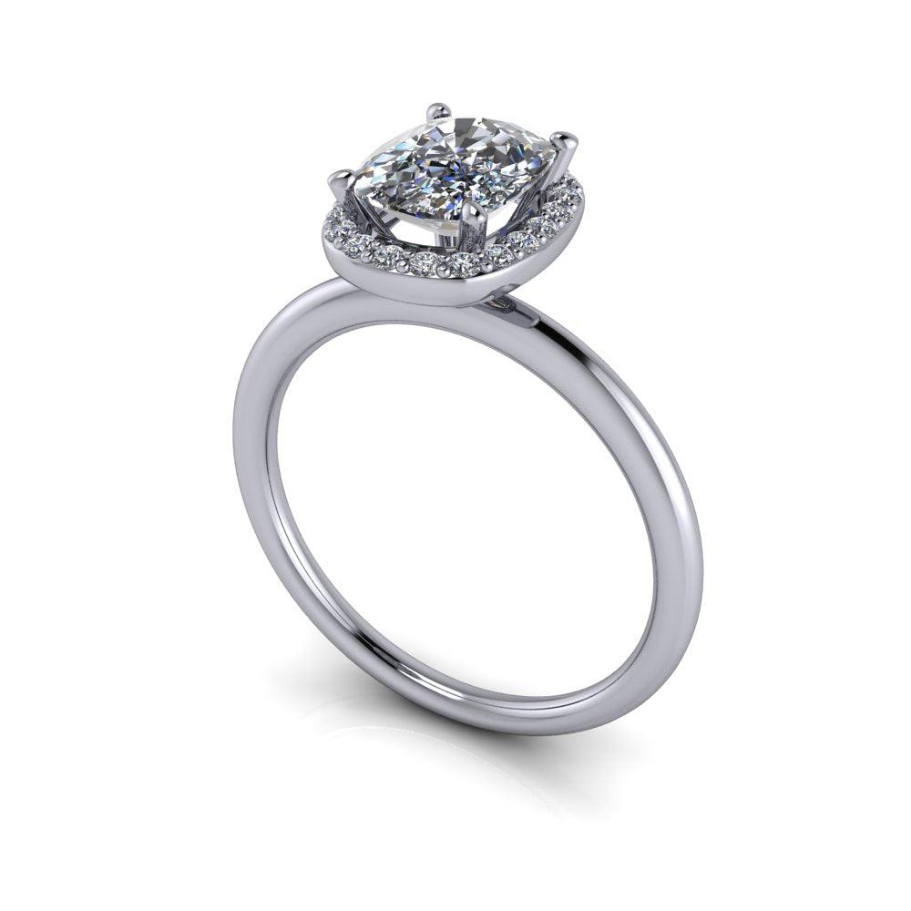 Anillo de compromiso minimalista simple que se muestra con un tamaño de 8x6 mm y 1,60 ct. Moissanita incolora con corte cojín alargado, color DEF, claridad VVS.