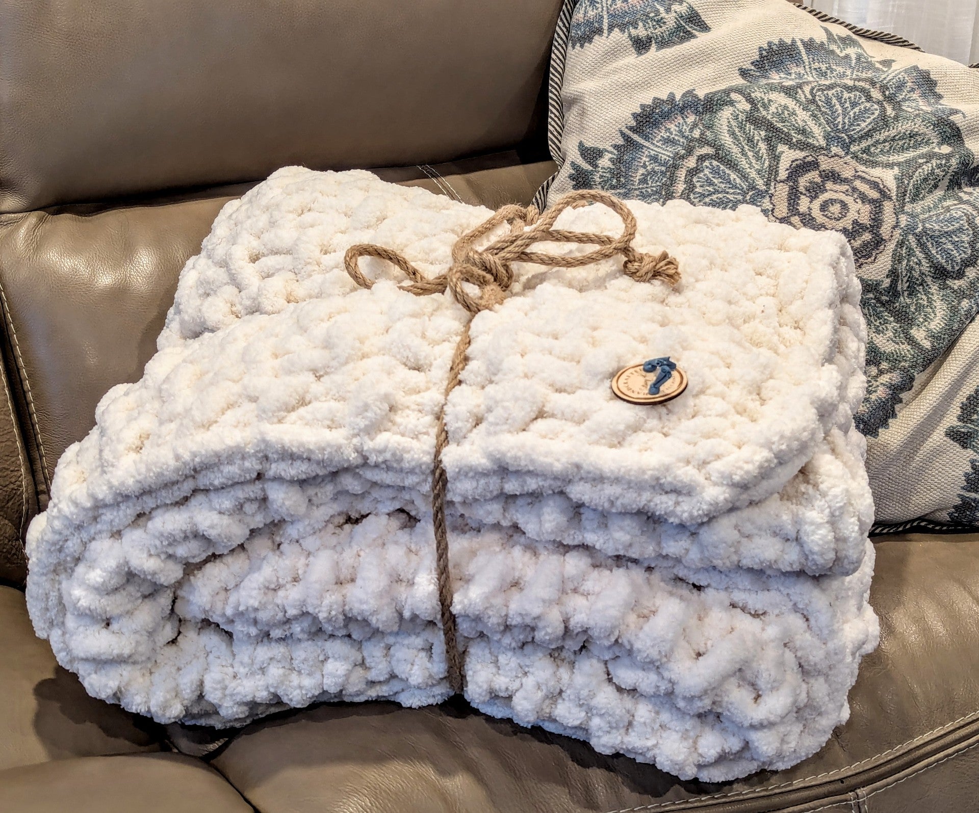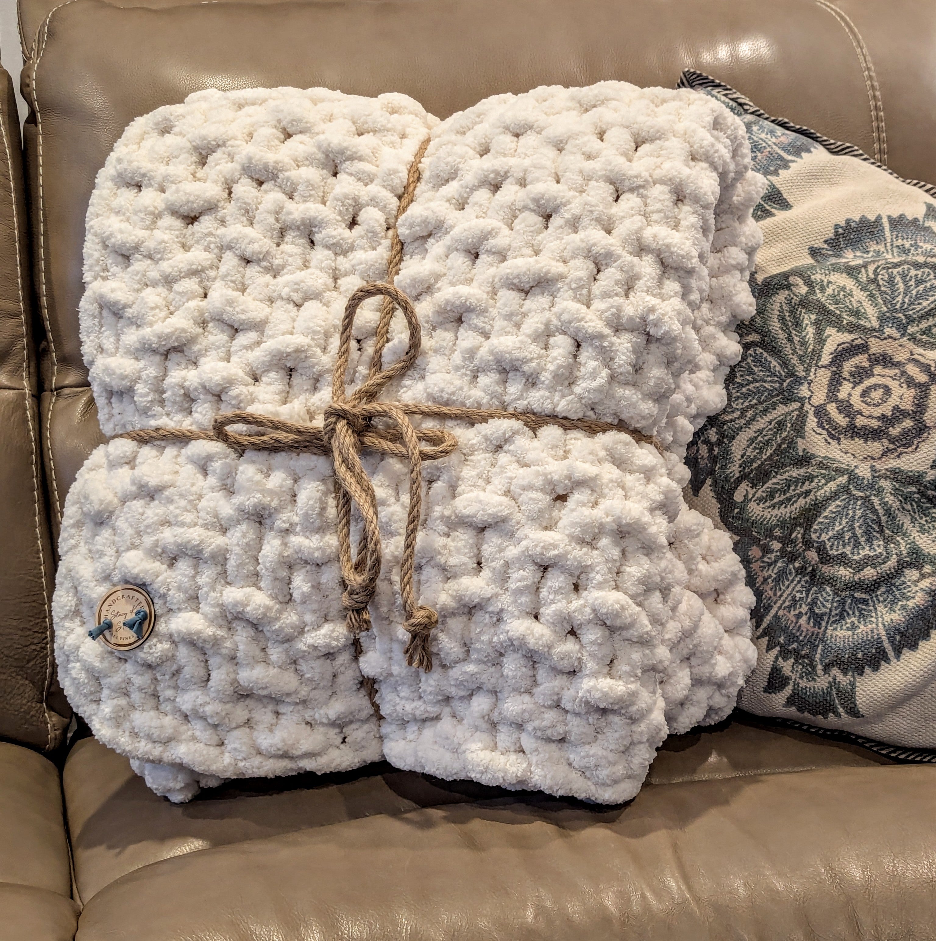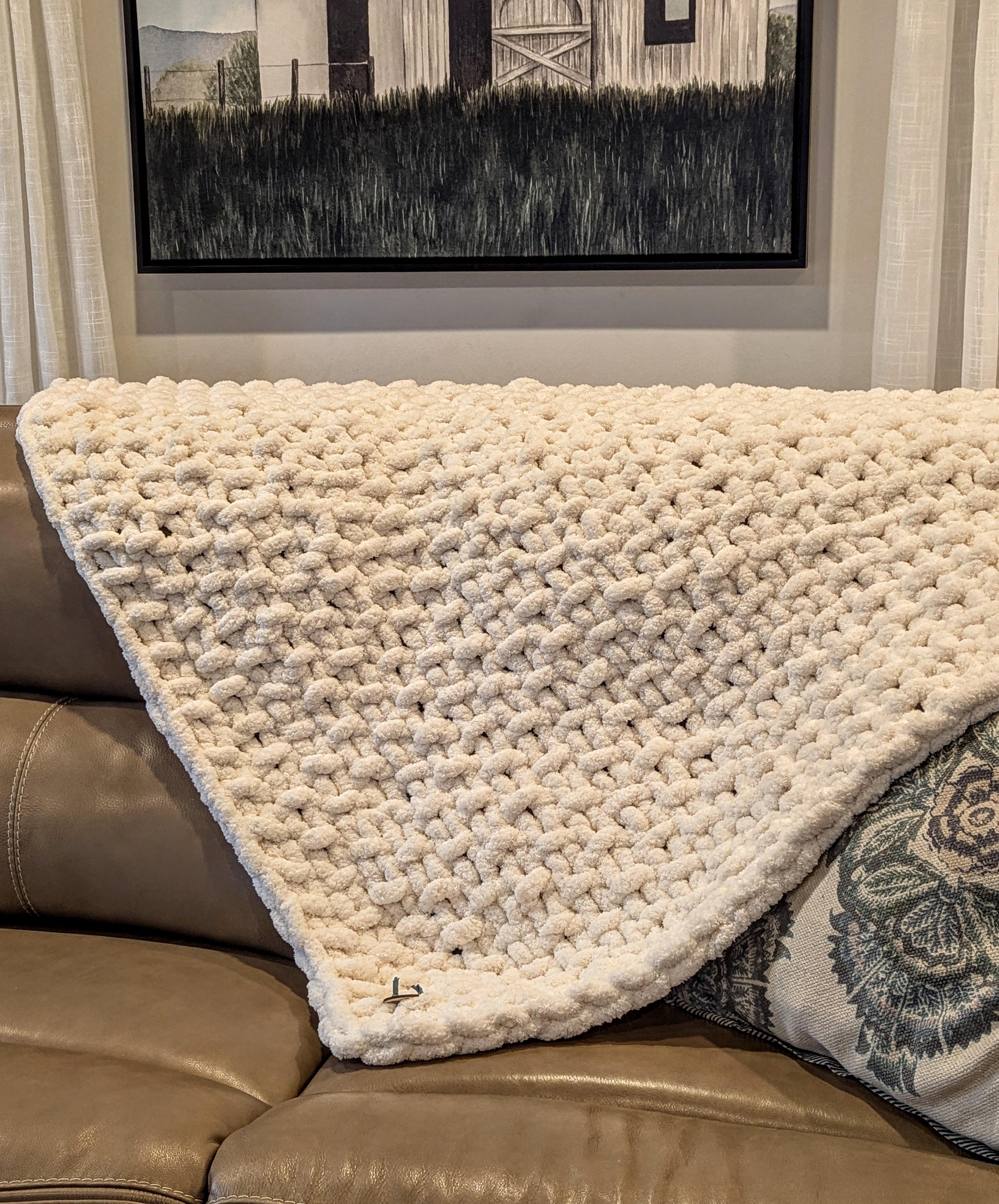 This handmade chunky throw blanket is knit in Bernat Blanket Extra Thick jumbo yarn making it perfect for staying warm and cozy.
