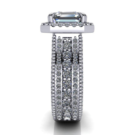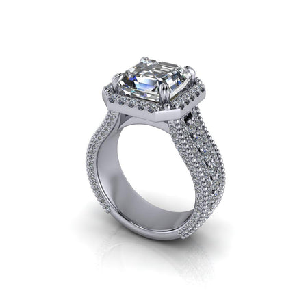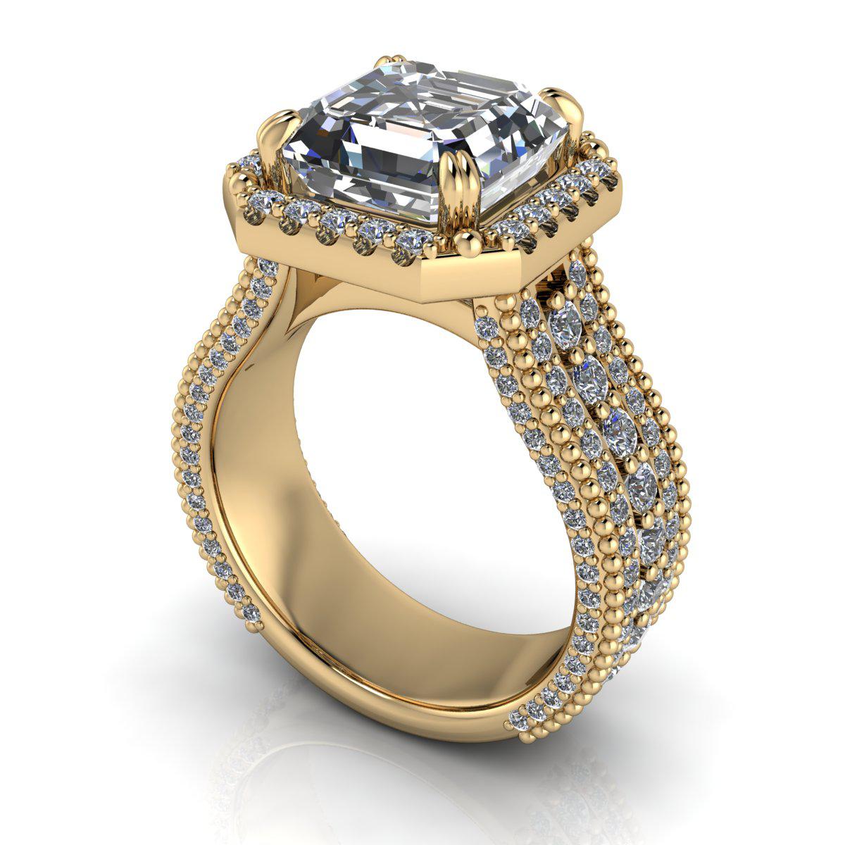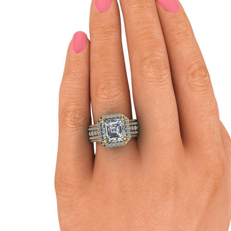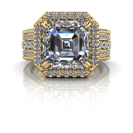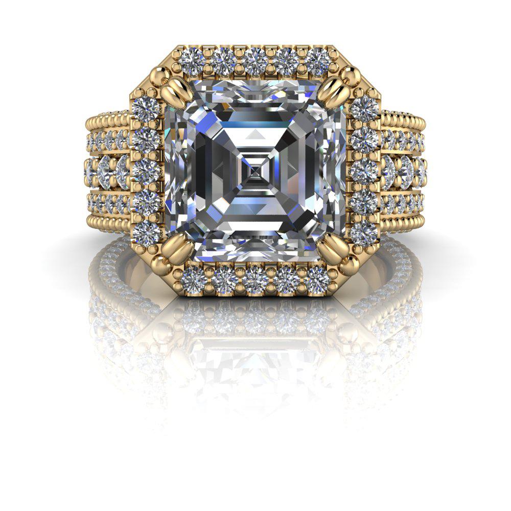 Este anillo Cindy No. 1 es un exquisito sÃmbolo de amor eterno. Su halo de talla Asscher está elaborado con detalles de lujo y moissanita brillante, que enmarca maravillosamente la piedra preciosa central. Un regalo perfecto para un aniversario, la banda ancha brinda una apariencia deslumbrante que durará toda la vida.