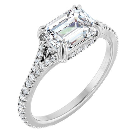 Anillo de compromiso de moissanita de tres piedras que se muestra con una moissanita incolora en forma de pera de 12x8 mm y 3,57 ct, color DEF y claridad VVS.