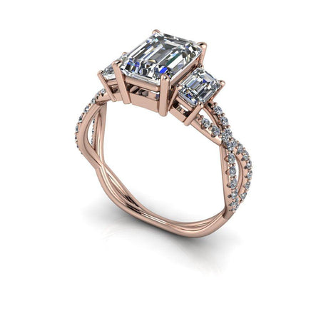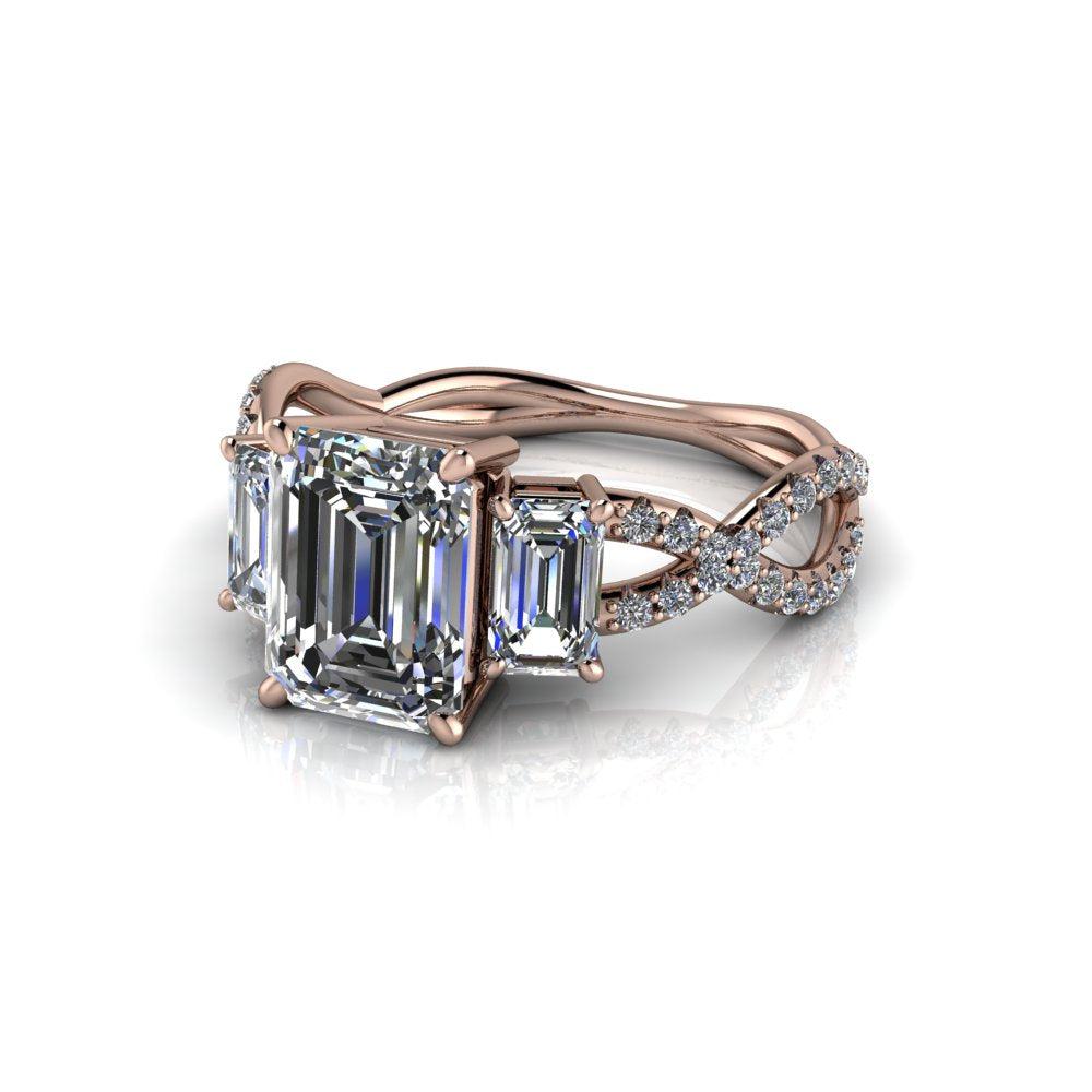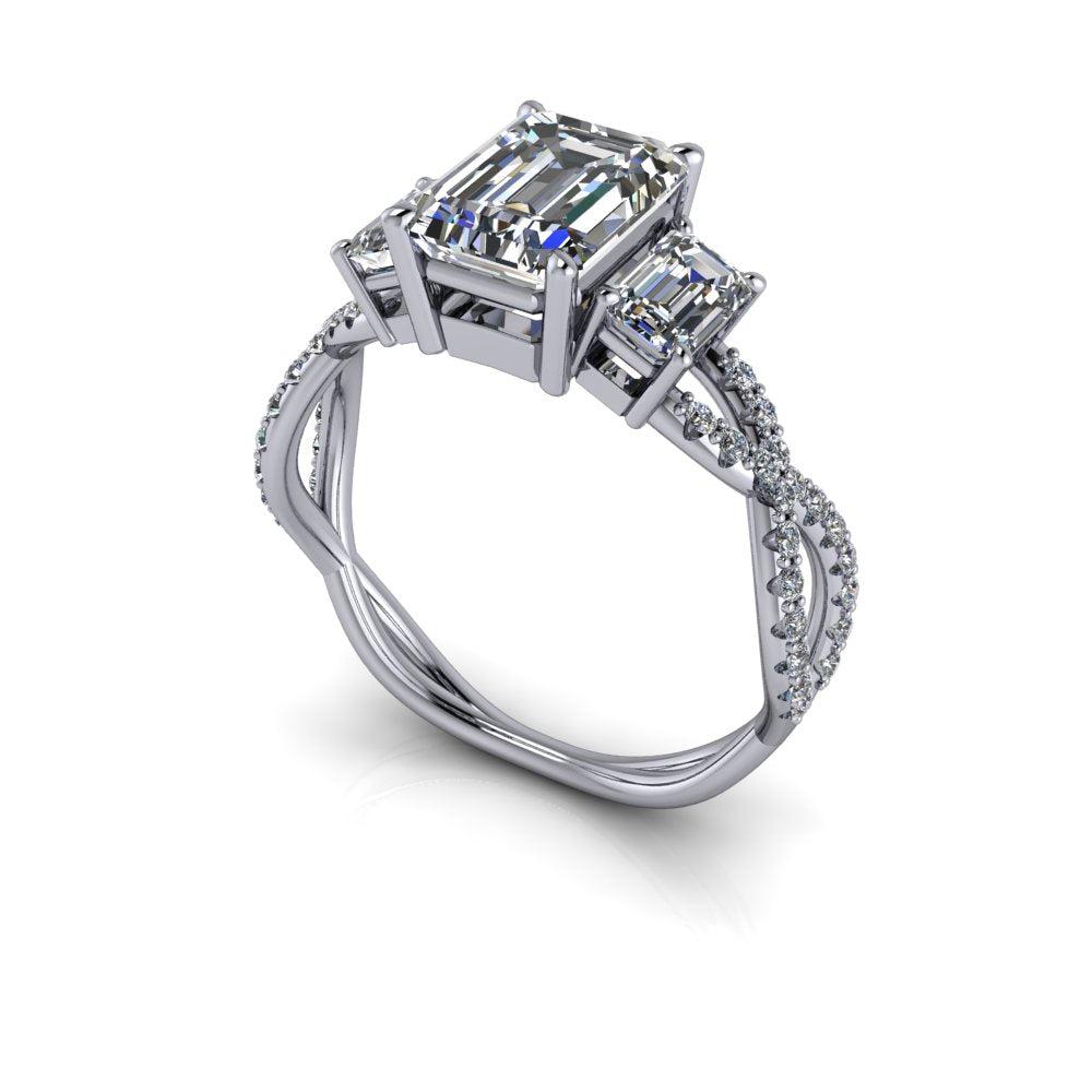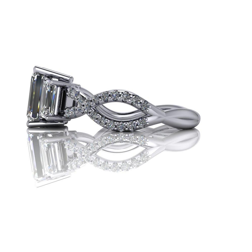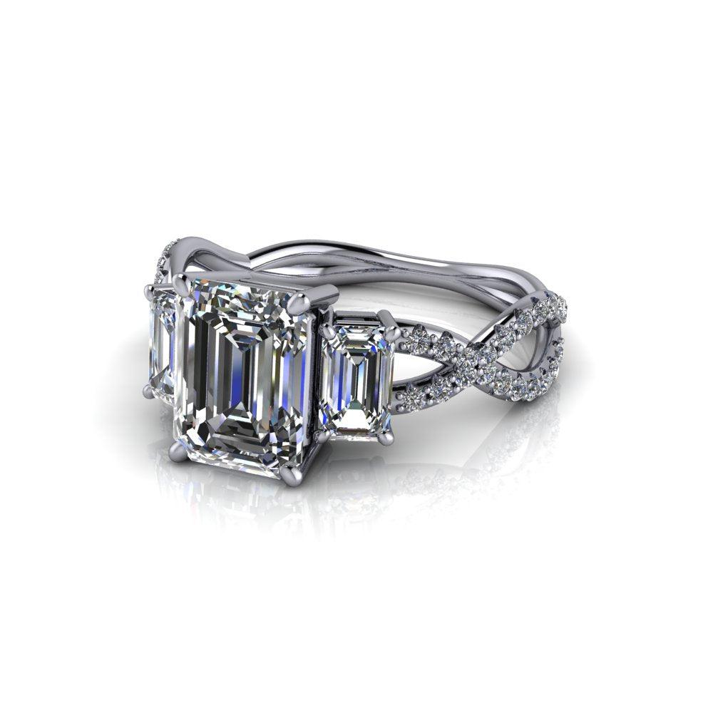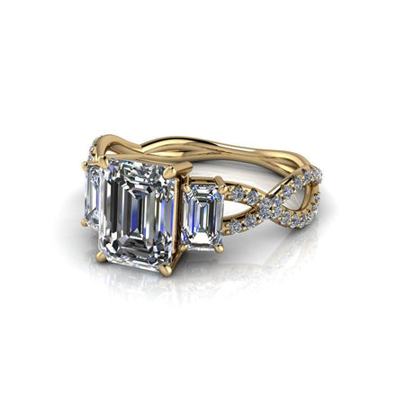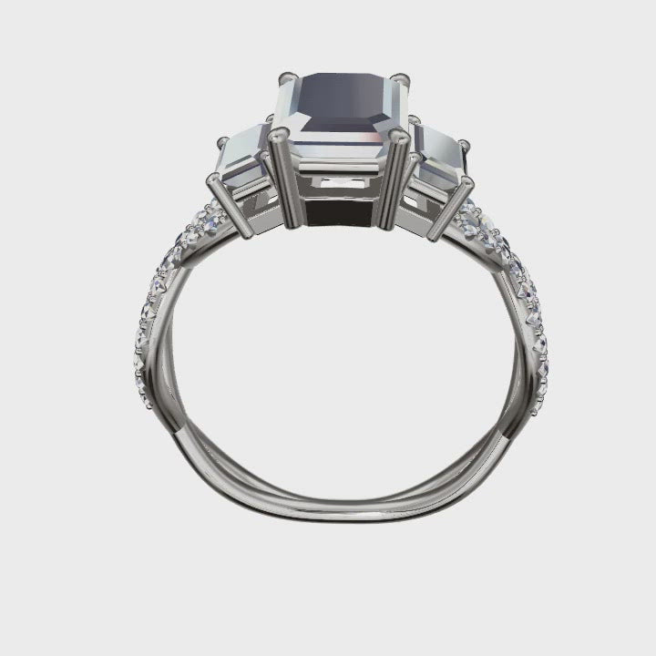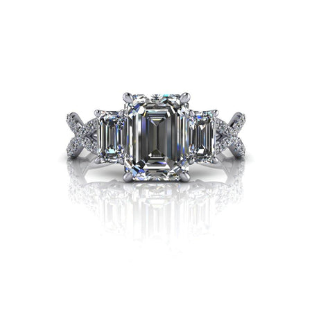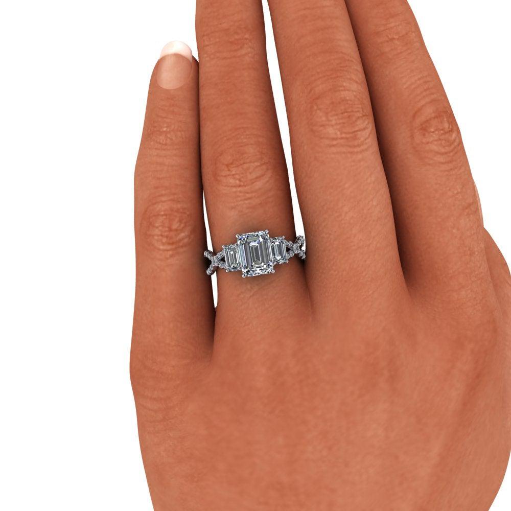Un anillo de compromiso de moissanita de talla esmeralda de tres piedras, perfecto para aniversario o compromiso.
