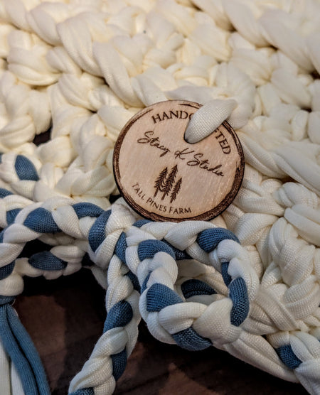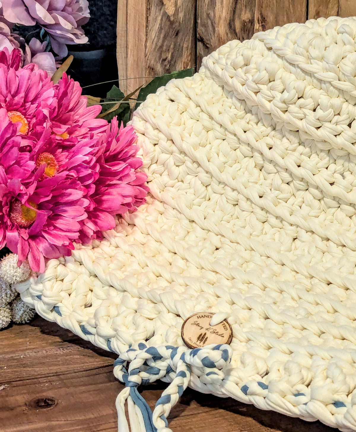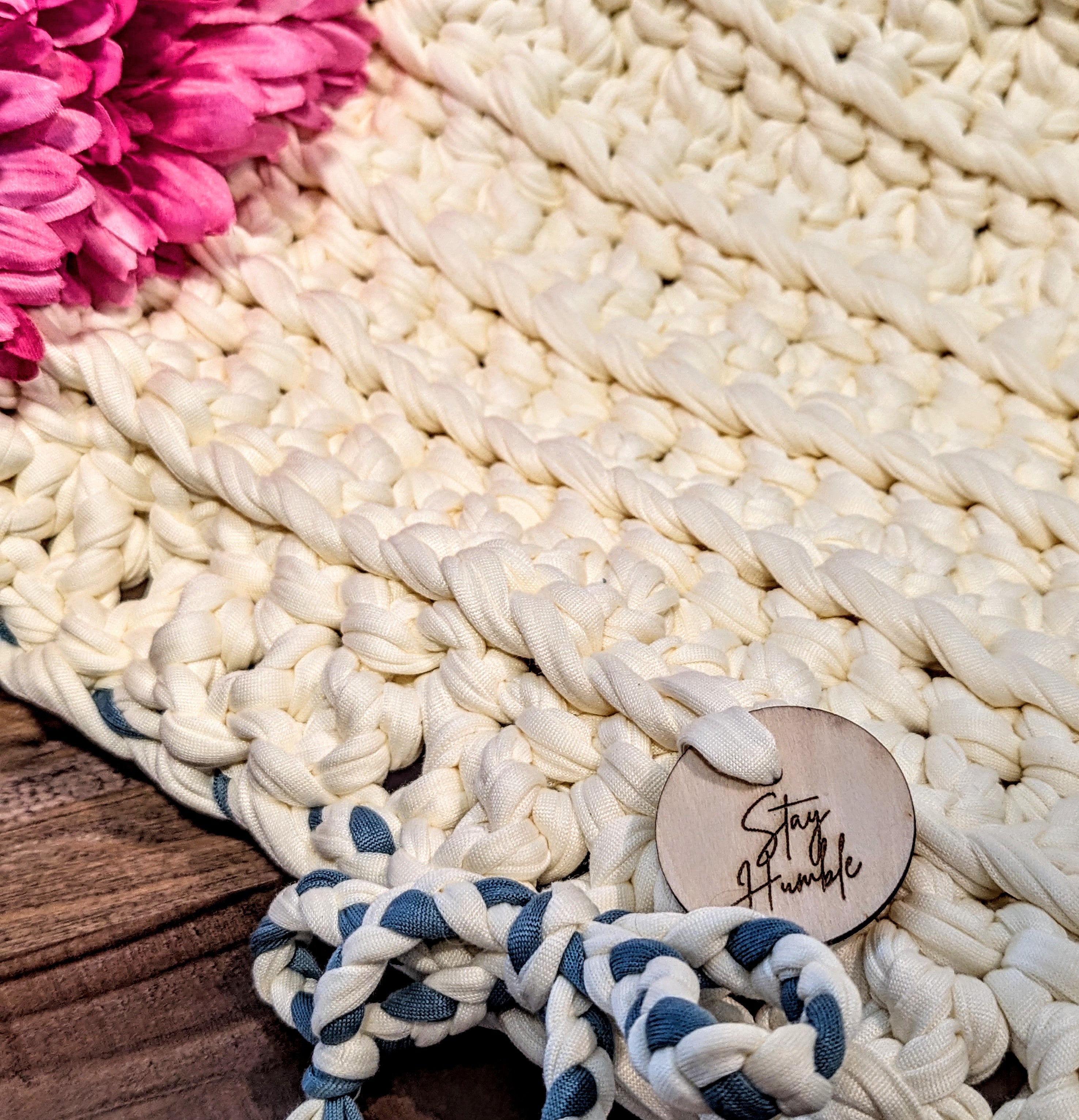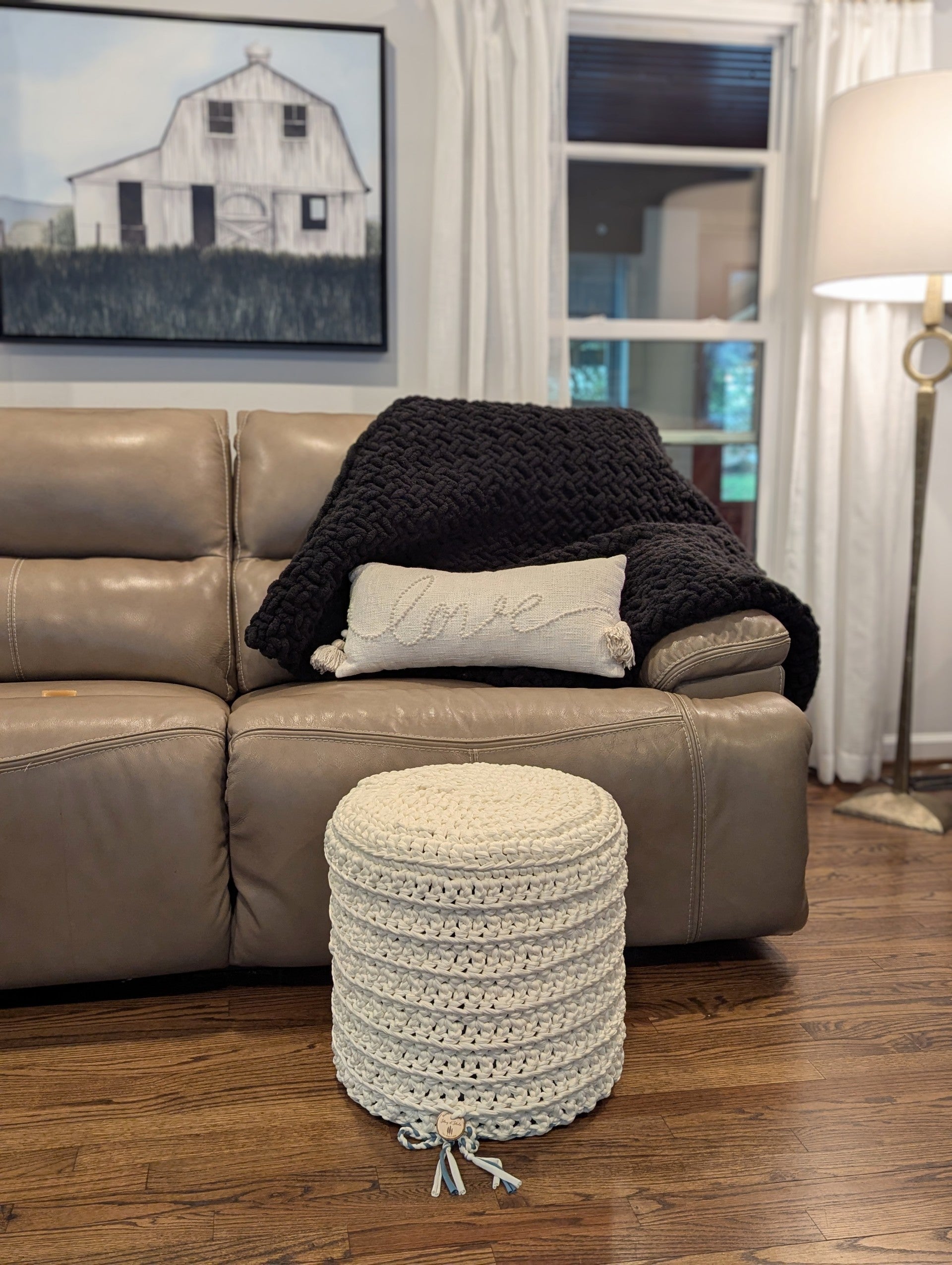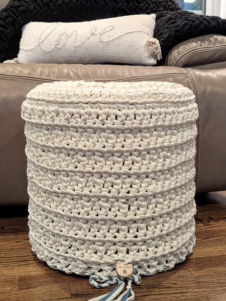Ready to ship farmhouse ottoman or vanity chair with an ivory color soft t-shirt yarn cover. The stool has floor protection and is stable. The heavy-duty handmade jersey cotton cover fits perfectly over the ottoman and is machine washable. The cover has a braided drawstring to make sure it stays snug around the bottom. Affirmation coin: Stay Humble.