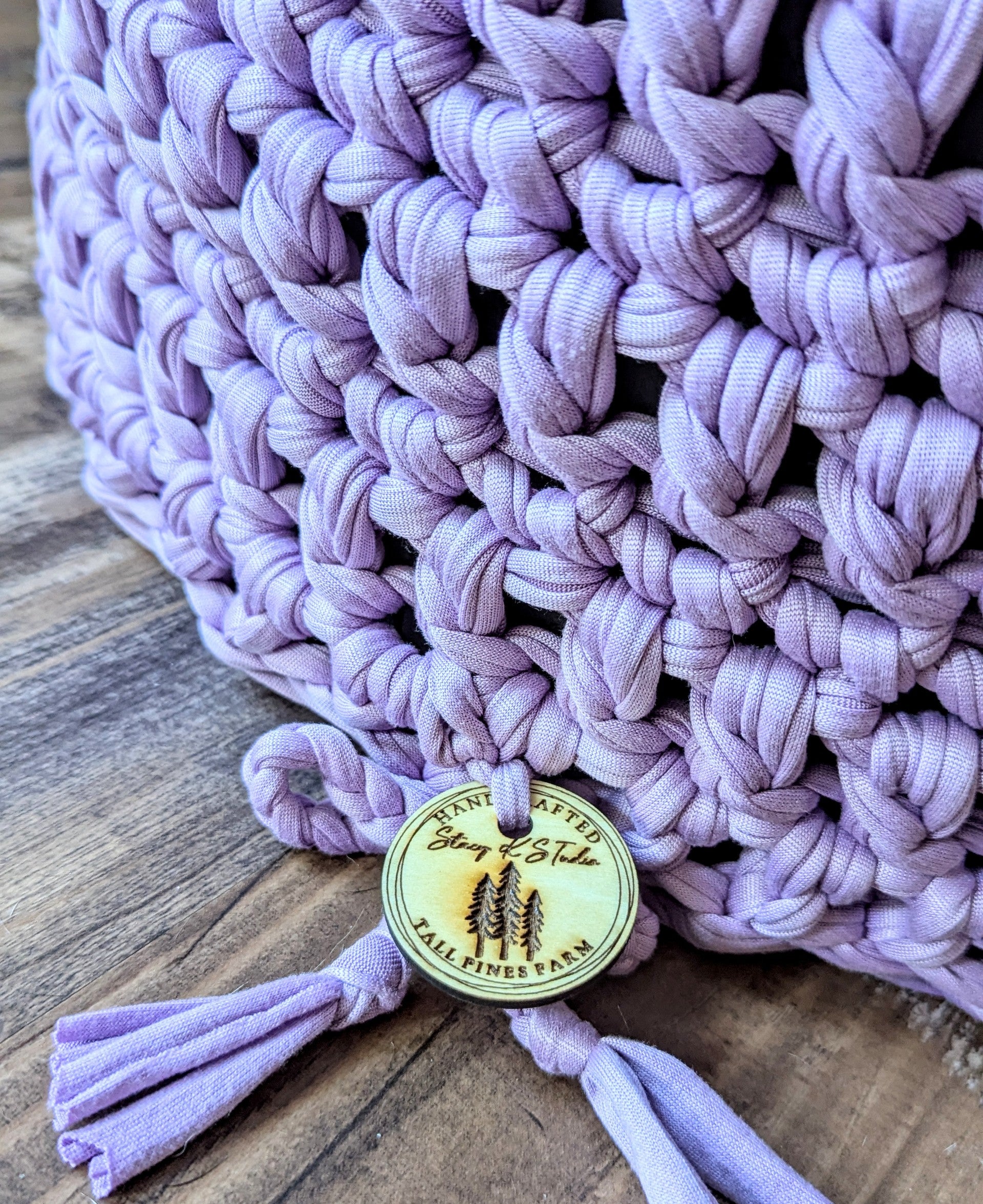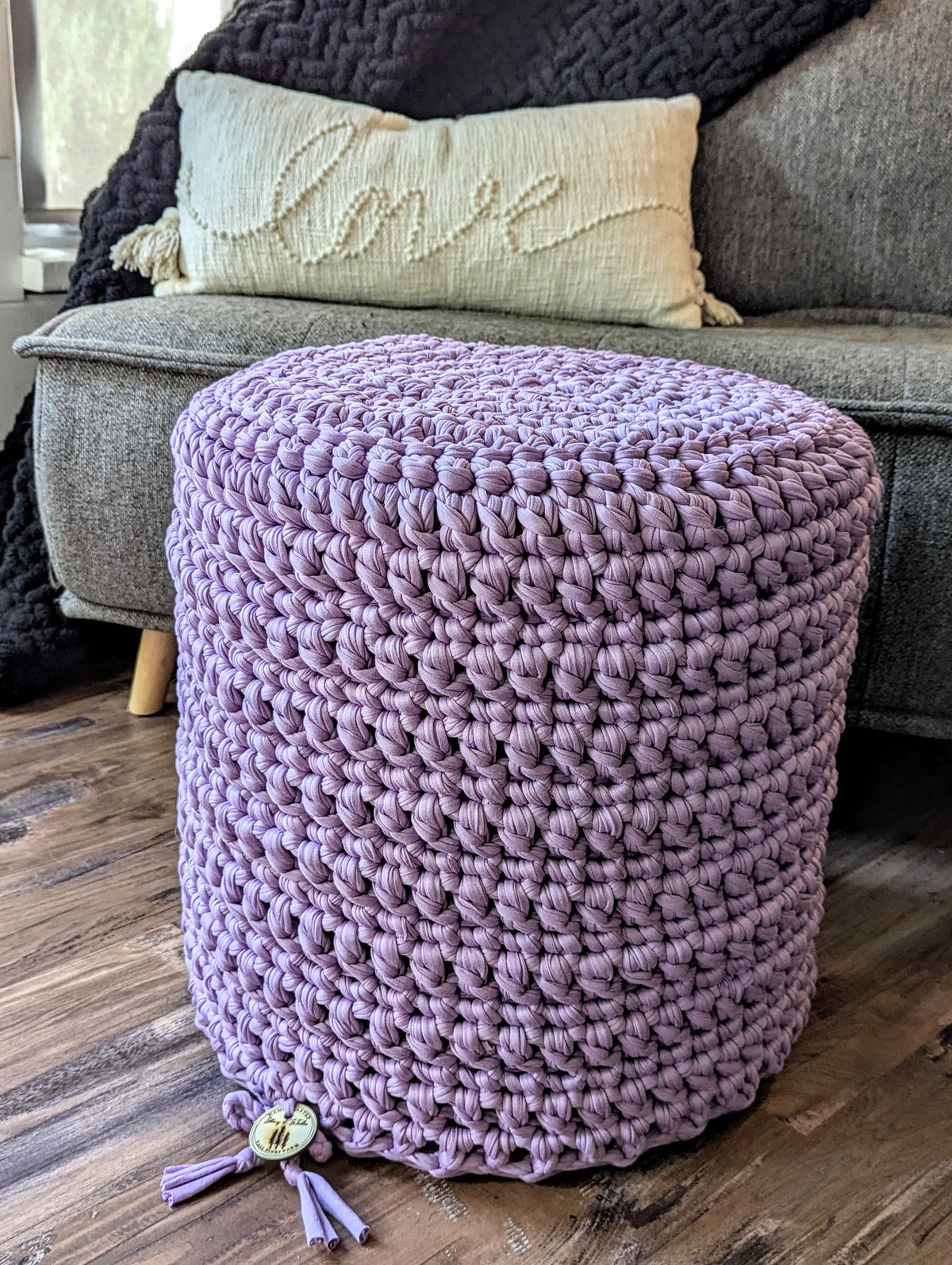 Ready to ship farmhouse ottoman, vanity chair, or Footrest with lavender soft t-shirt yarn cover. The stool has floor protection and is stable. The heavy-duty handmade jersey cotton cover fits perfectly over the ottoman and is machine washable. The cover has a braided drawstring to make sure it stays snug around the bottom.