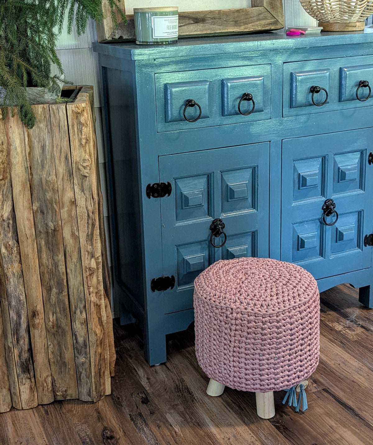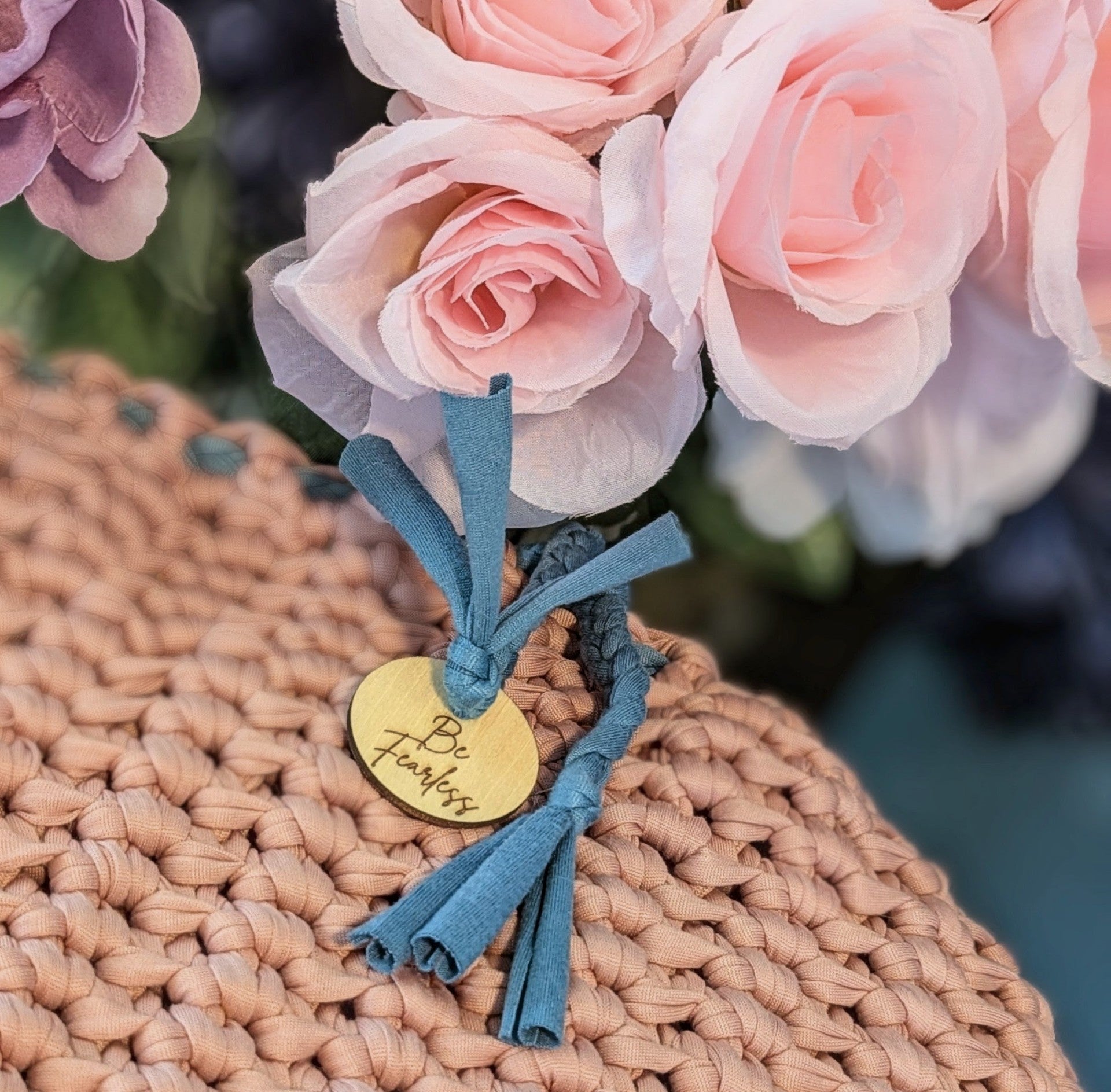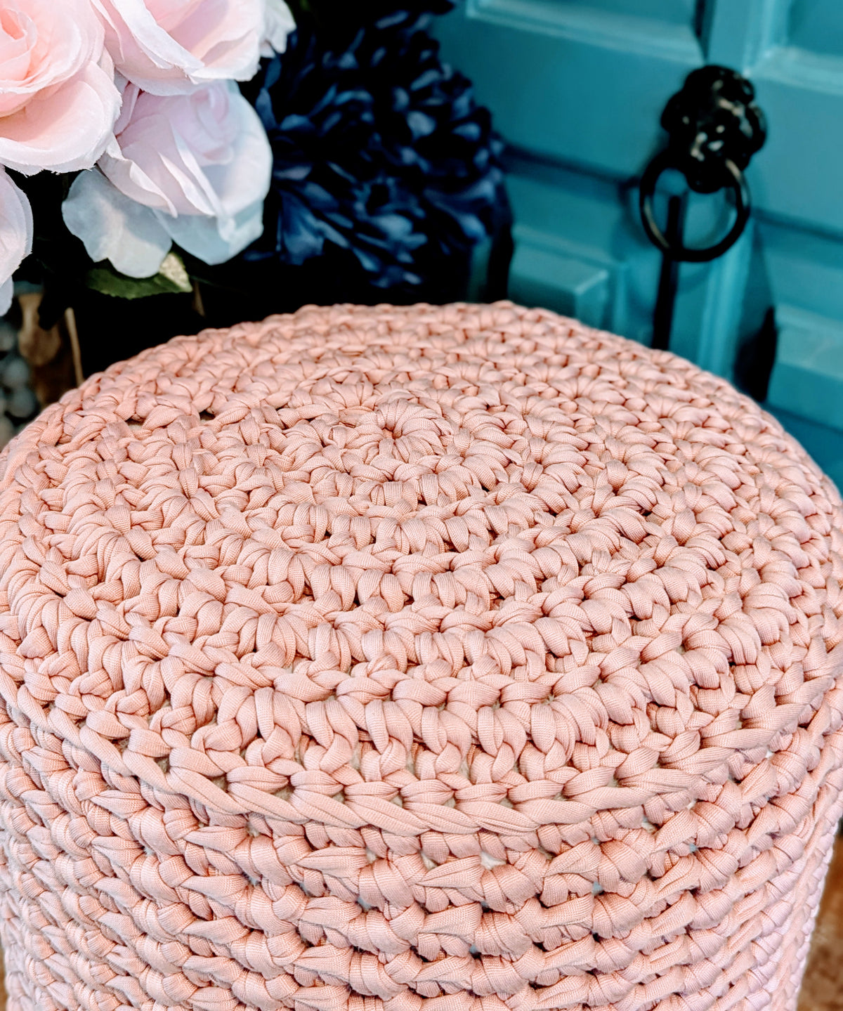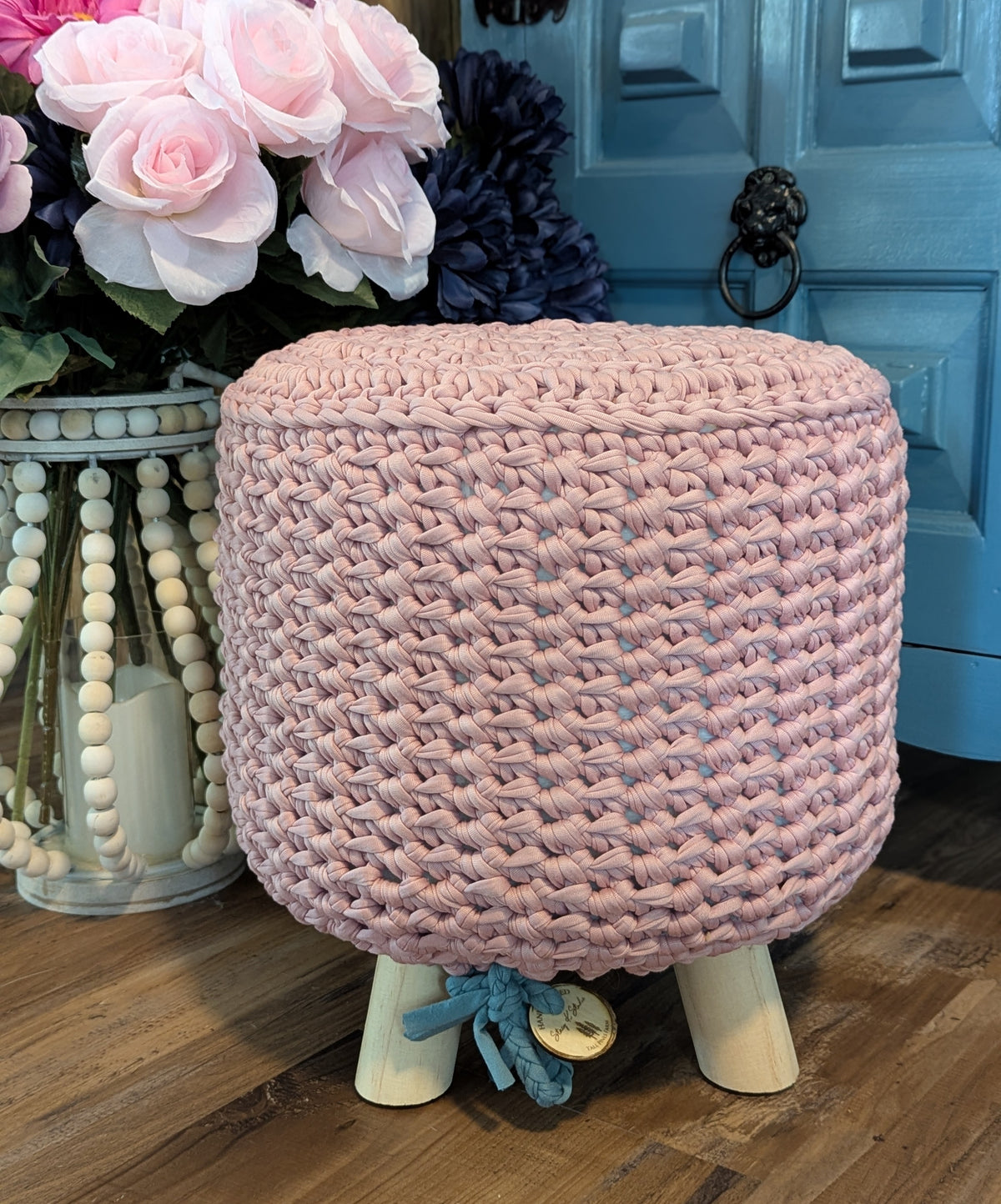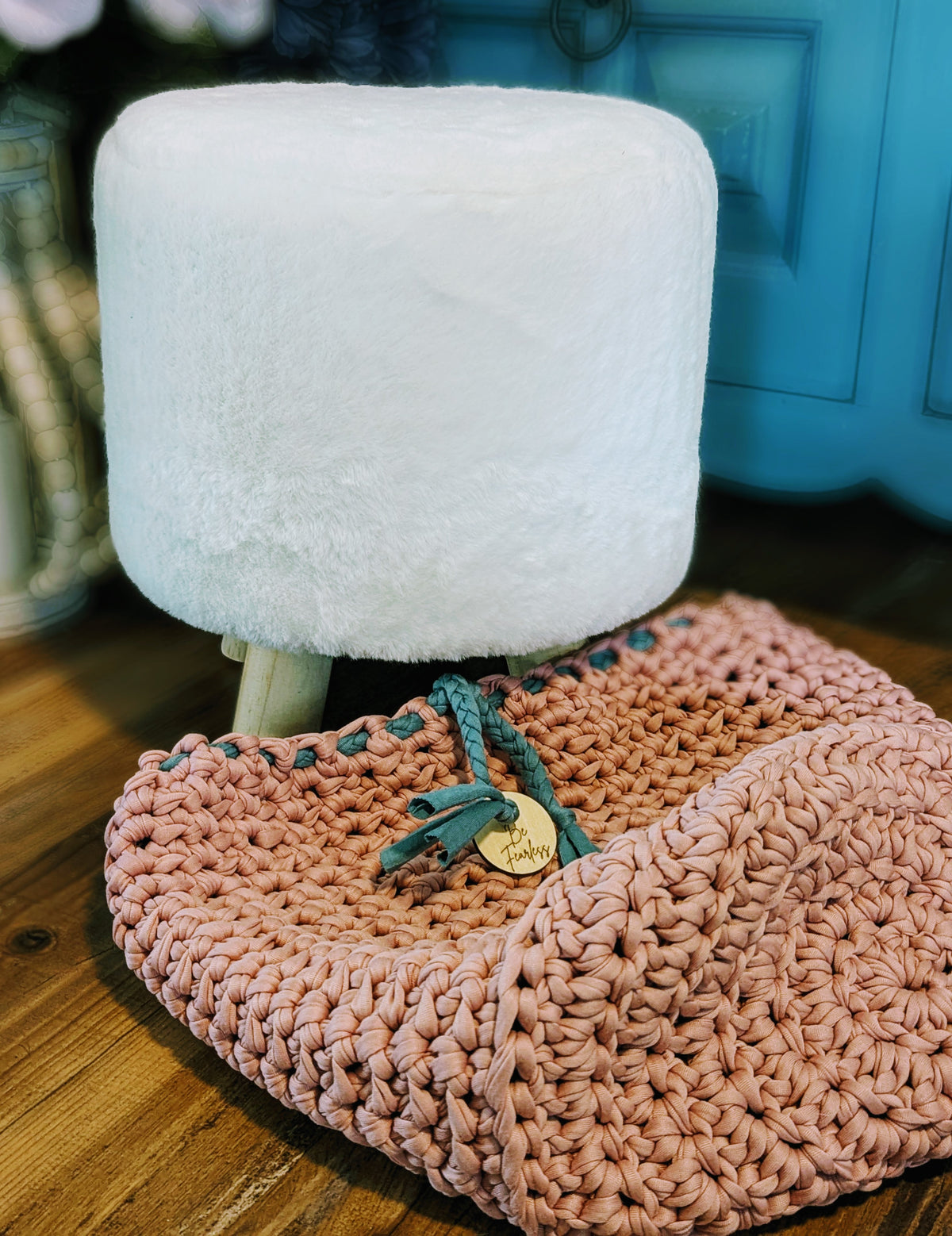 Ready to ship farmhouse ottoman with pink crochet cover, and affirmation coin, "Be Fearless" The stool has wood legs with floor protection. The handmade jersey cotton cover fits perfectly over the white fluffy stool and is machine washable. The cover has a braided drawstring to make sure it stays snug around the bottom.