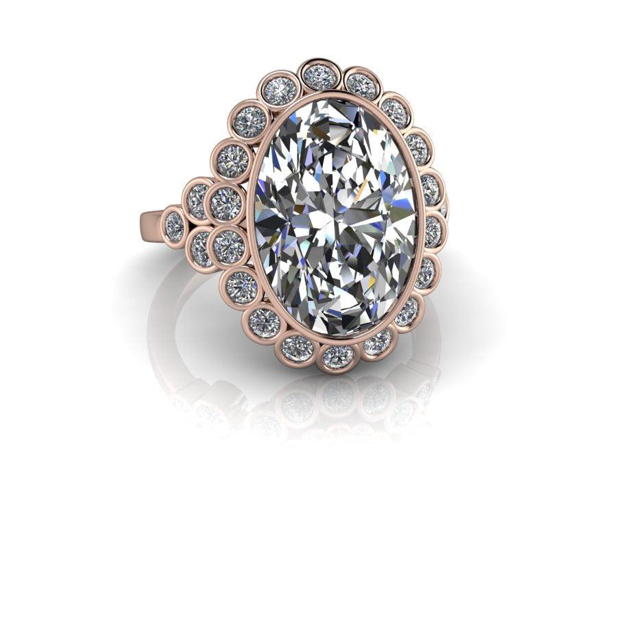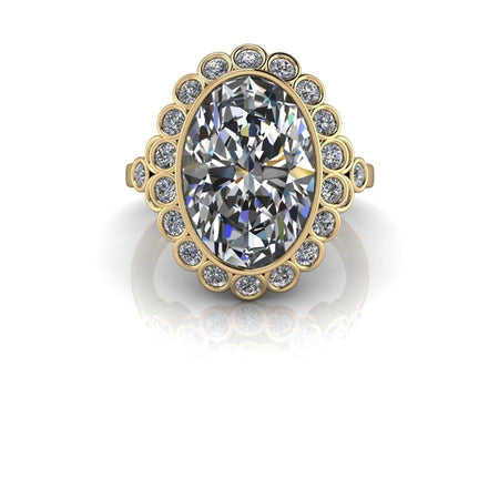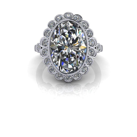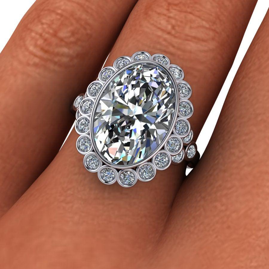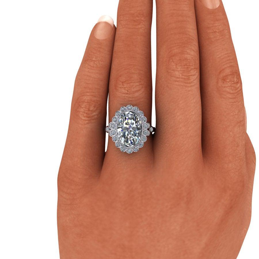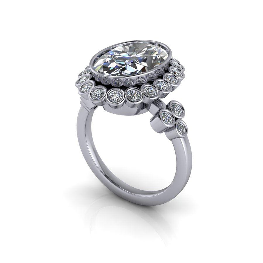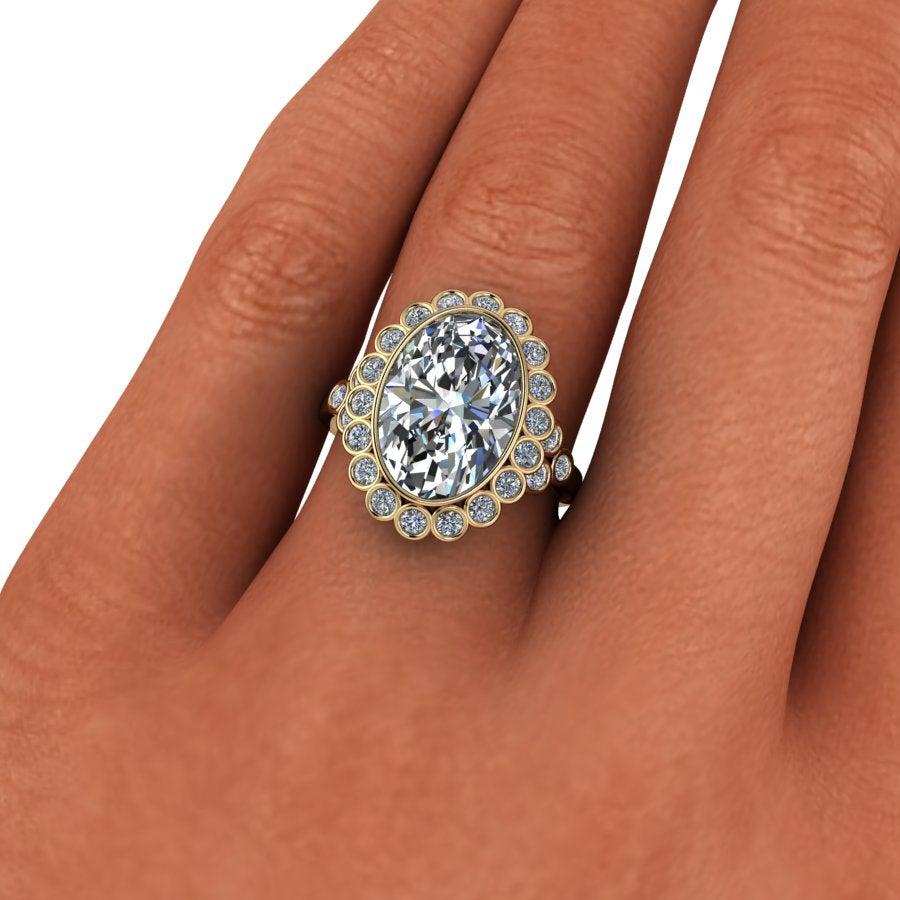 Anillo de compromiso con engaste de bisel ovalado rodeado por un halo engastado en bisel.
