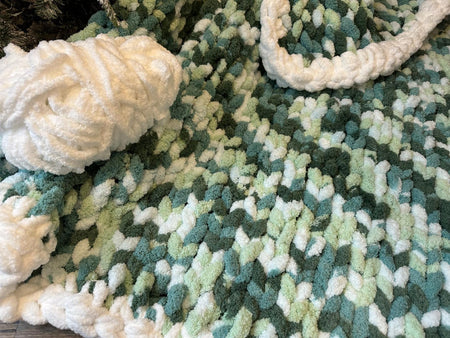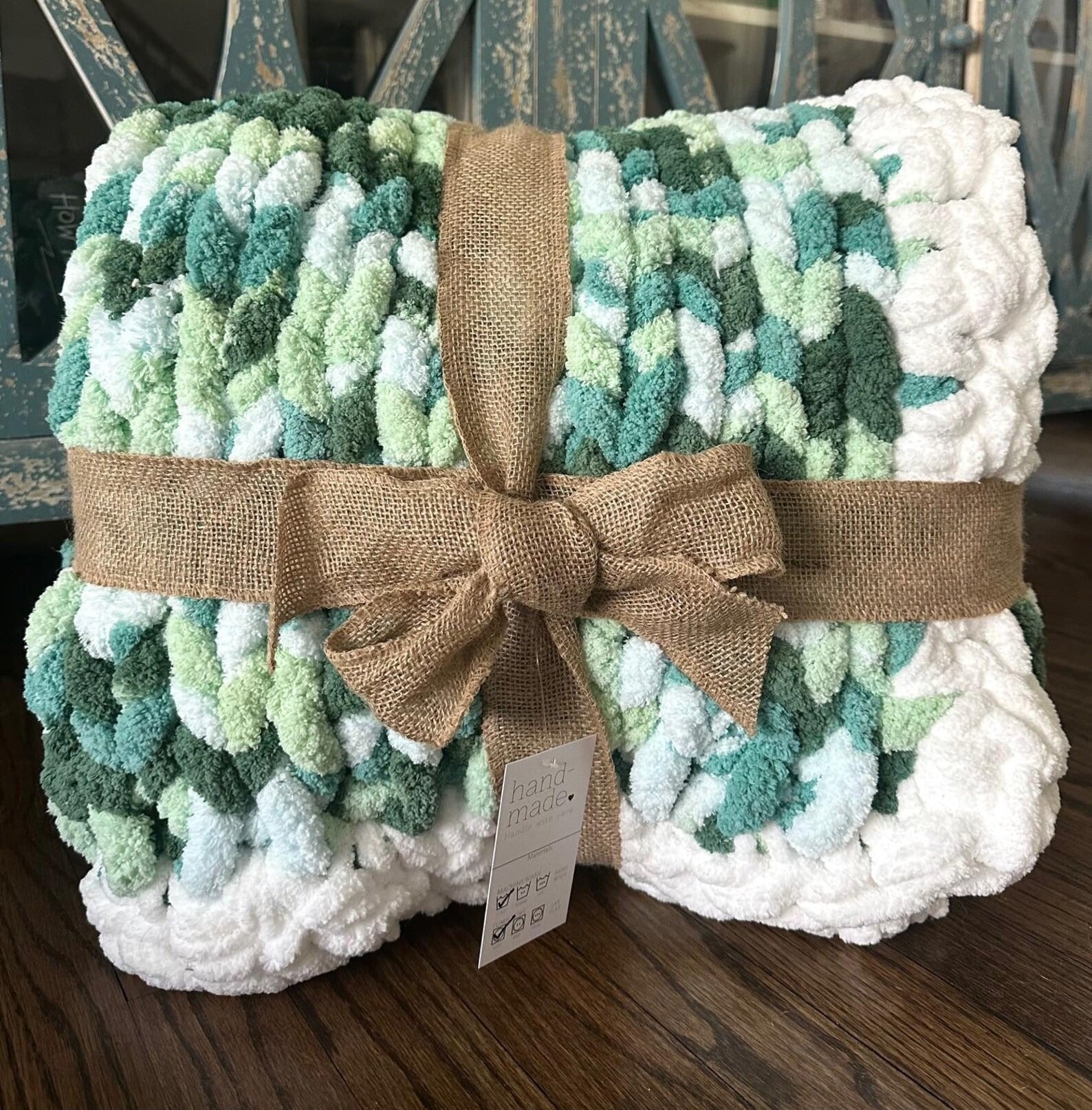 The one-of-a kind hand knit Chunky Blanket is perfect for snuggling up with a loved one. It is knit and crocheted in a jumbo heavy weight yarn.