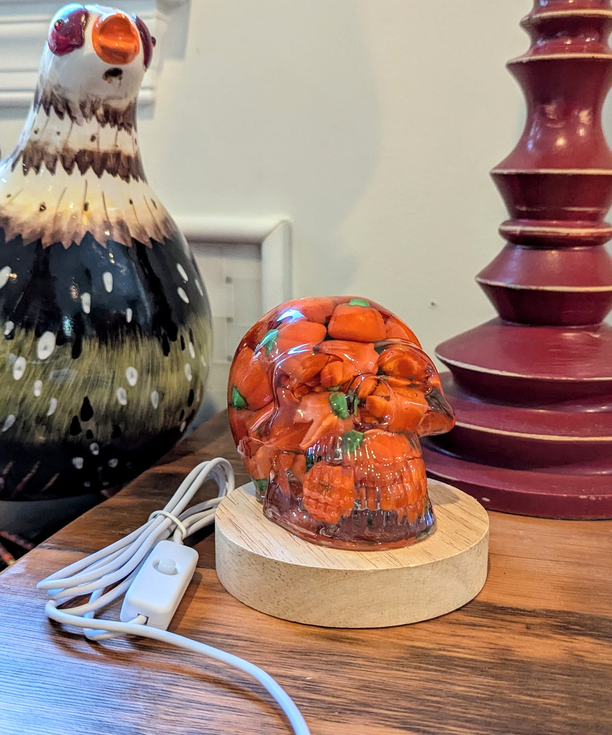 Light up Skully, filled with Halloween pumpkins. Perfect for kids room or for Halloween decor. USB plug-in, on off switch. Wood Base.