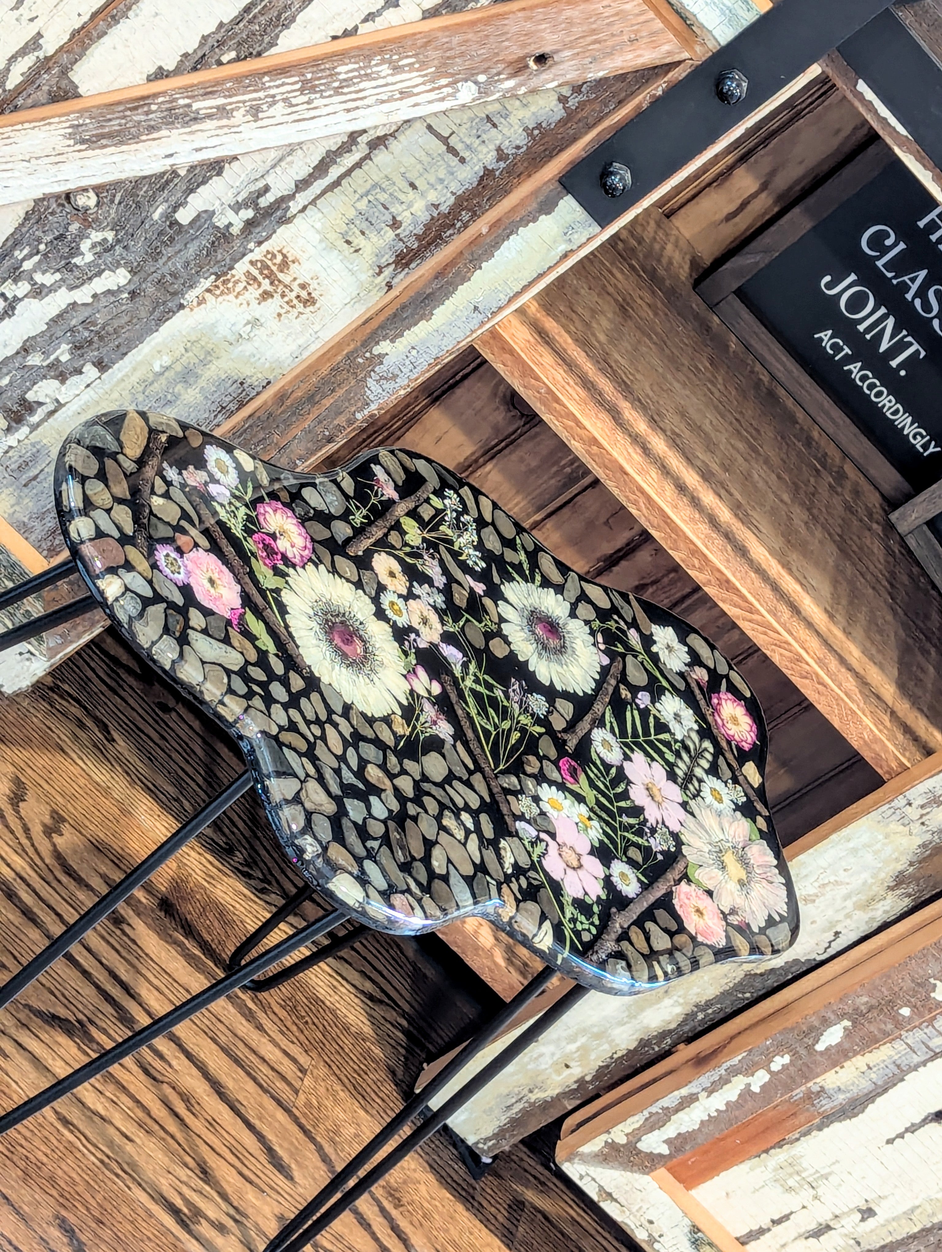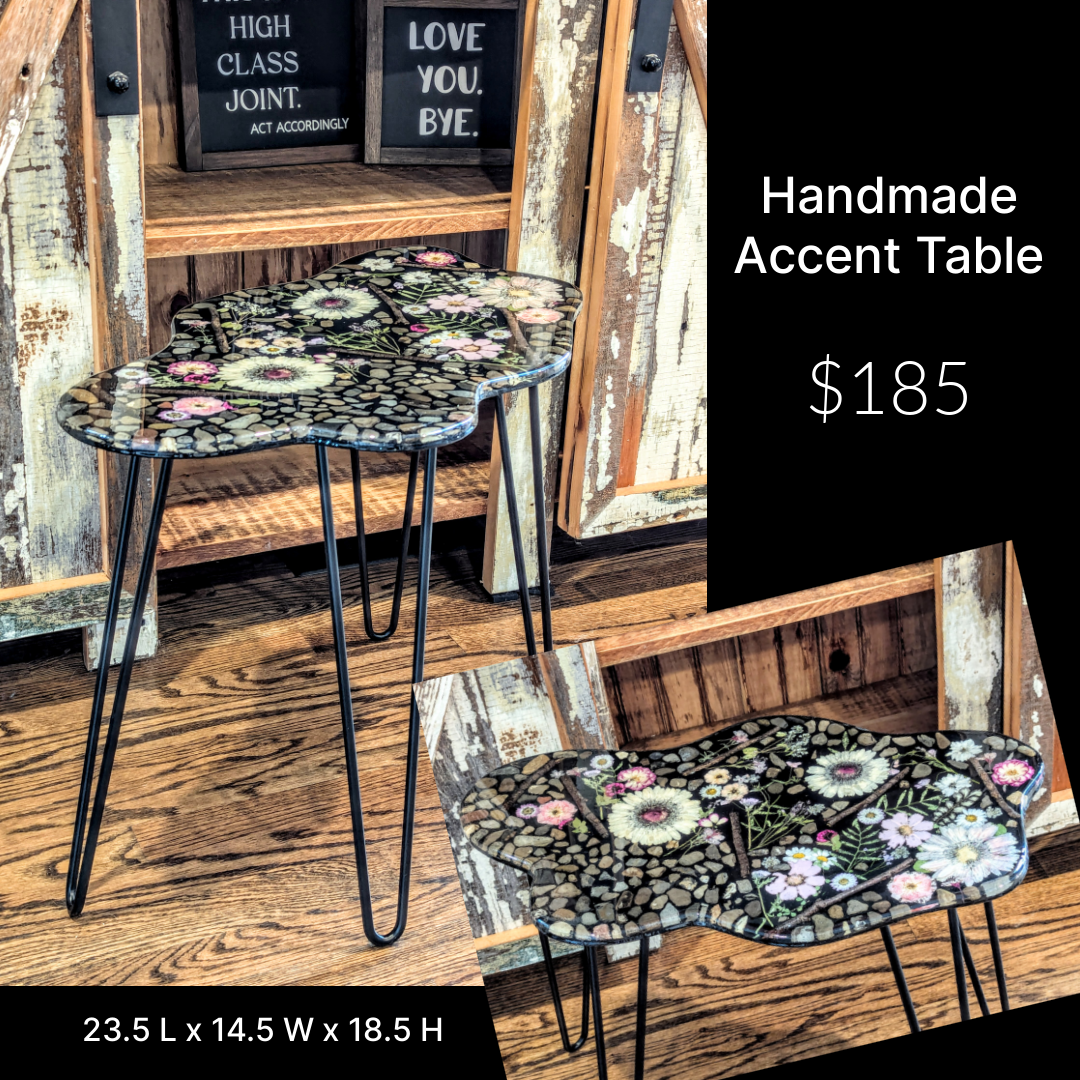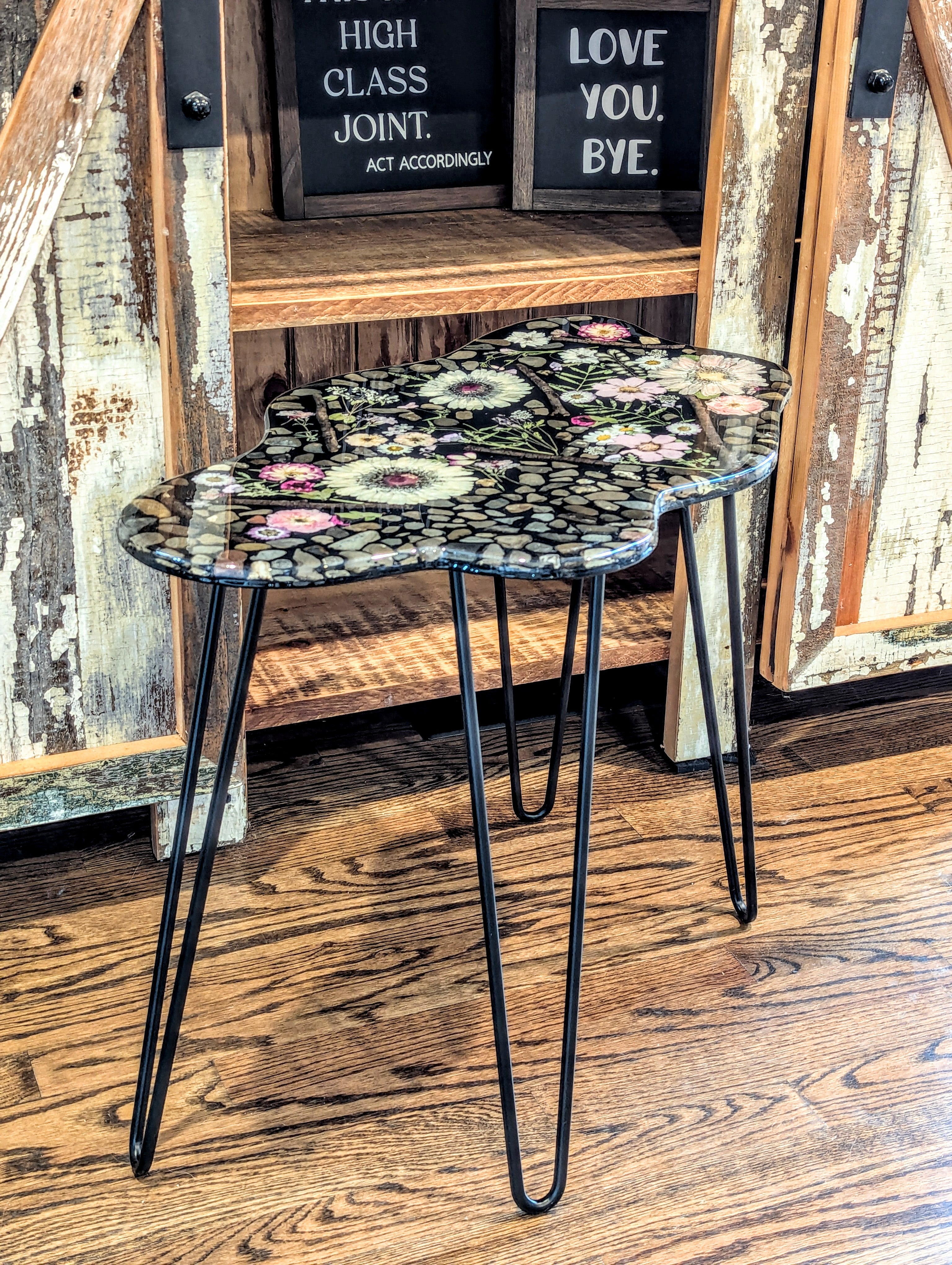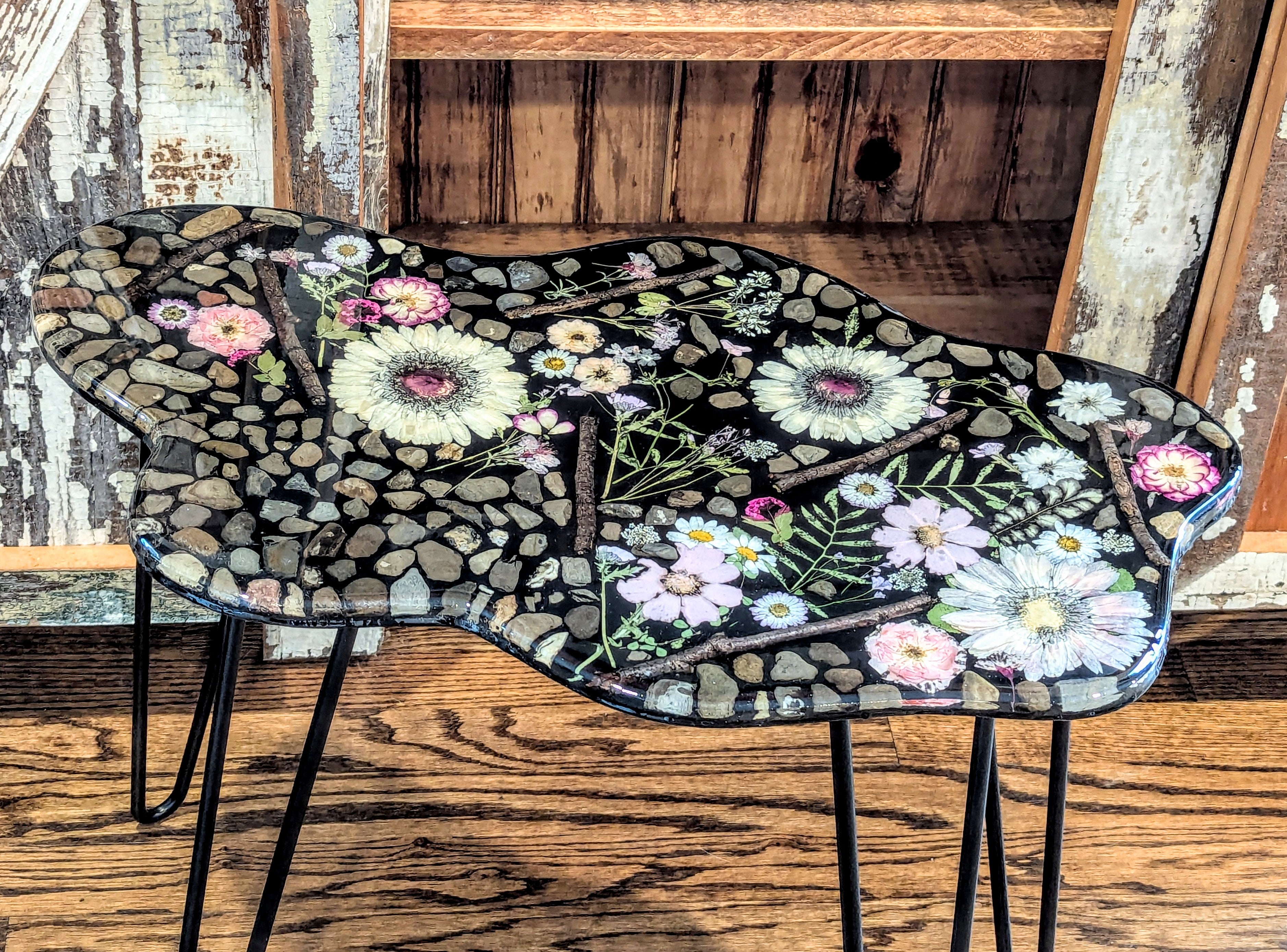 This gorgeous hand poured resin table is filled with beautiful dried flowers, and natural elements. The table features wrought irons legs with floor protection.