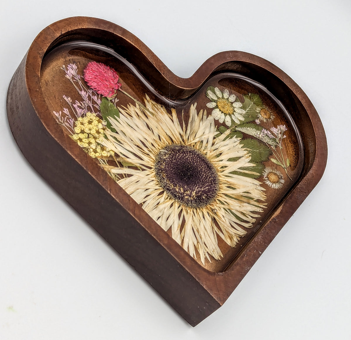 This Jewelry Dish is perfect for your nightstand or dresser. A wood heart with carefully placed dried flowers preserved under crystal clear resin leaving them protected and preserved.Â