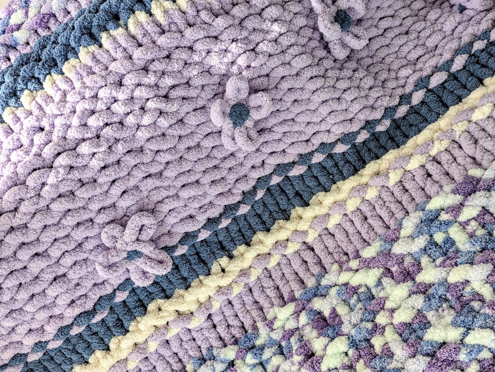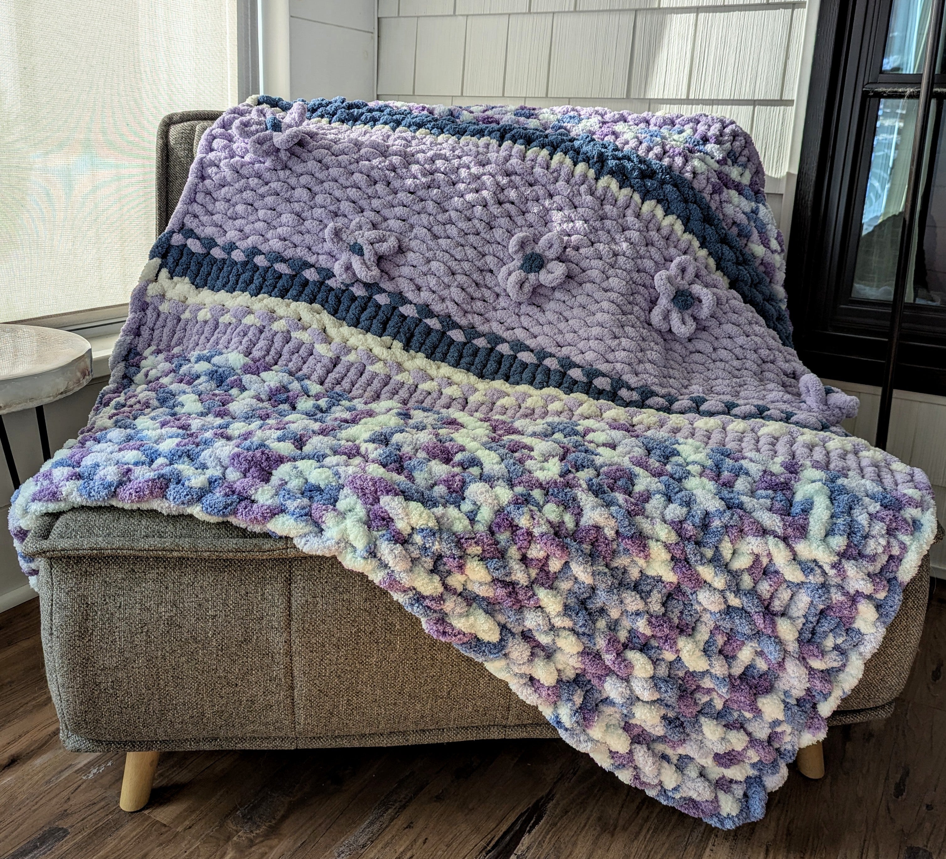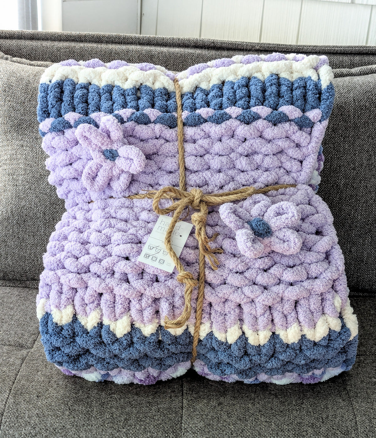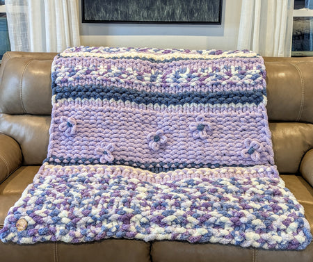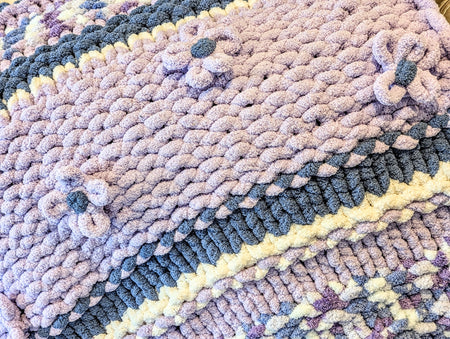 The one-of-a kind hand knit Oversized Chunky Blanket is perfect for snuggling up on a chilly day. It is crafted in 100% Bernat Jumbo Chunky Yarn.
