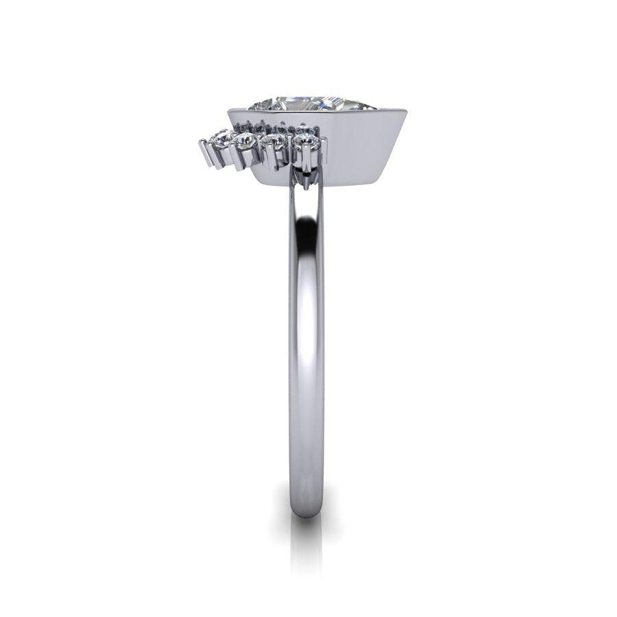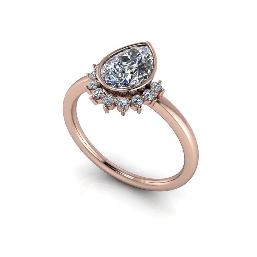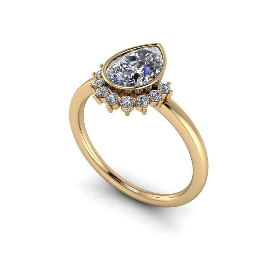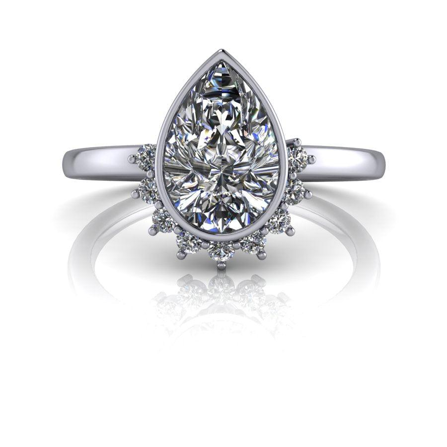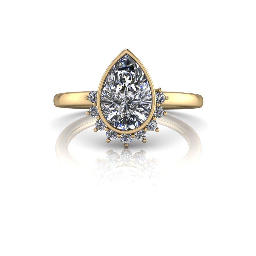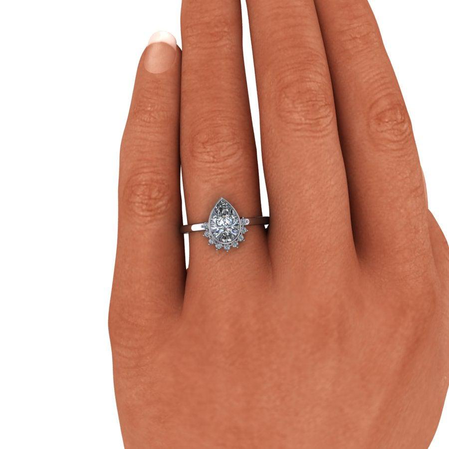 Elaborado por expertos, el anillo de compromiso de moissanita Sunny No.1 presenta una brillante piedra de moissanita en forma de pera en engaste de bisel rodeada por un cautivador halo solar. Con un diseño único y una calidad excepcional, este anillo seguramente capturará el corazón de su ser querido.