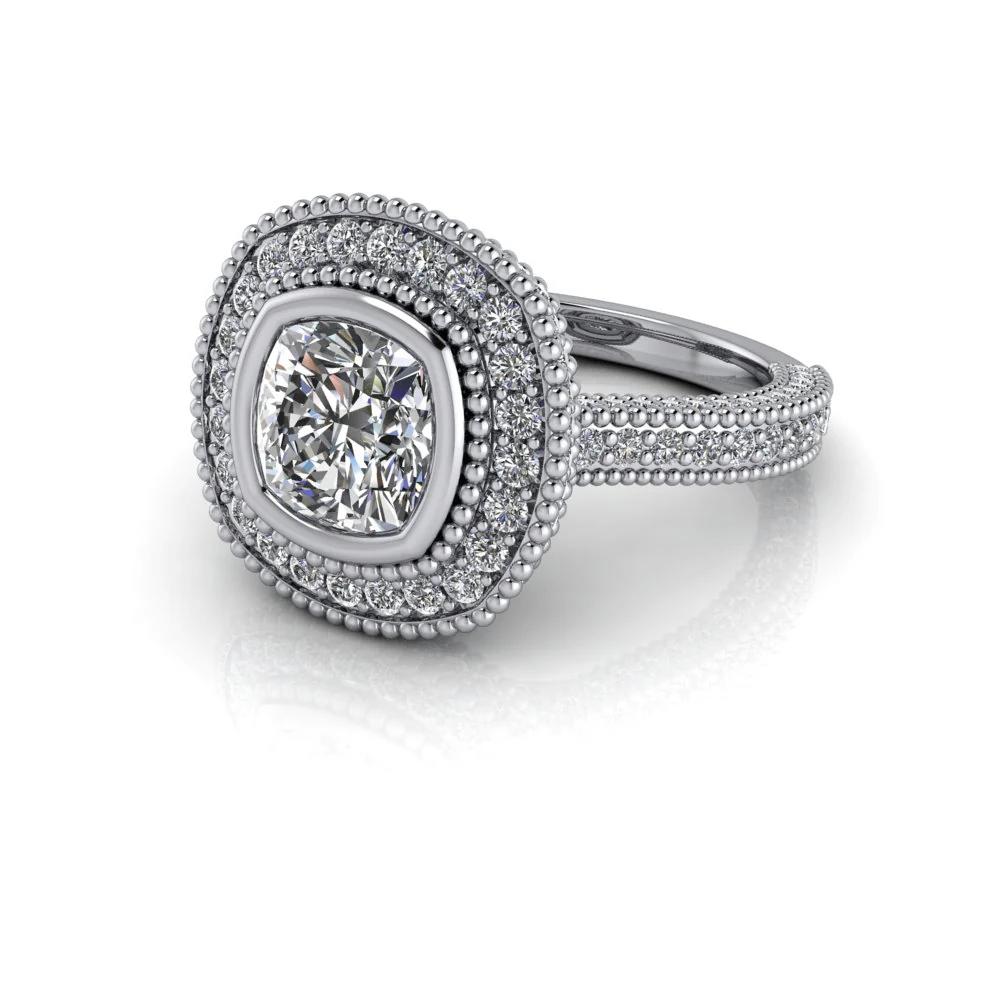 The halo engagement ring is set with an IGI certified 1.75 ct. cushion cut lab grown diamond, G Color, SI1 Clarity.