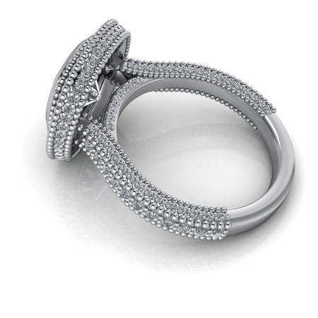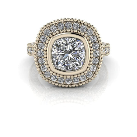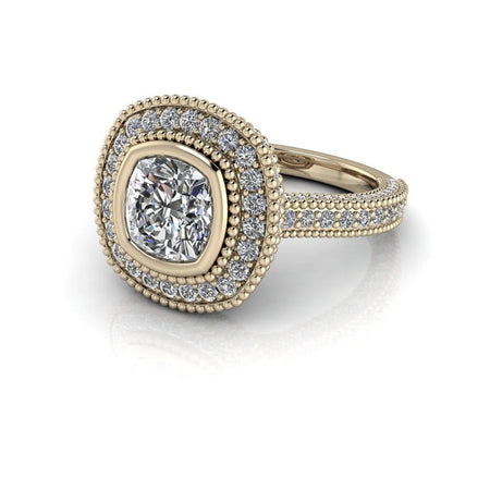 Expertly crafted with a cushion cut diamond, the Angel No. 1 lab grown diamond ring exudes a timeless elegance. Its diamond halo cathedral setting enhances the center stone, making it a stunning choice for an engagement ring.