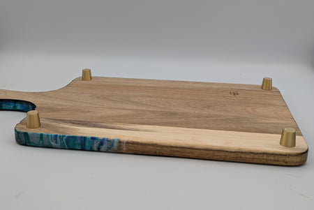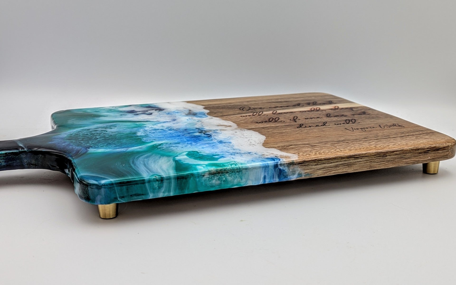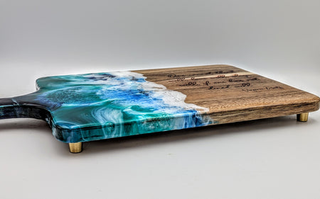 Natural Wood. Hand poured epoxy ocean waves. Board has full coverage resin and wrapped sides for longevity.
