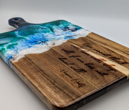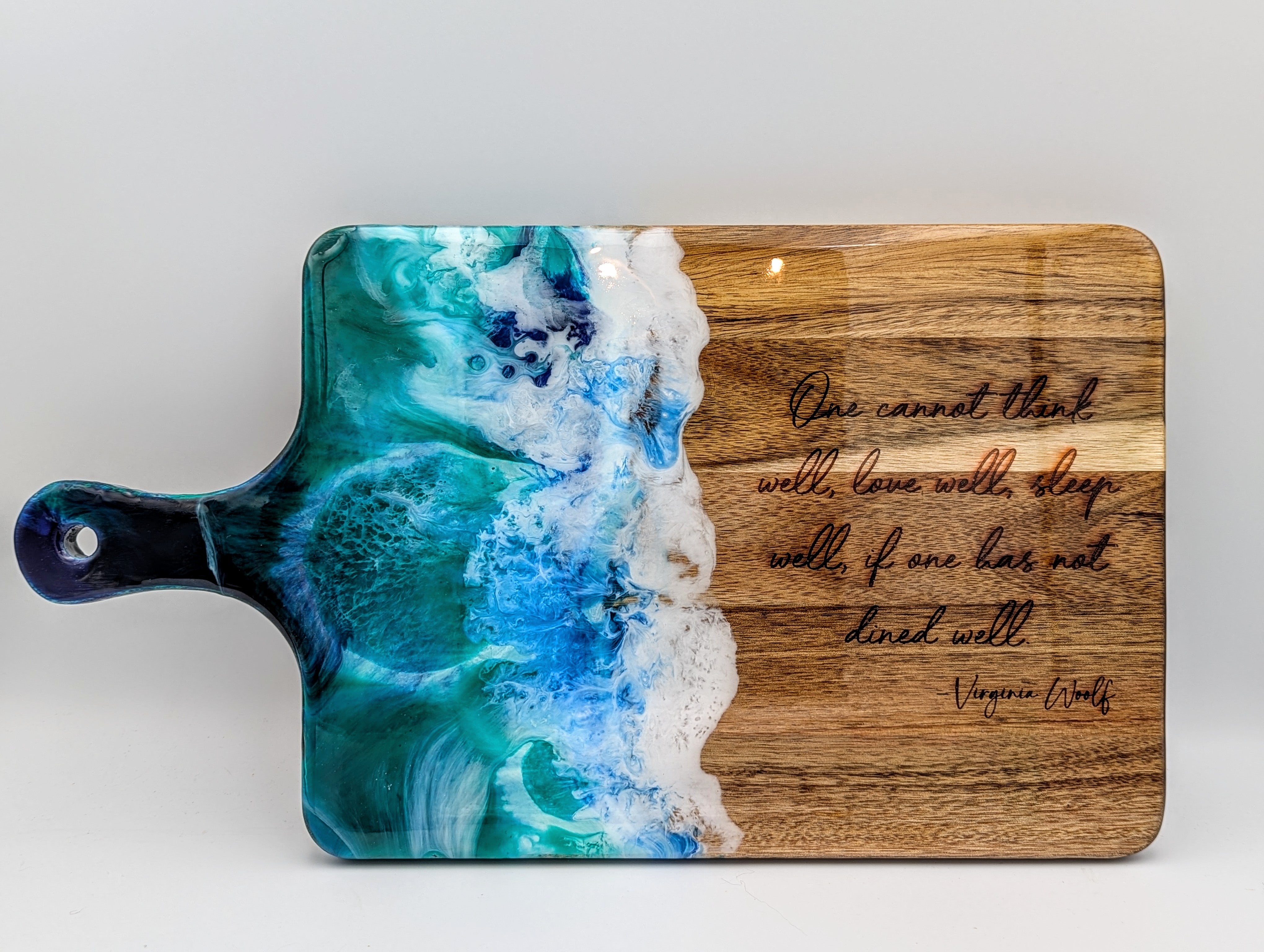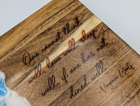 Handcrafted Wood Charcuterie Board for snacks. A fantastic holiday housewarming gift! Engraved with a Virginia Woolf Quote, "One cannot think well, love well, sleep well, if one has not dined well."