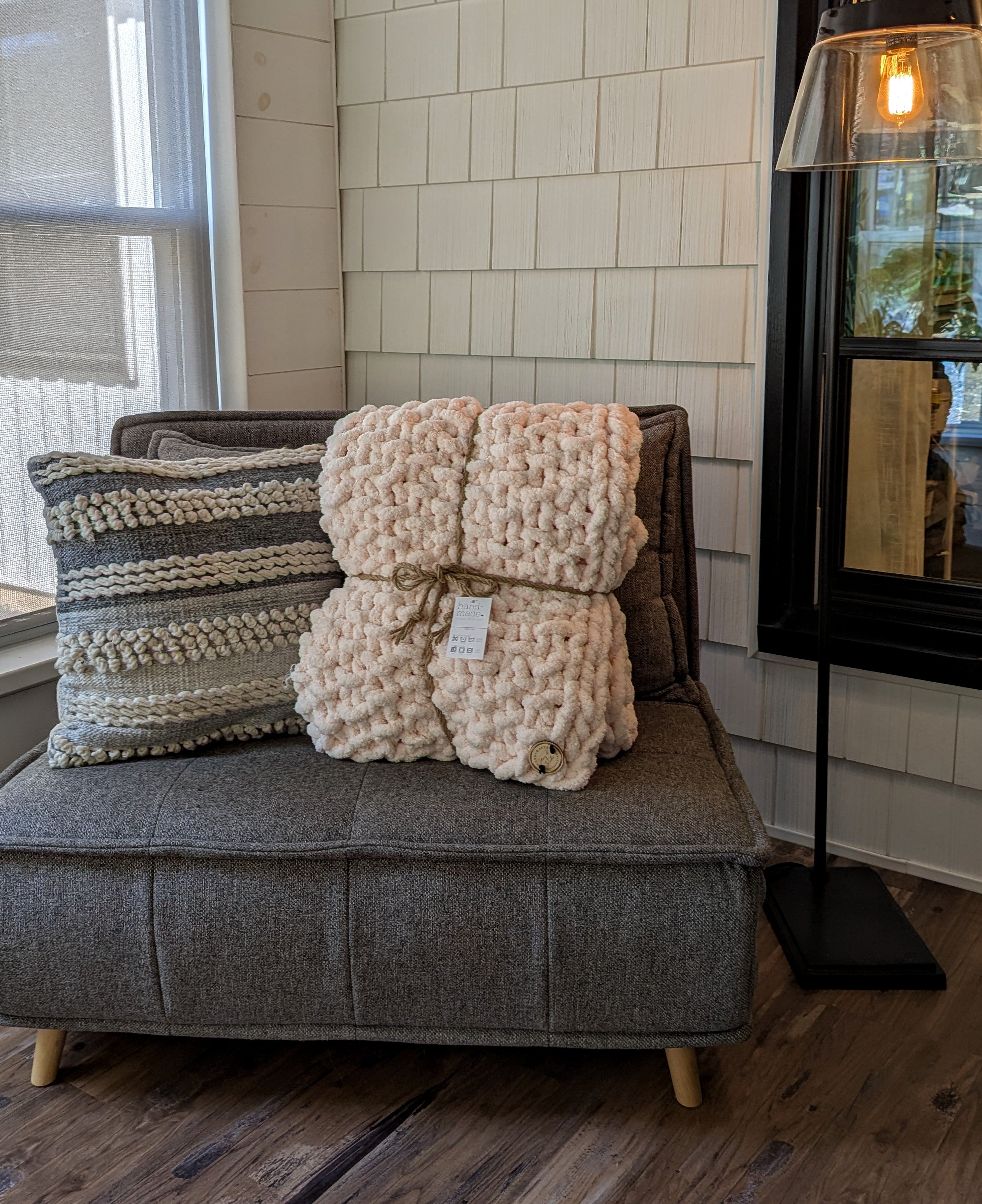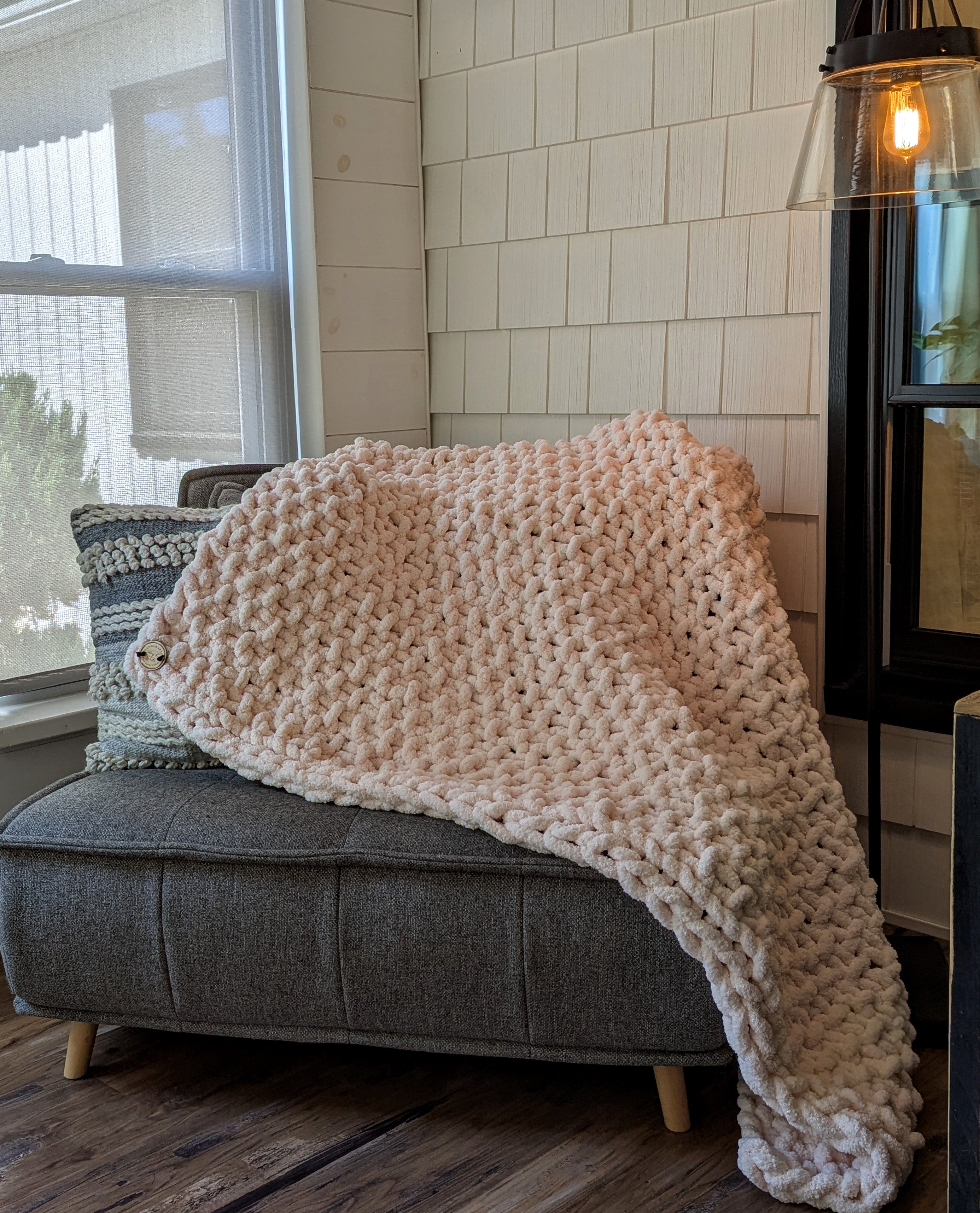 This handmade chunky thrown blanket is knit in a heavyweight jumbo yarn making it perfect for staying warm or to be used as a weighted blanket.
