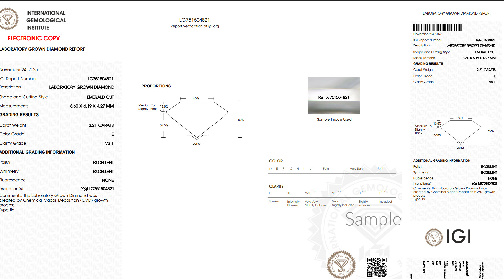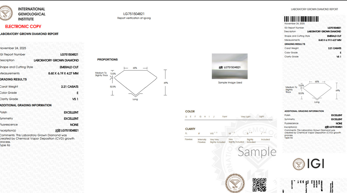 The lab grown diamond ring is set with an IGI Certified emerald cut lab grown diamond, 2.20 ct. F Color, VS1 clarity.