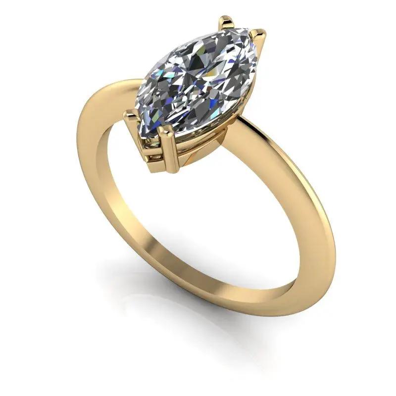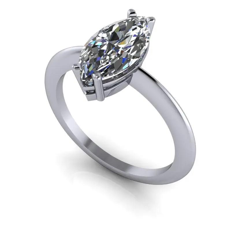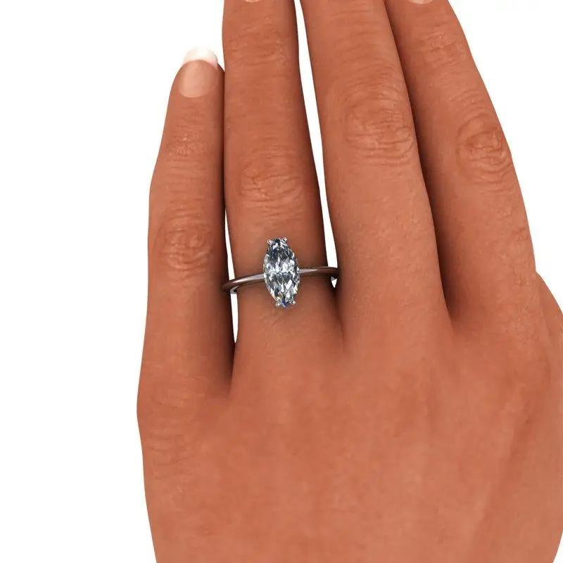 Bague de fiançailles moissanite incolore taille marquise présentée avec une moissanite de 12x6 mm, 1,80 ct. Largeur de bande de bague de fiançailles 1,6 mm.