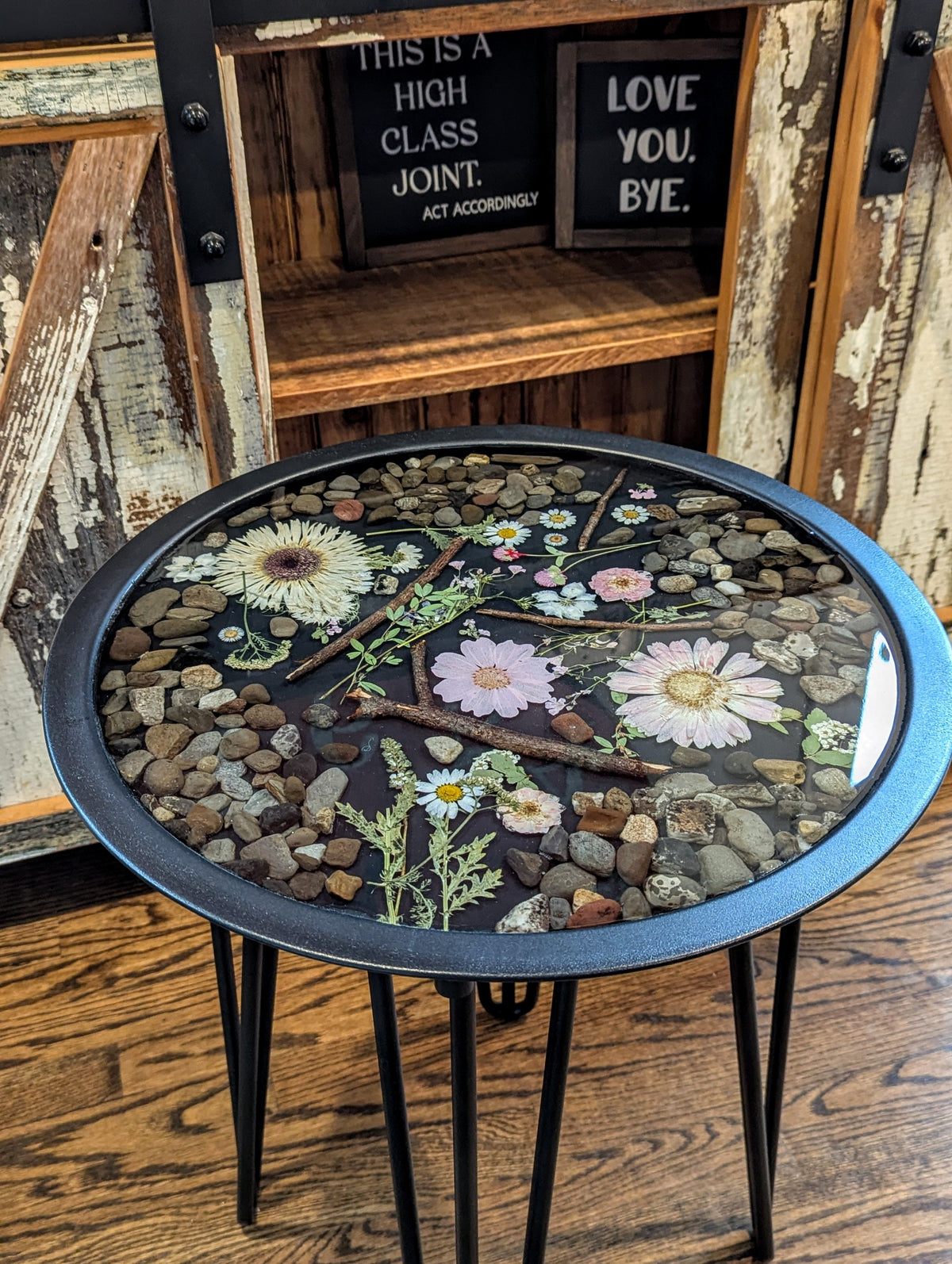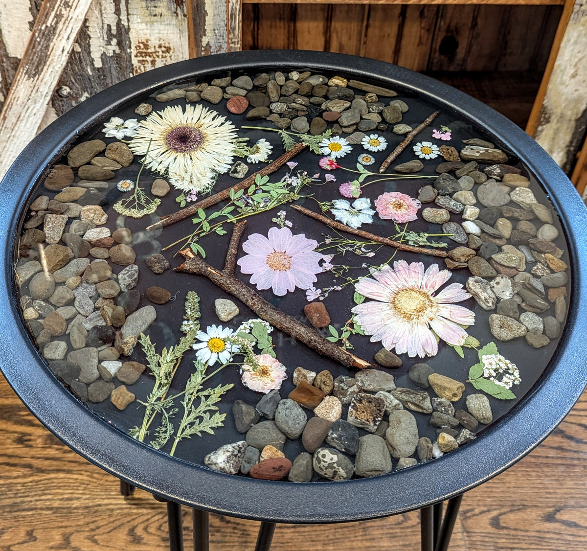 This gorgeous hand poured round resin table is filled with beautiful dried flowers, and natural elements. The table features wrought irons legs with floor protection.
