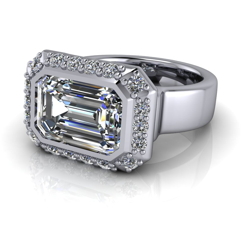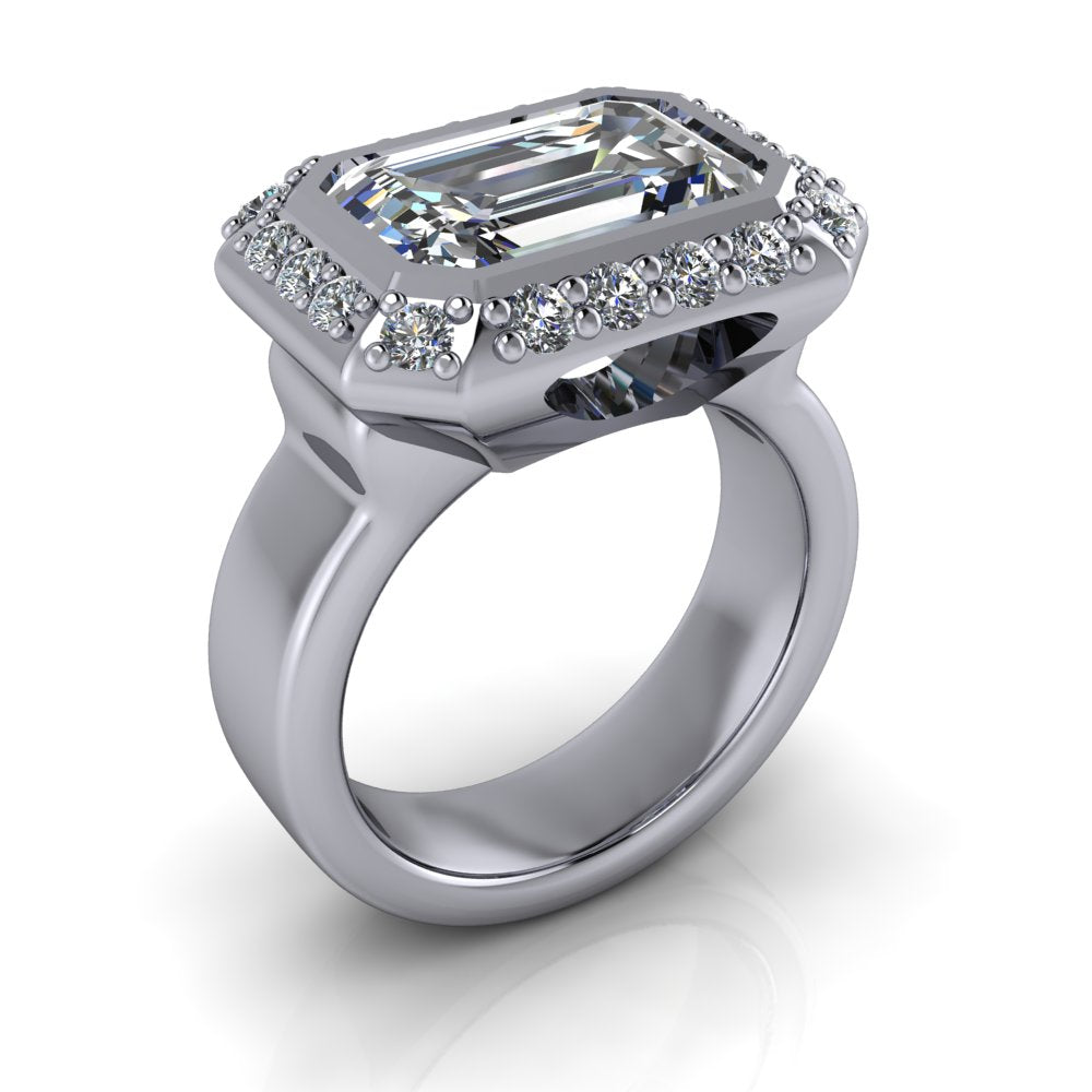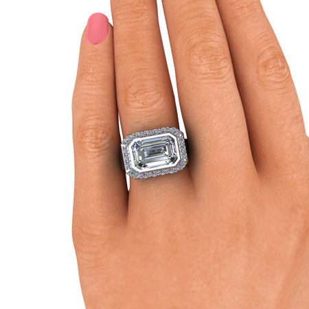 Bague de fiançailles moissanite à trois pierres présentée avec une moissanite incolore poire de 12 x 8 mm, 3,57 ct, couleur DEF, clarté VVS.