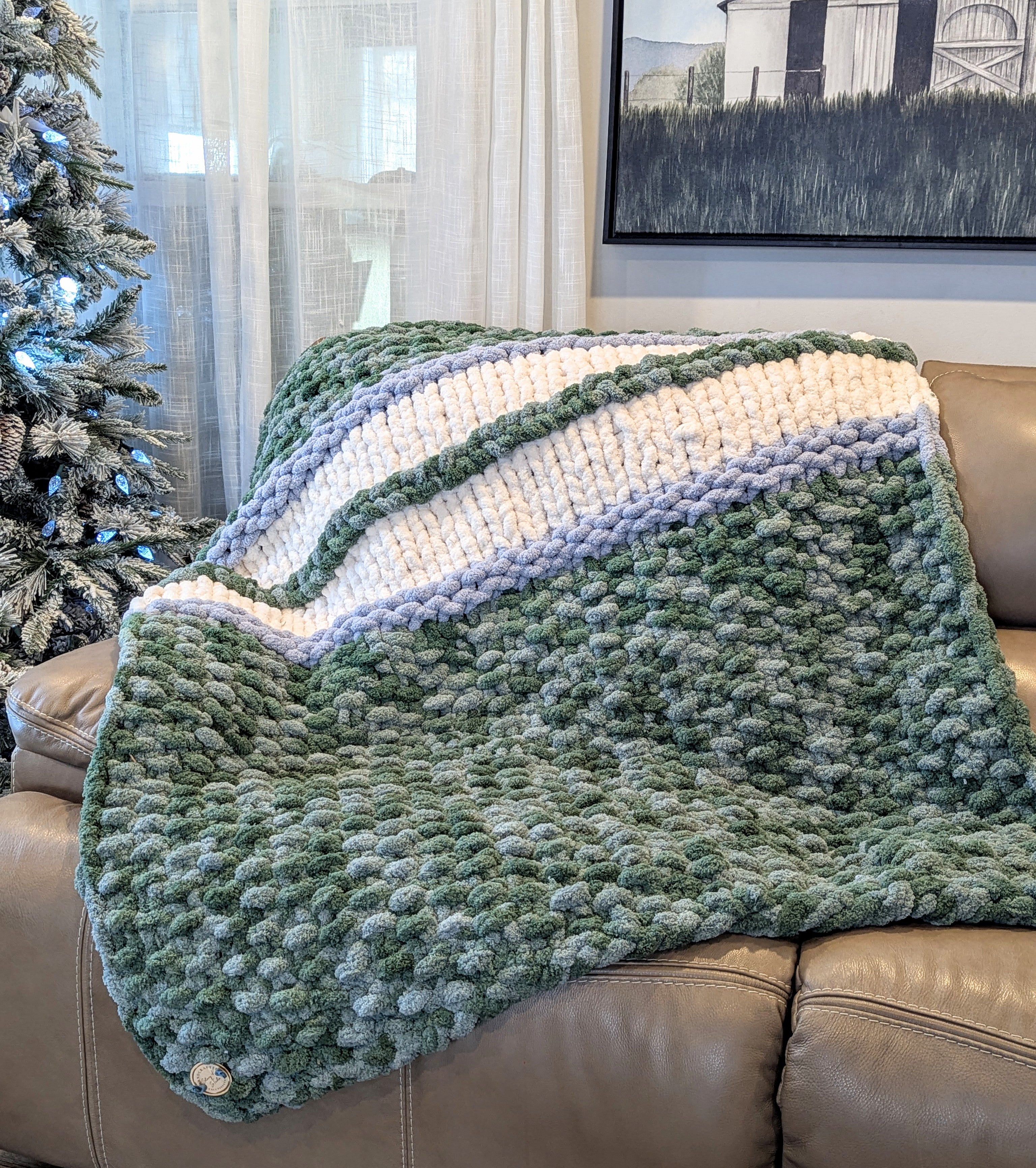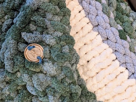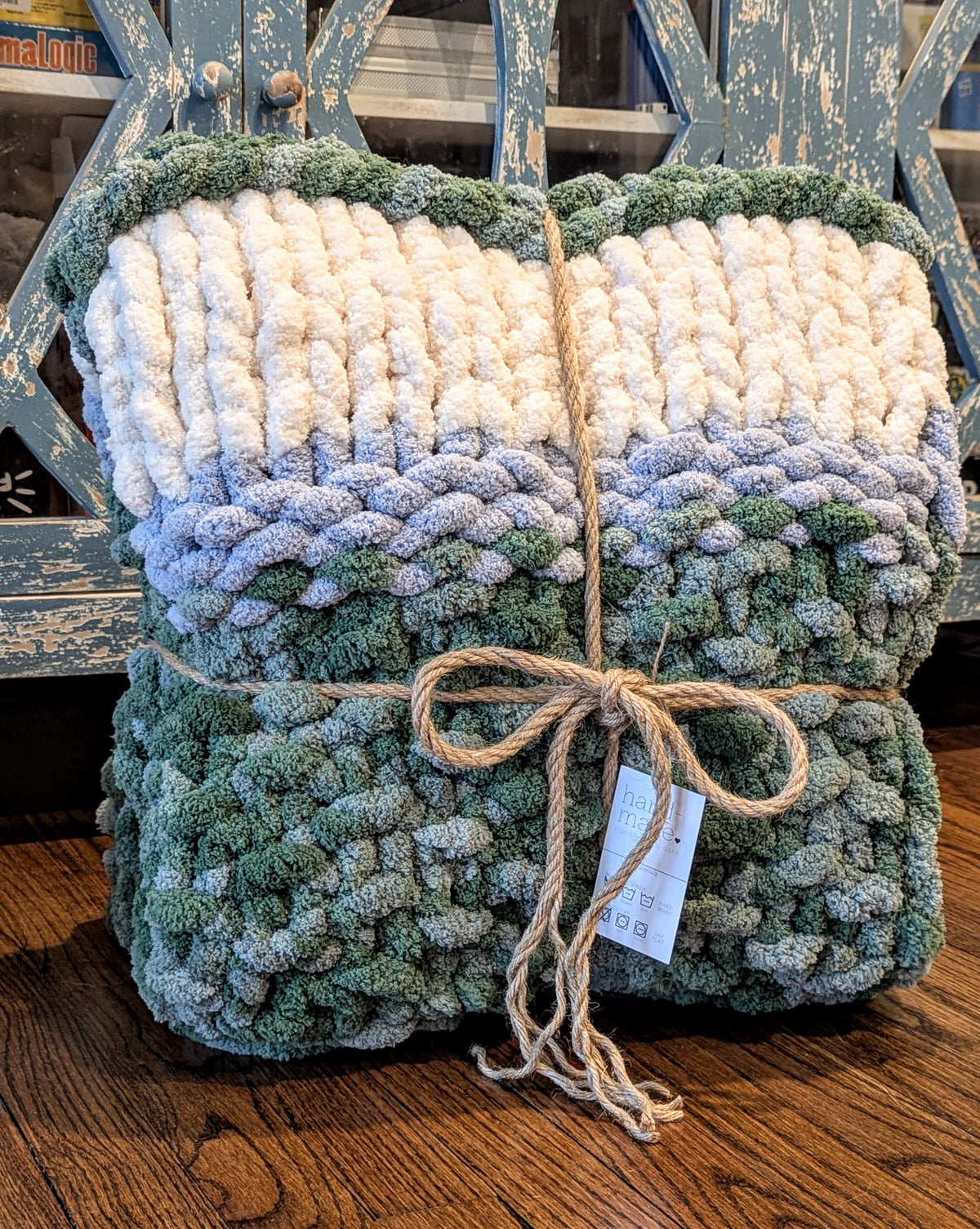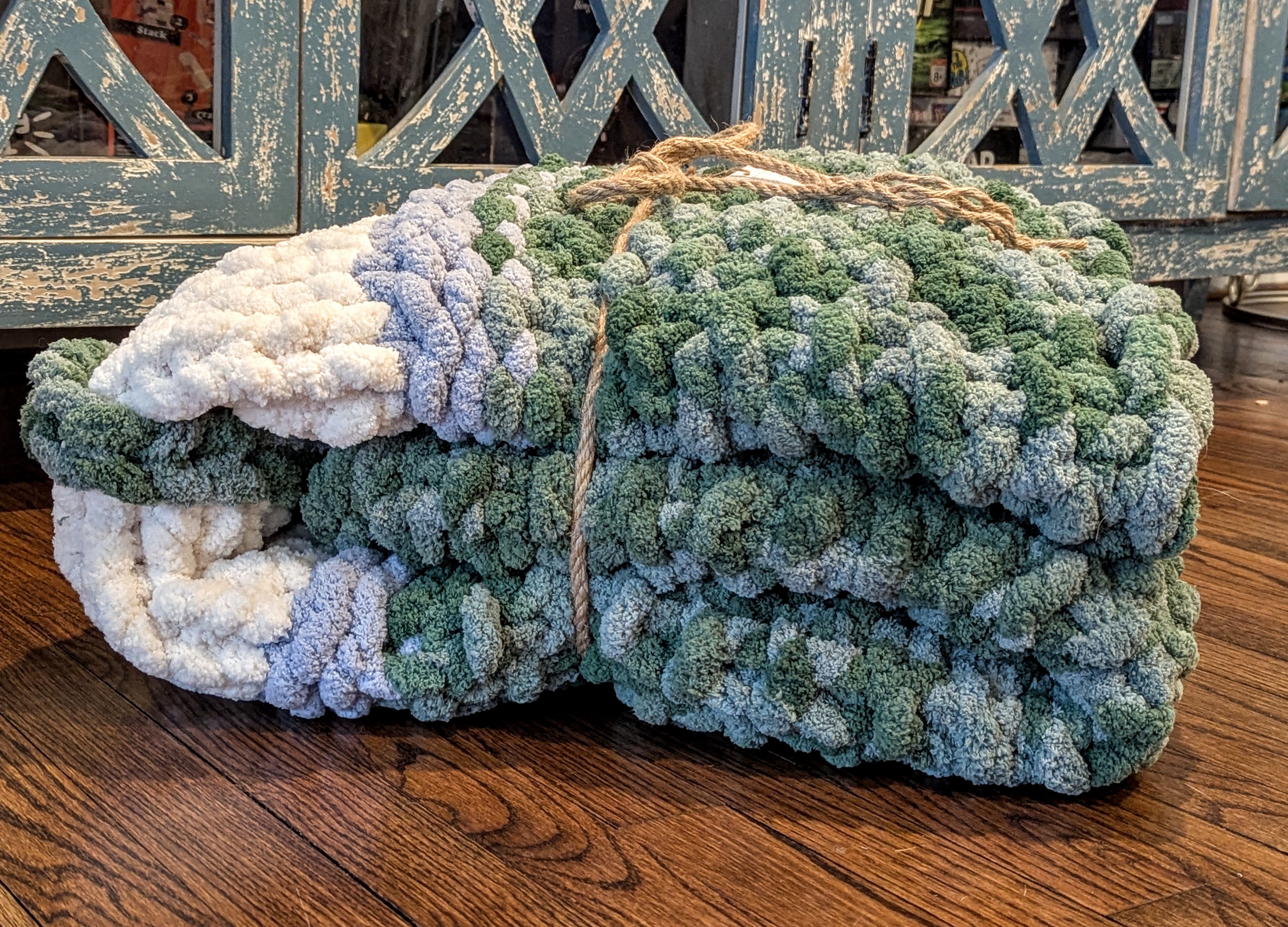 The one-of-a kind hand knit Chunky Blanket is perfect for snuggling up on a chilly day. It is crafted in 100% Bernat Jumbo Chunky Yarn.
