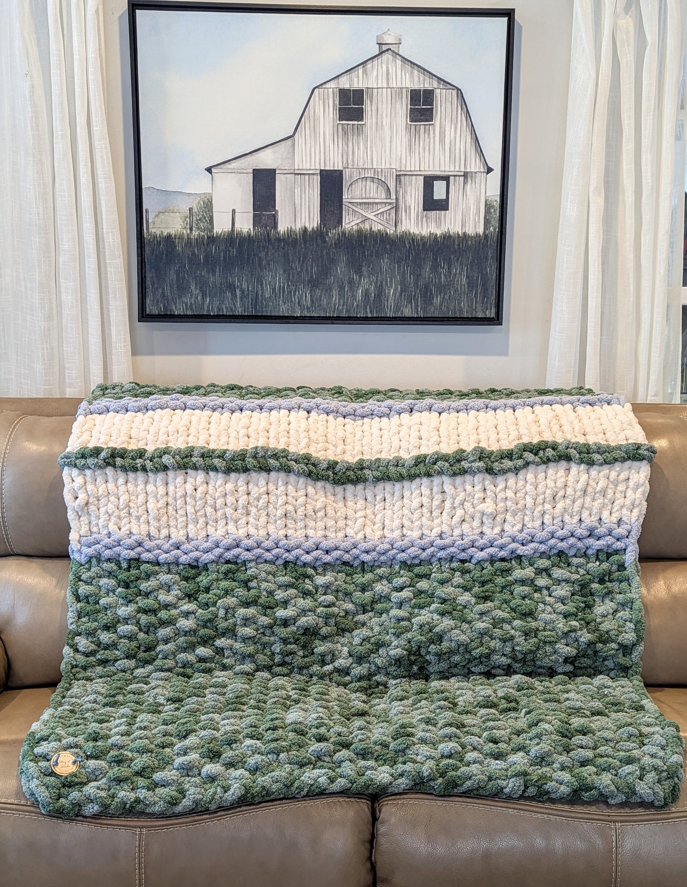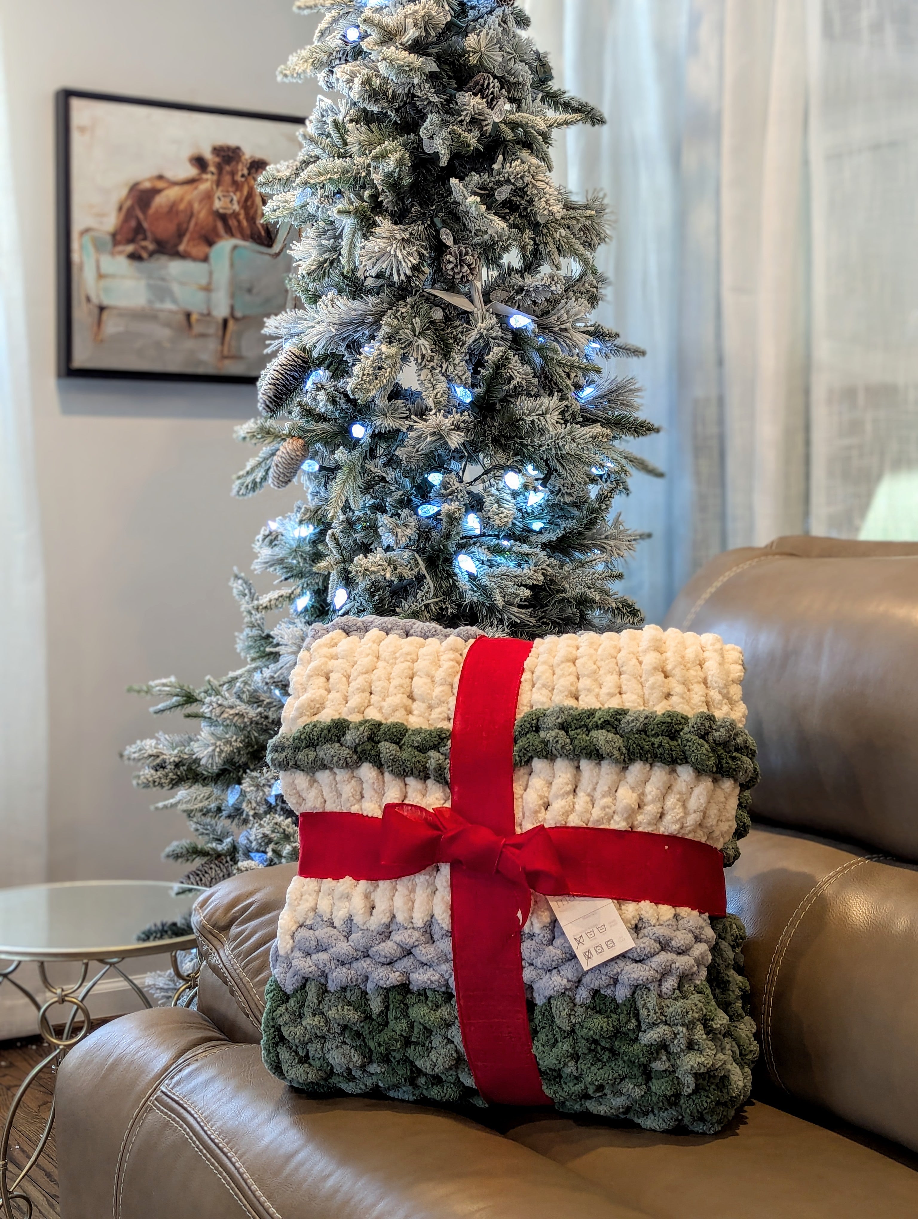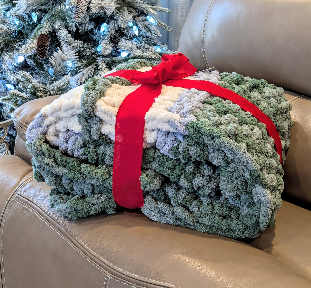 The one-of-a kind hand knit Chunky Blanket is perfect for snuggling up on a chilly day. It is crafted in 100% Bernat Jumbo Chunky Yarn.