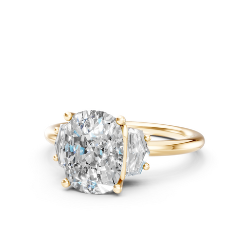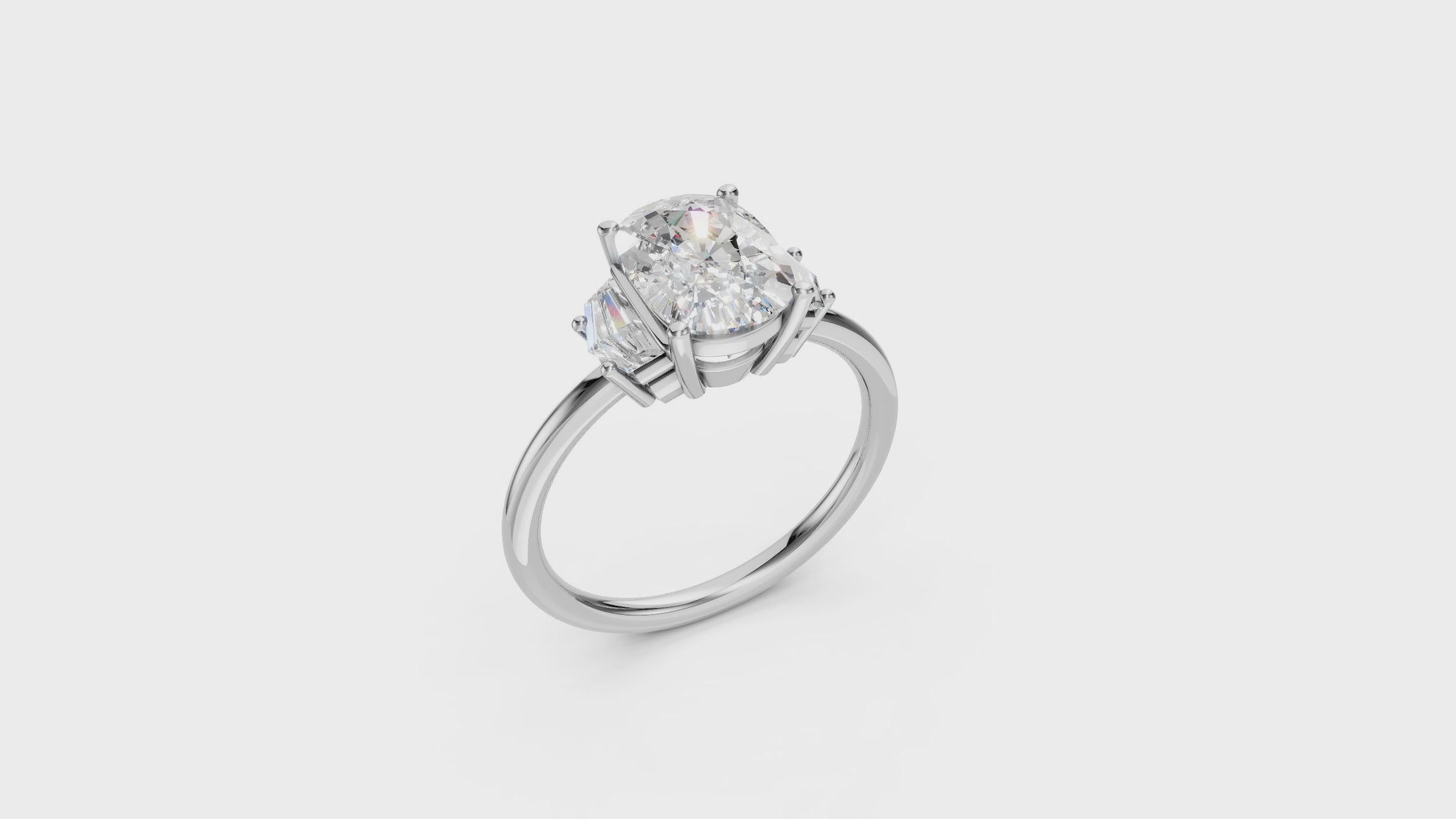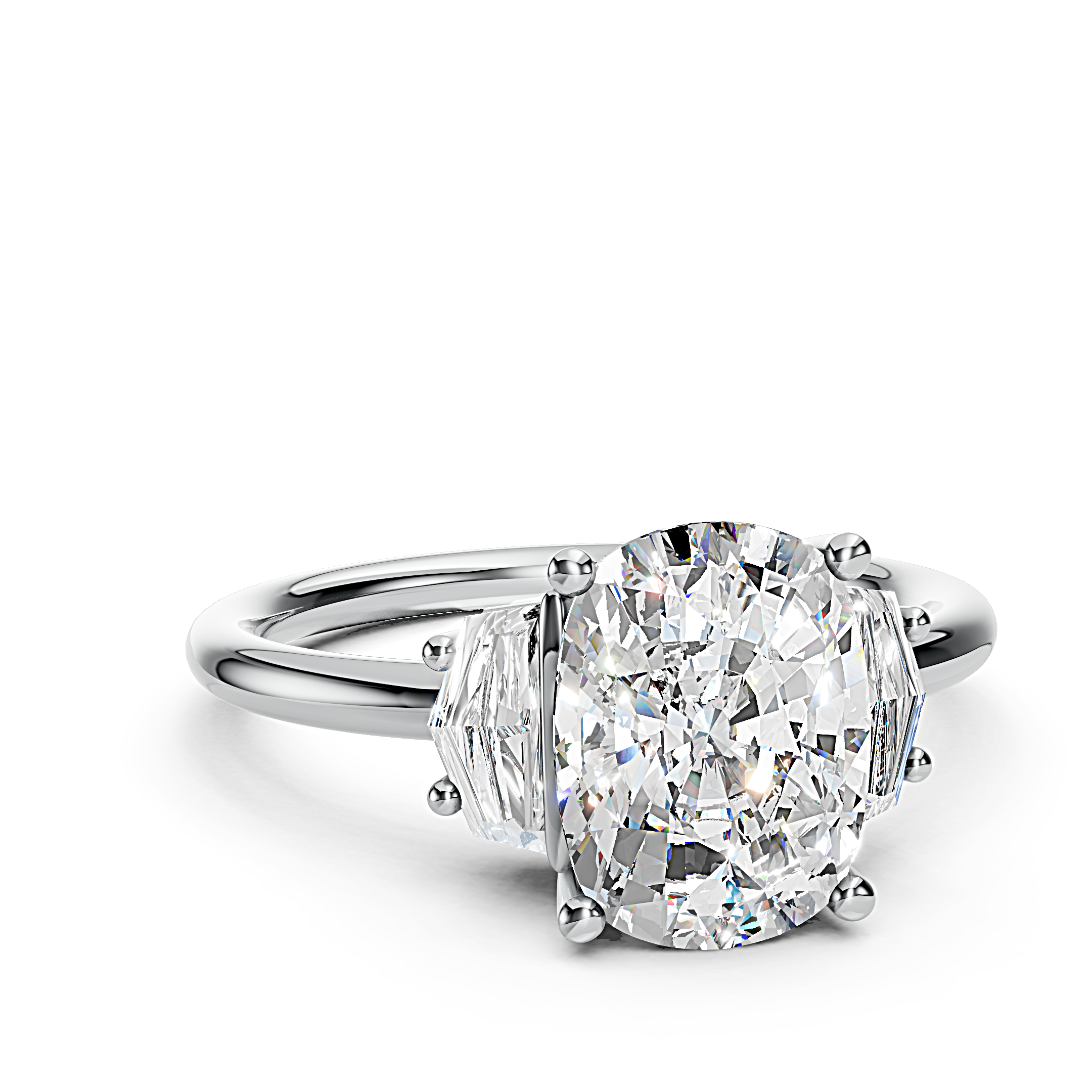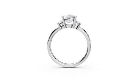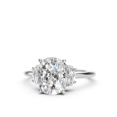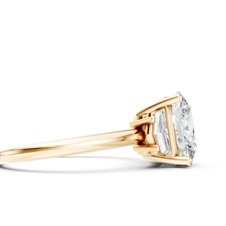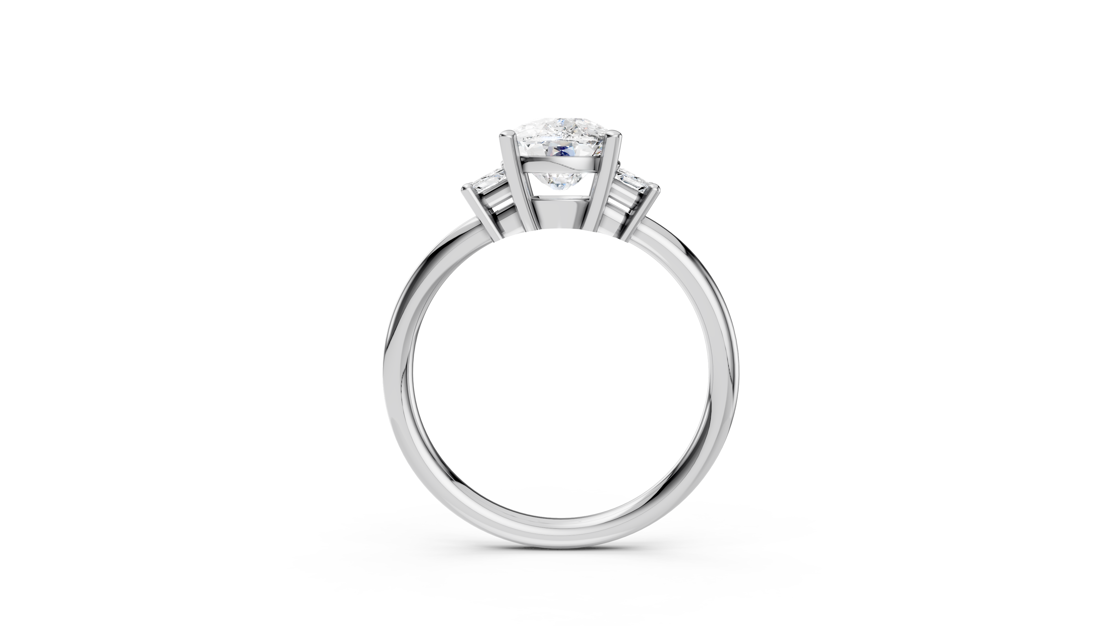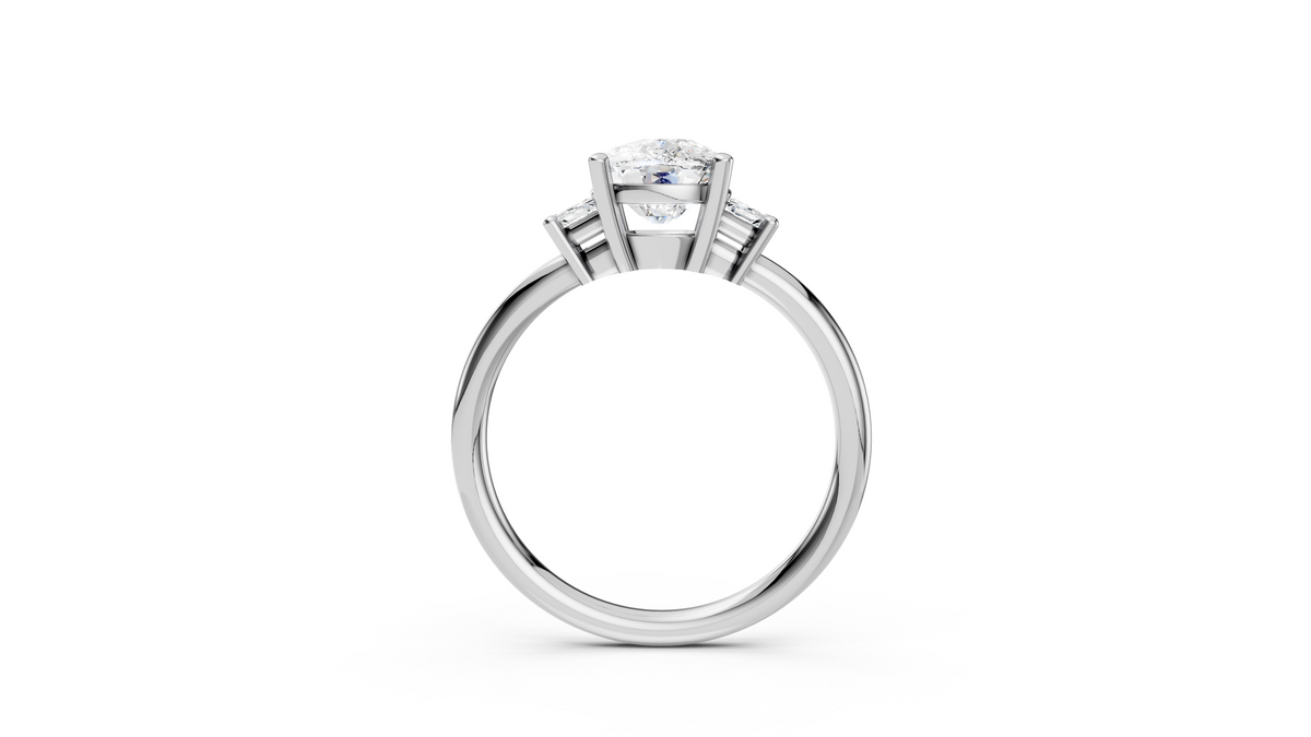 Bague de fiançailles moissanite à trois pierres présentée avec une moissanite incolore poire de 12 x 8 mm, 3,57 ct, couleur DEF, clarté VVS.
