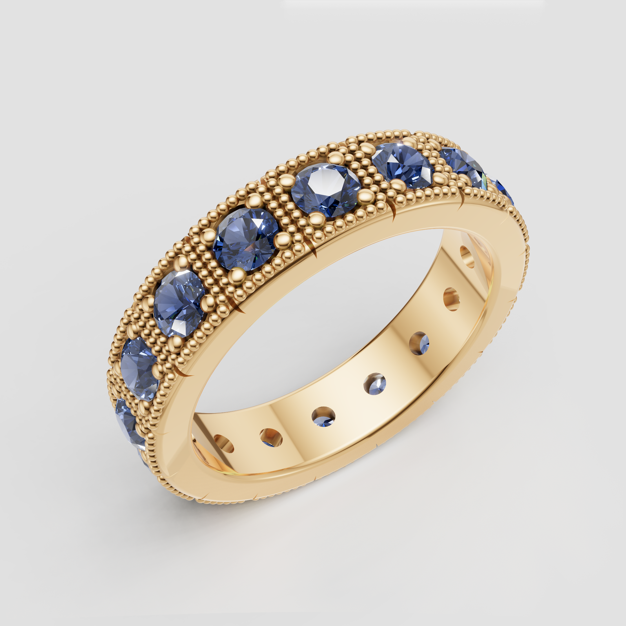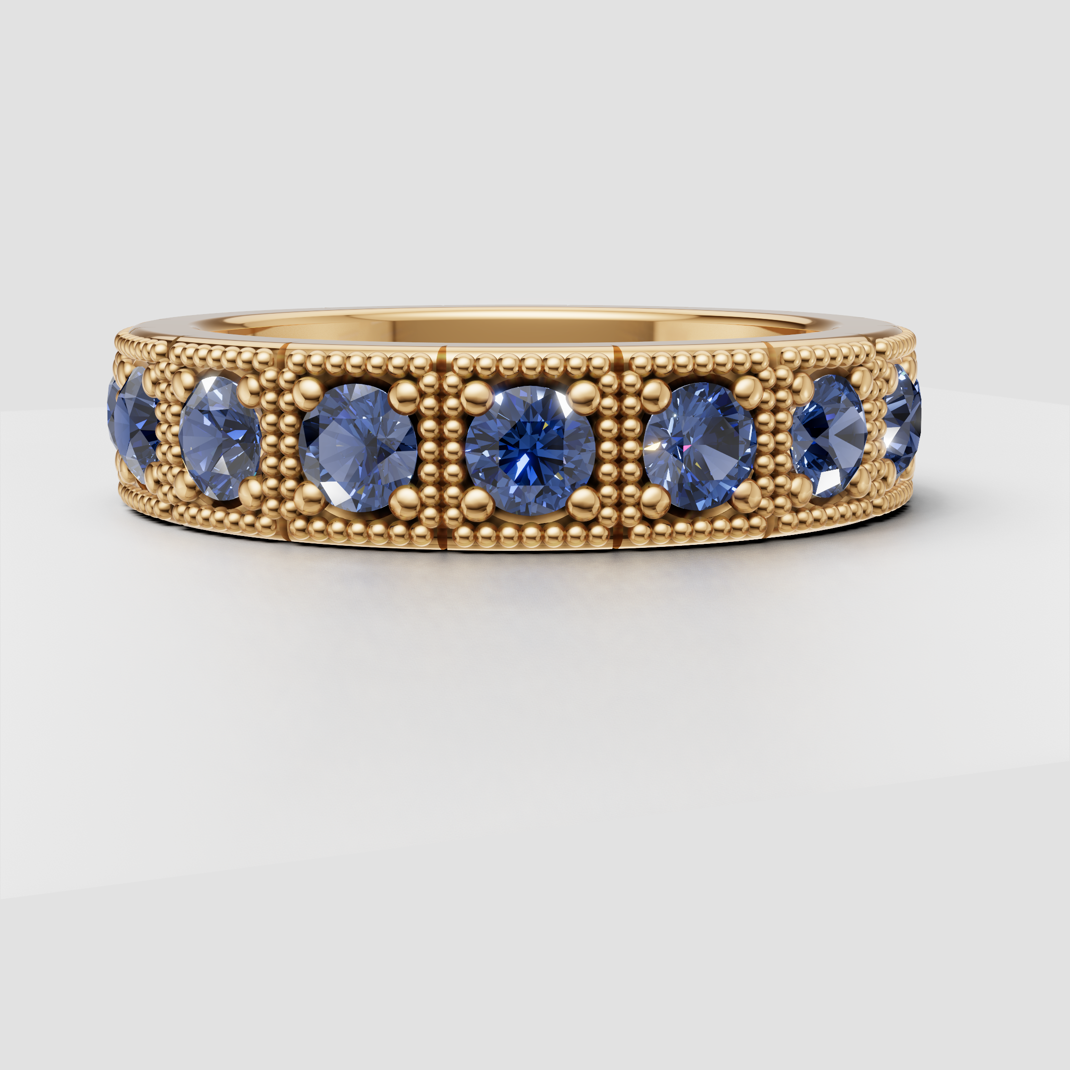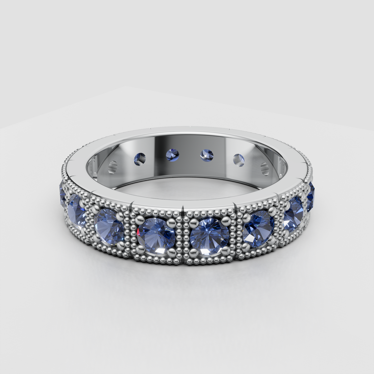 A 4.8mm wide eternity band featuring intricate beaded detailing and 1.65 ctw of sparkling lab diamonds (F/VS) or vivid lab-grown blue sapphires. Made to order in solid gold or platinum for a bold, timeless statement.