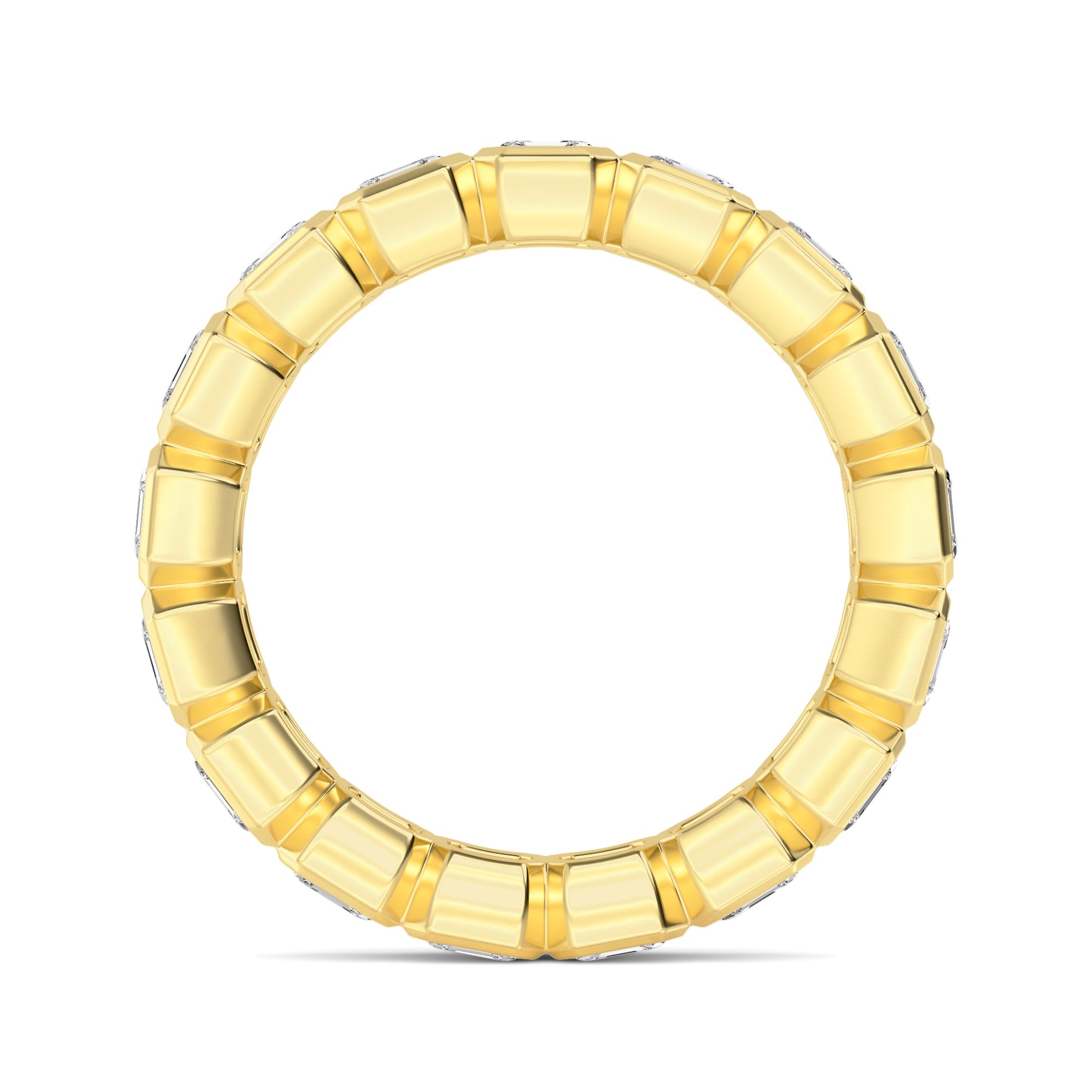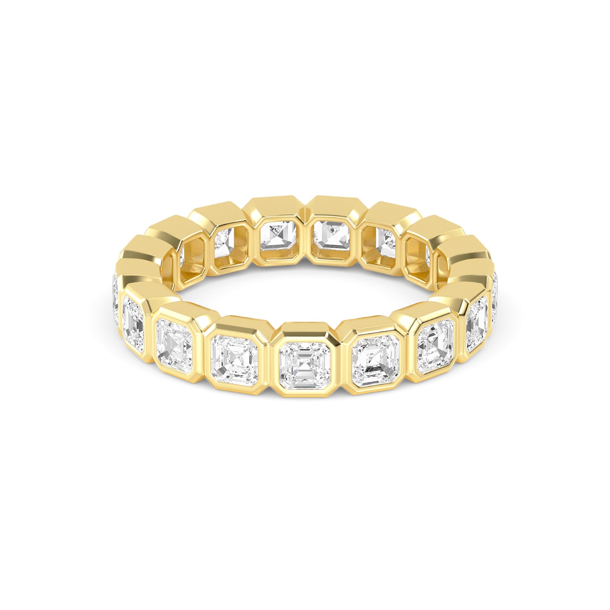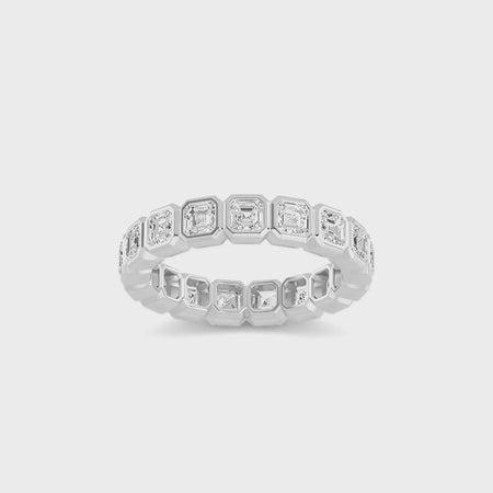 This 3.84 CTW eternity band features Asscher cut lab grown diamonds in sleek bezel settings for a bold, architectural look.