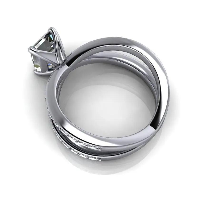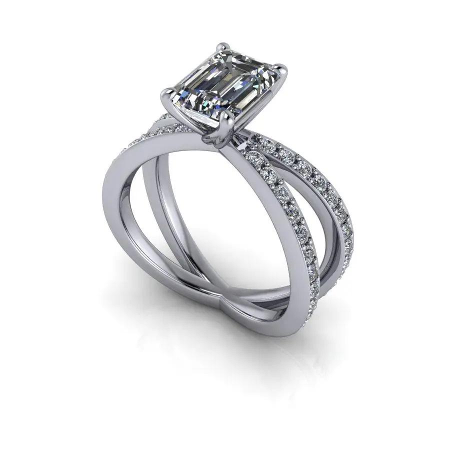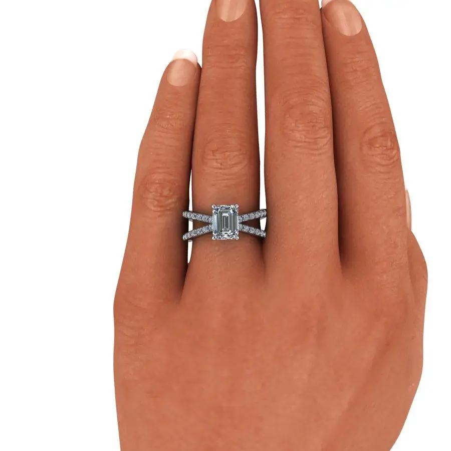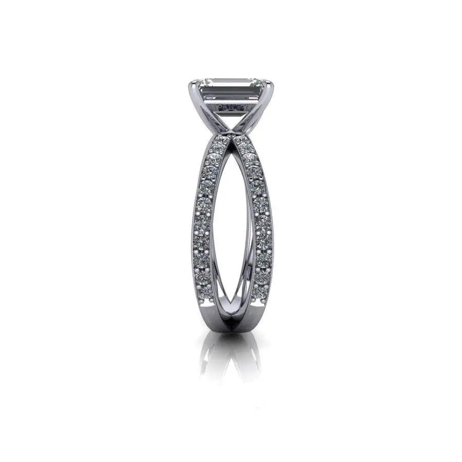 Split shank lab grown diamond engagement ring shown with an IGI certified 1.75 ct emerald cut lab grown diamond, GH Color, SI1 Clarity and round lab grown diamonds, .33 ct.