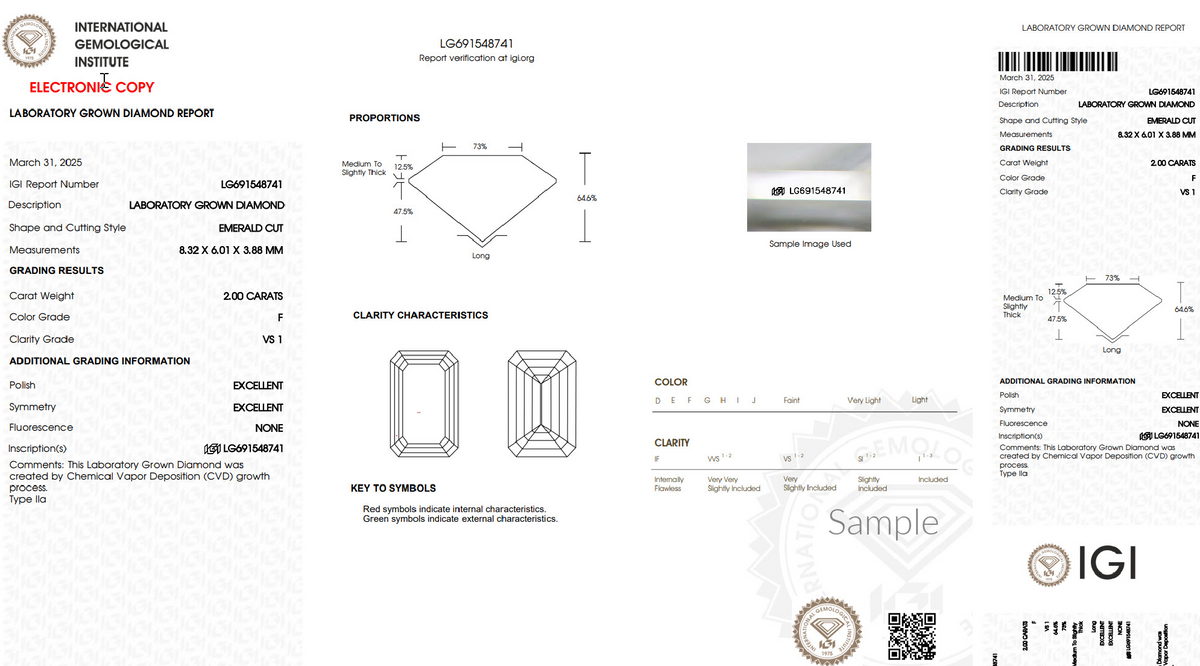 2.00 ct. IGI Certified Emerald Cut Lab Grown Diamond, F Color, VS1 Clarity.