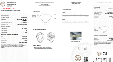 The lab grown diamond engagement ring is set with an IGI certified 1.50 ct. Pear Shape Lab Grown Diamond, E Color, VS Clarity, and an IGI certified 1.25 ct. Round lab grown diamond, E Color, VS Clarity.