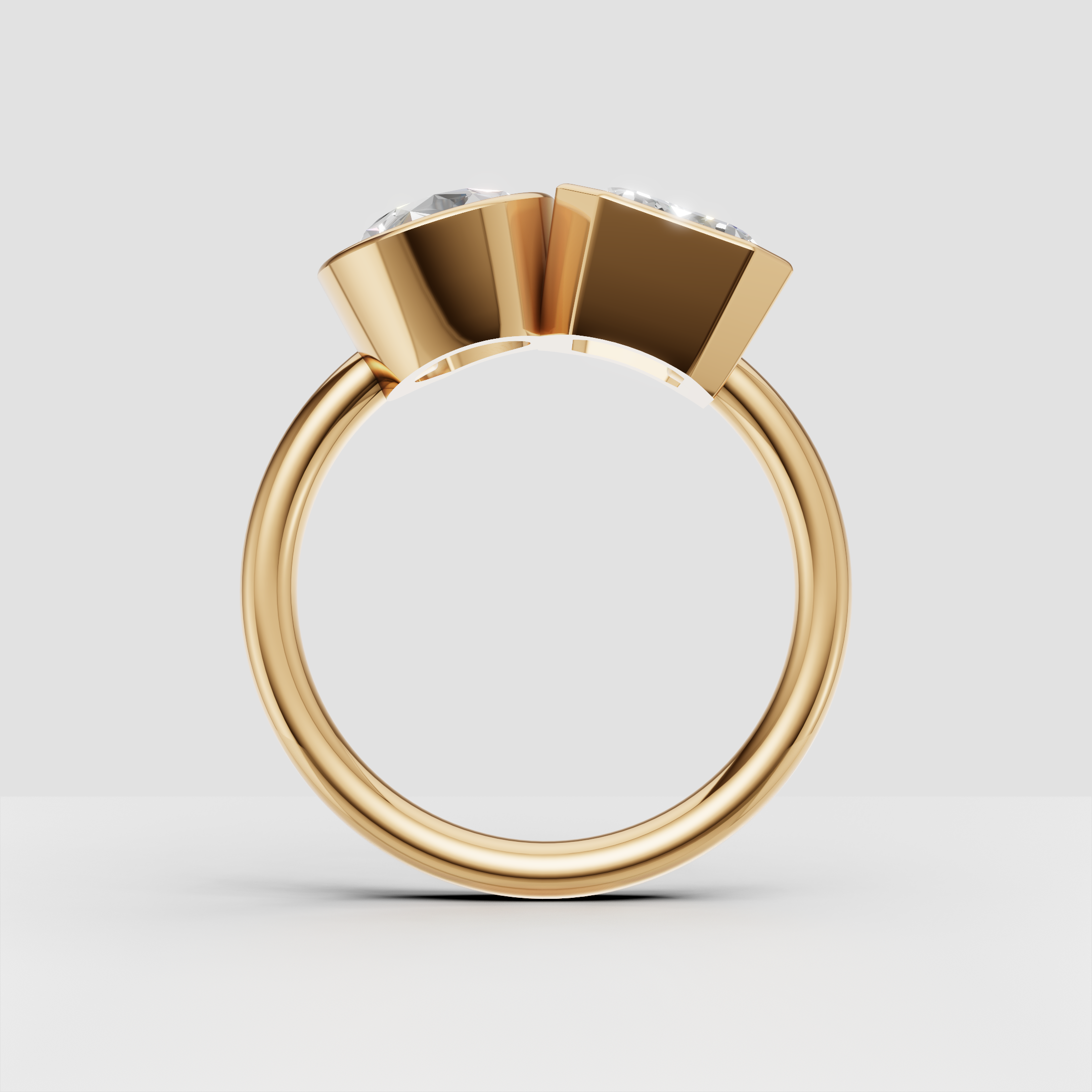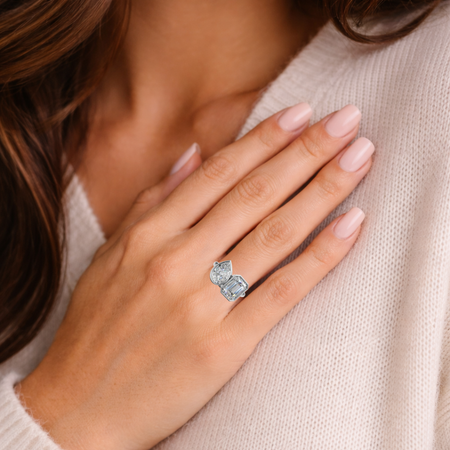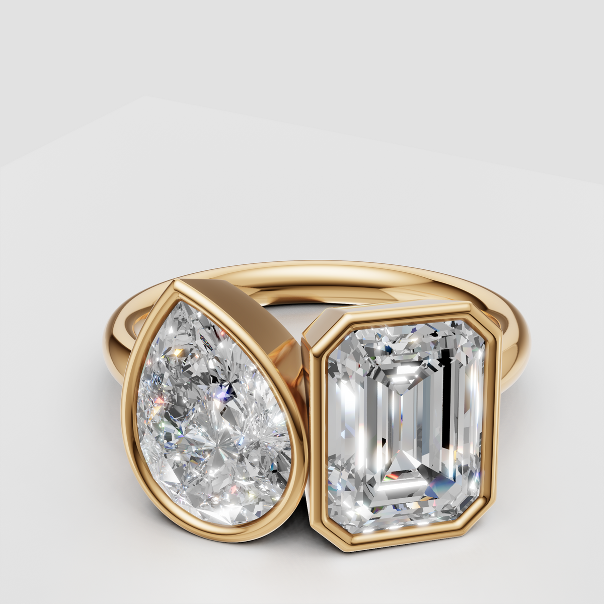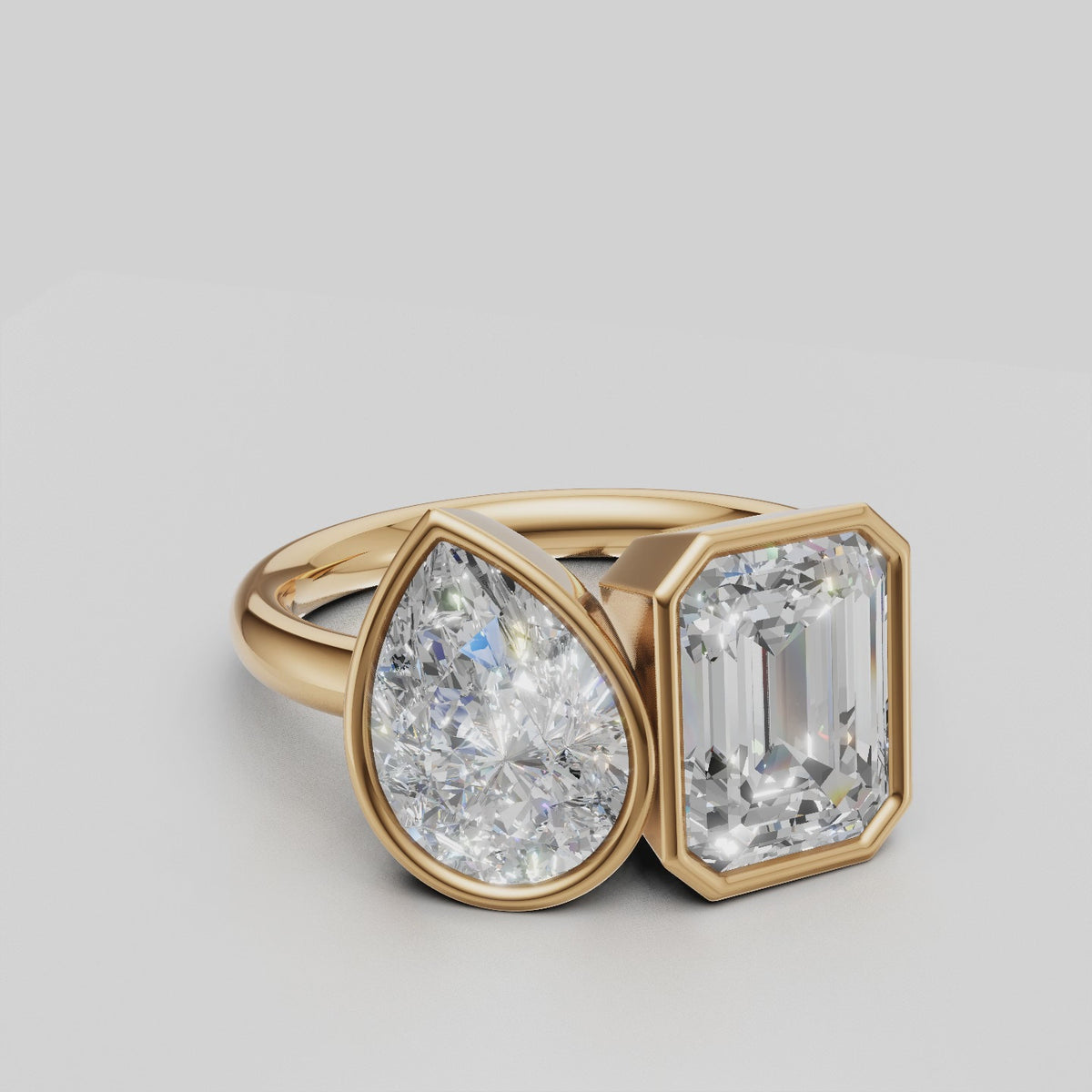 Elegant two-stone Toi et Moi ring featuring lab-grown emerald and pear diamonds, bezel set.
