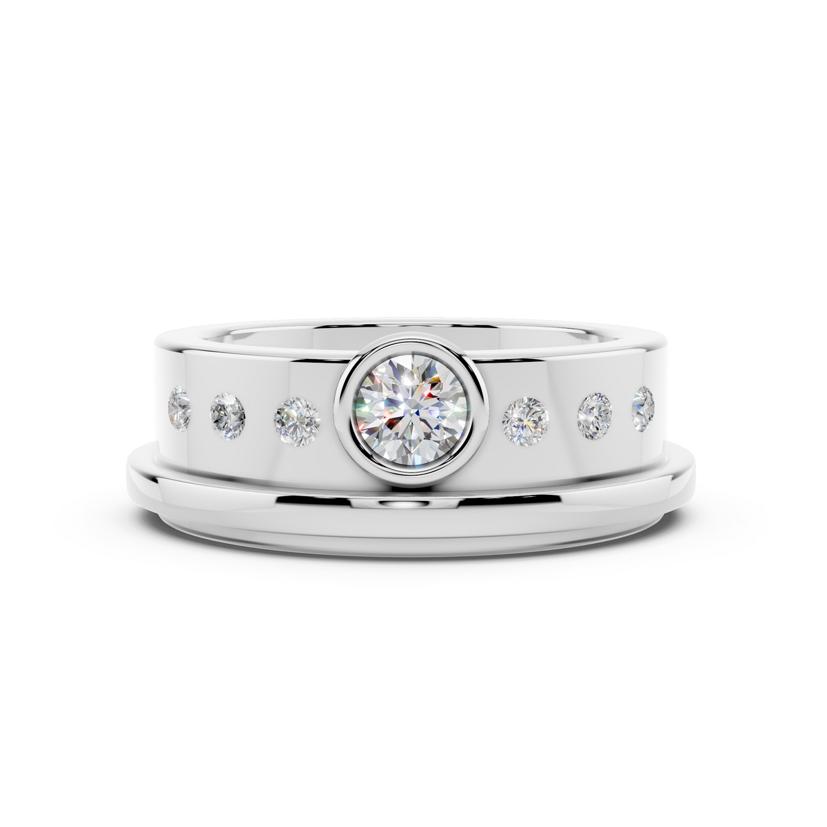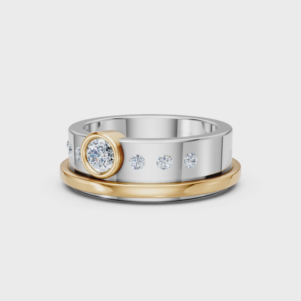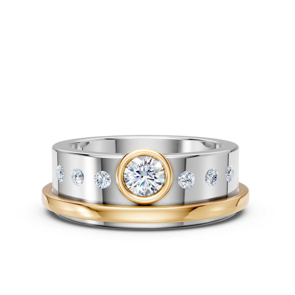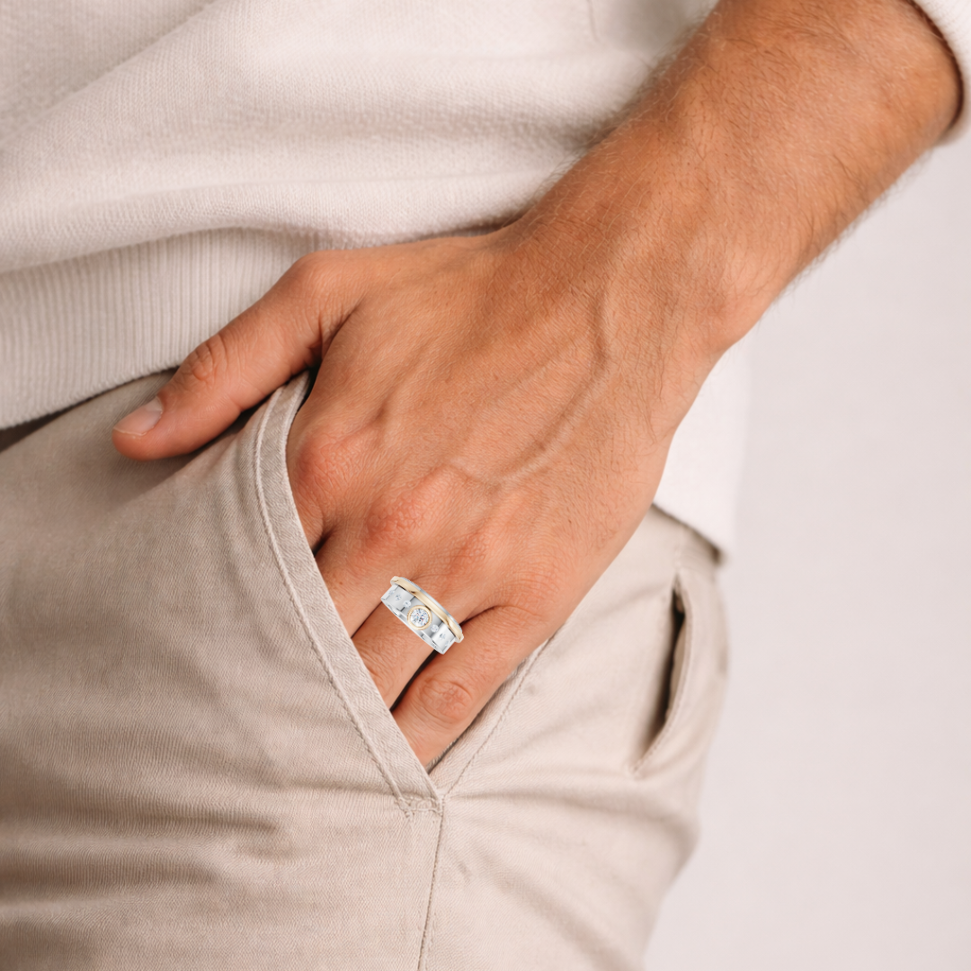 This 7.5mm solid 925 sterling silver band is designed for modern love. Clean lines meet refined brilliance with a .25 ct round lab diamond, F color, VS clarity, bezel set in rich 10kt yellow gold. Flush set round lab diamonds, .20 ct total weight, add understated fire along the band.
