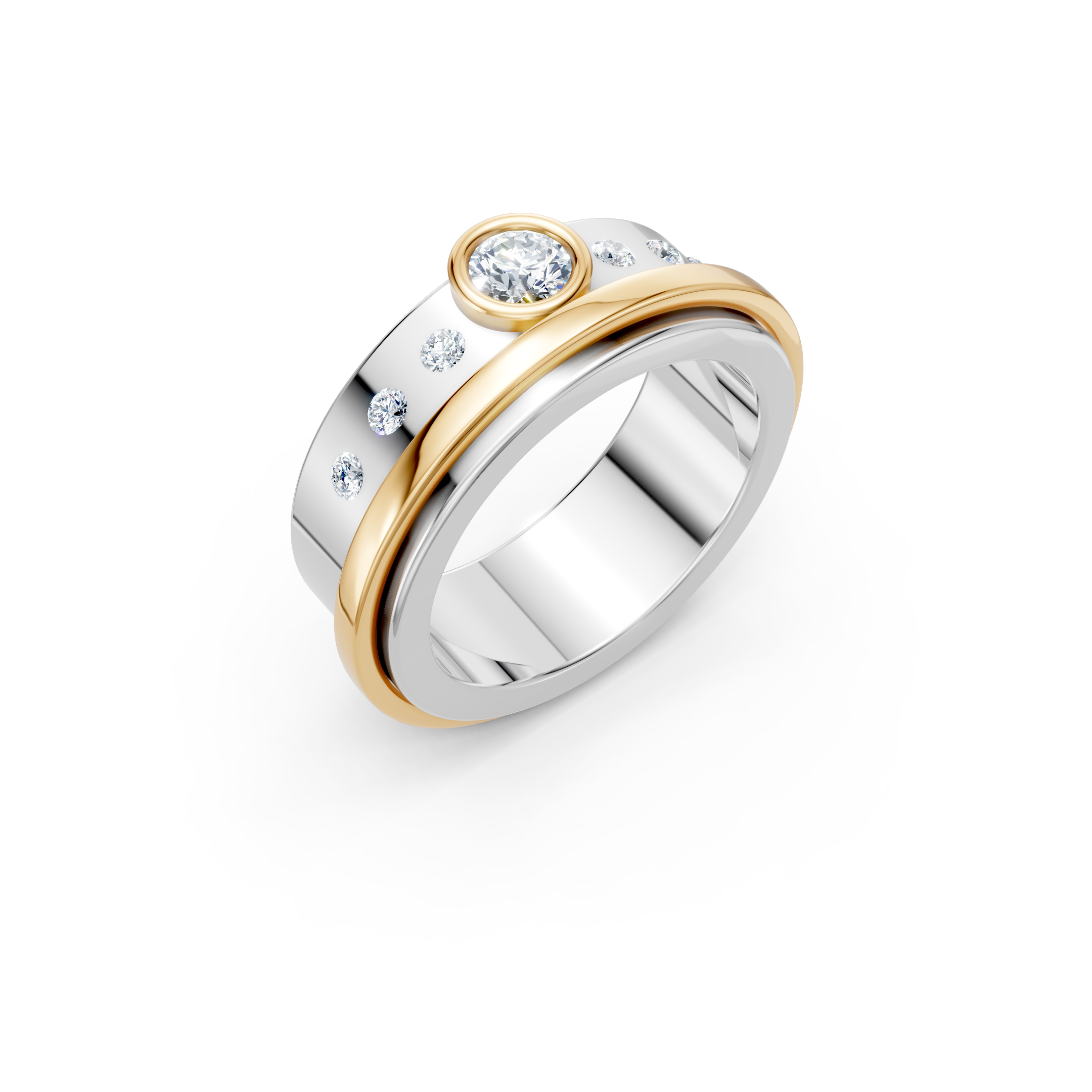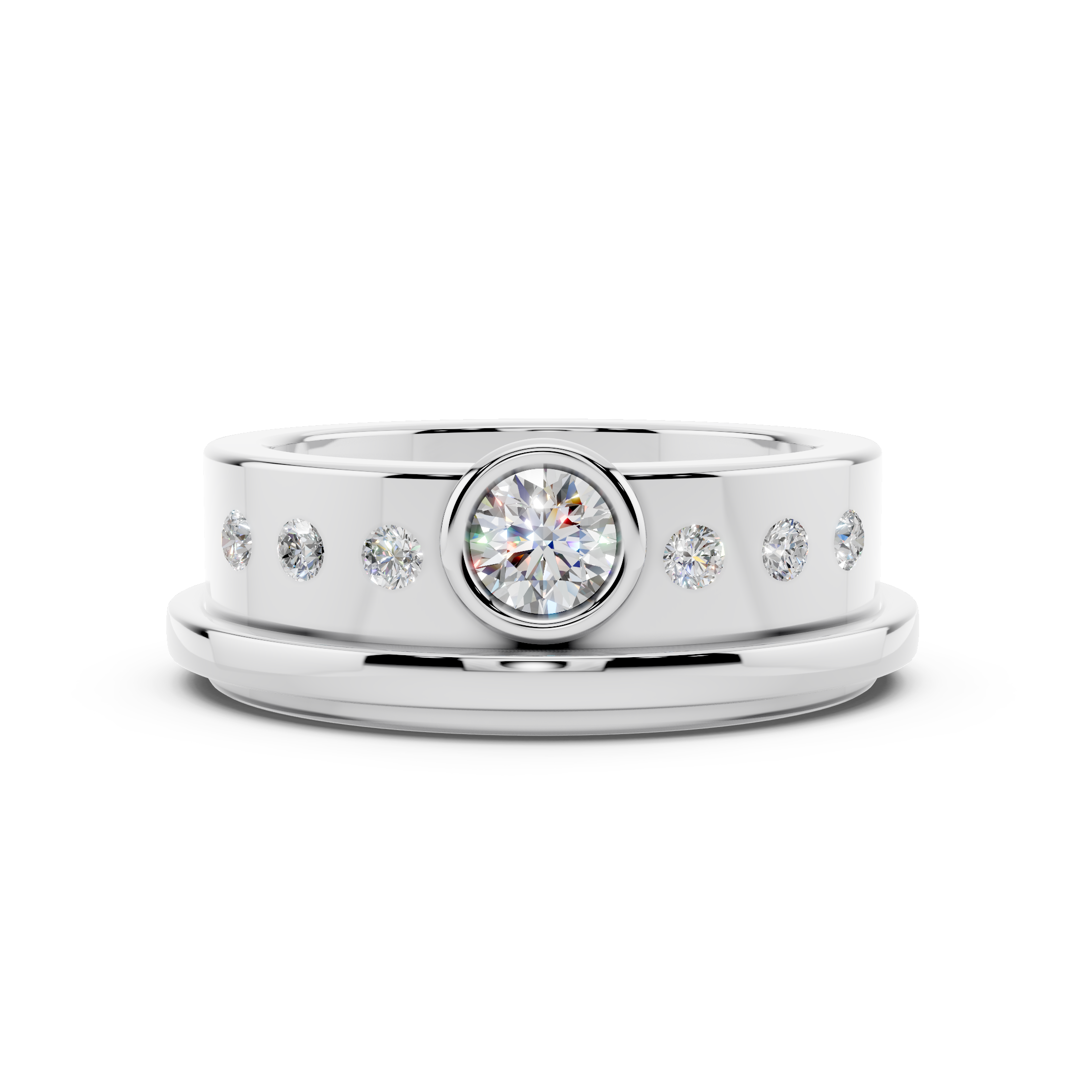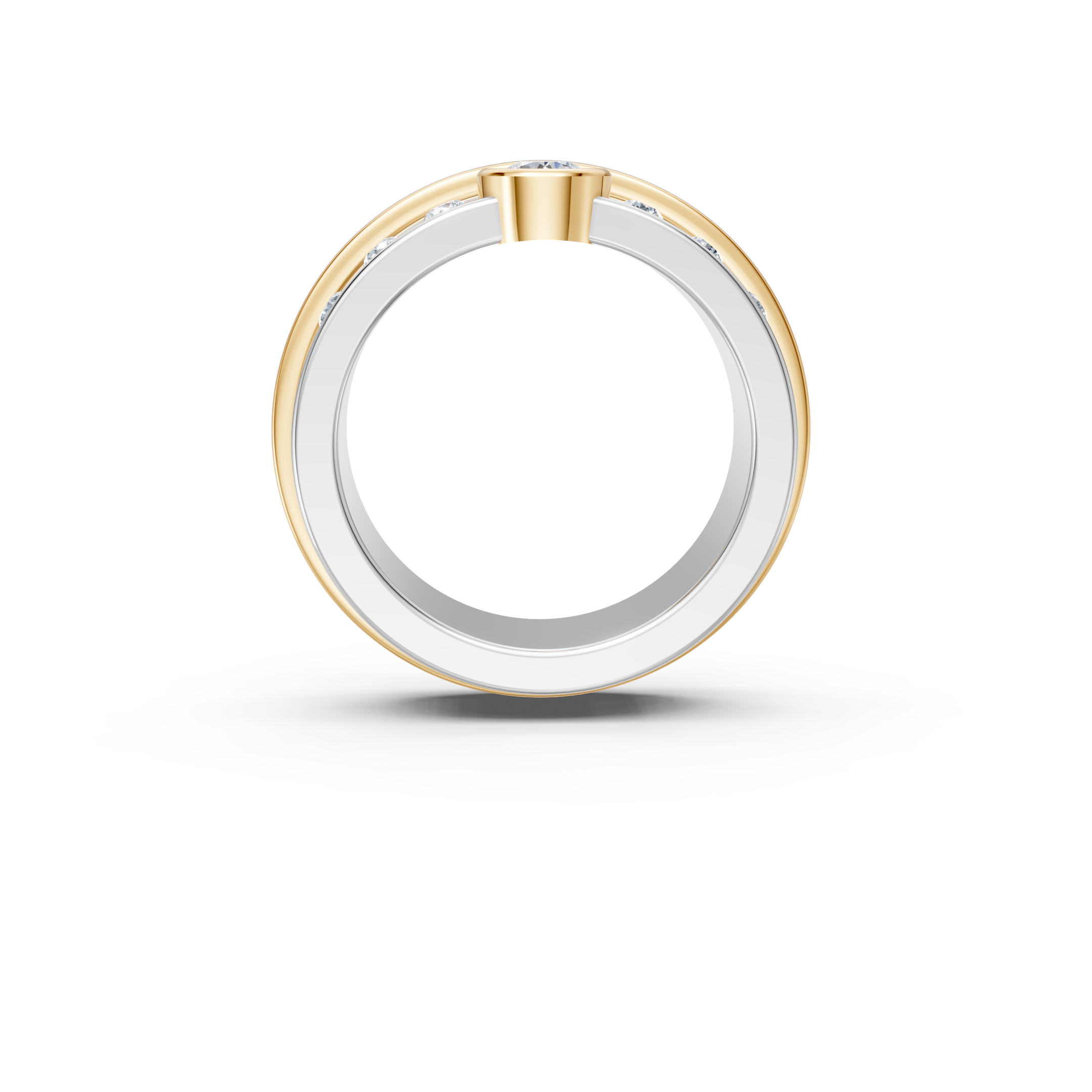 This 7.5mm solid 925 sterling silver band is designed for modern love. Clean lines meet refined brilliance with a .25 ct round lab diamond, F color, VS clarity, bezel set in rich 10kt yellow gold. Flush set round lab diamonds, .20 ct total weight, add understated fire along the band.