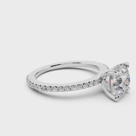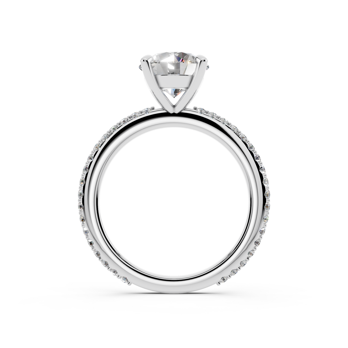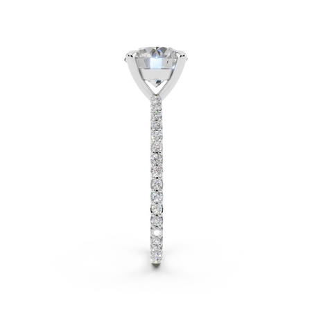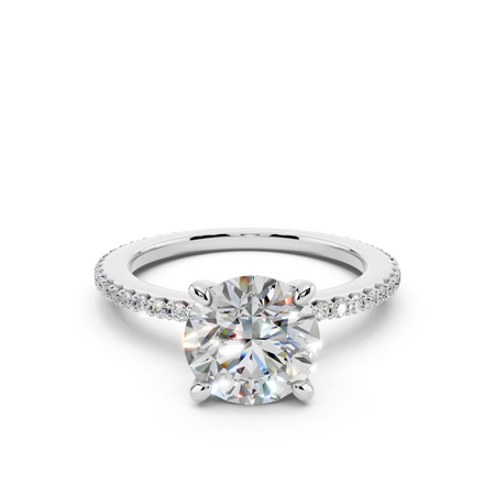 The slender 1.7mm pavé band adds delicate brilliance while maintaining a refined, minimalist profile that keeps the focus on the center stone.