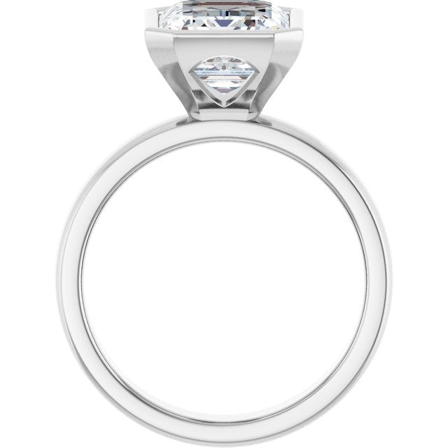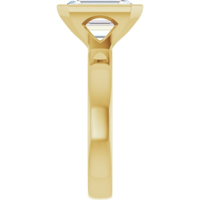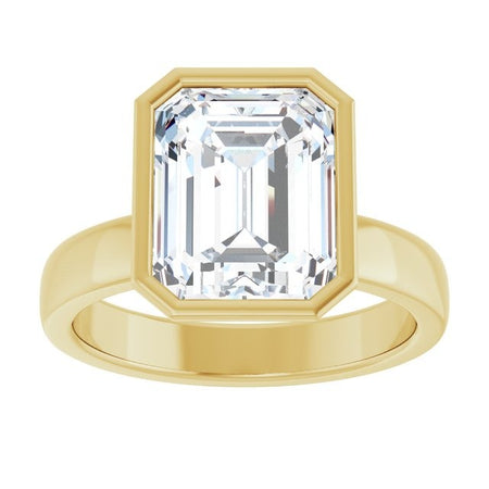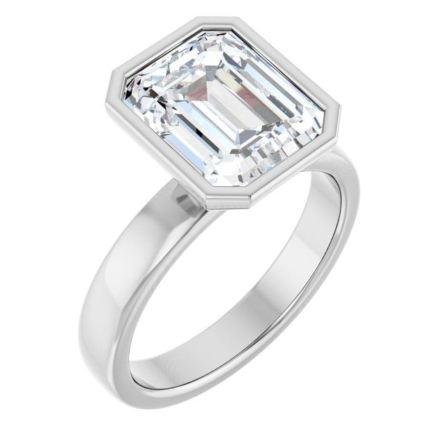 Emerald cut stone lab grown diamond engagement ring, solitaire bezel setting handcrafted in gold or platinum.