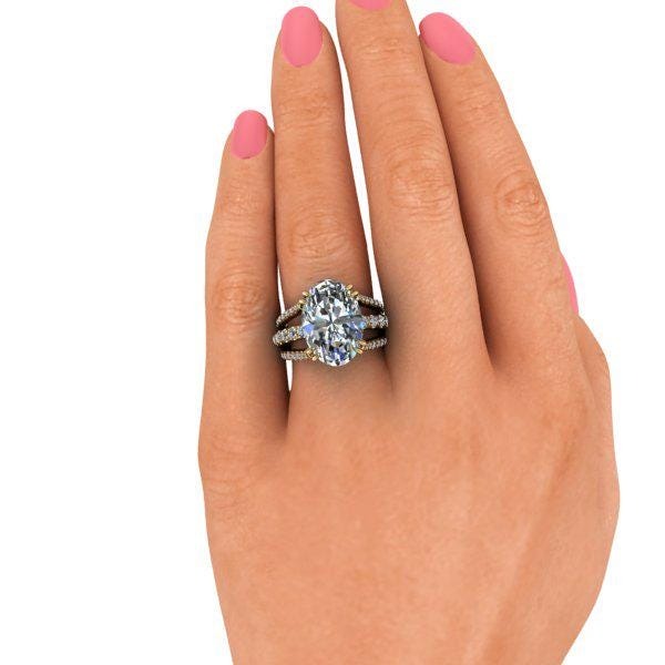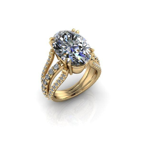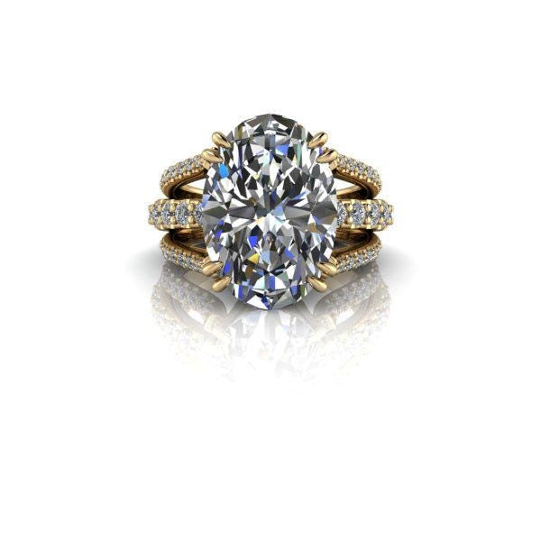 Center Stone: 6.50 ct. Oval colorless moissanite, DEF Color, VVS Clarity
