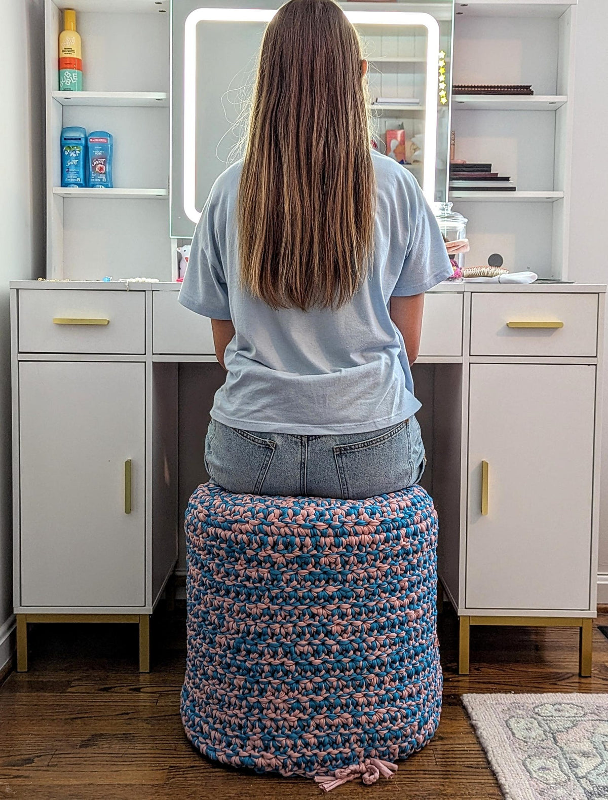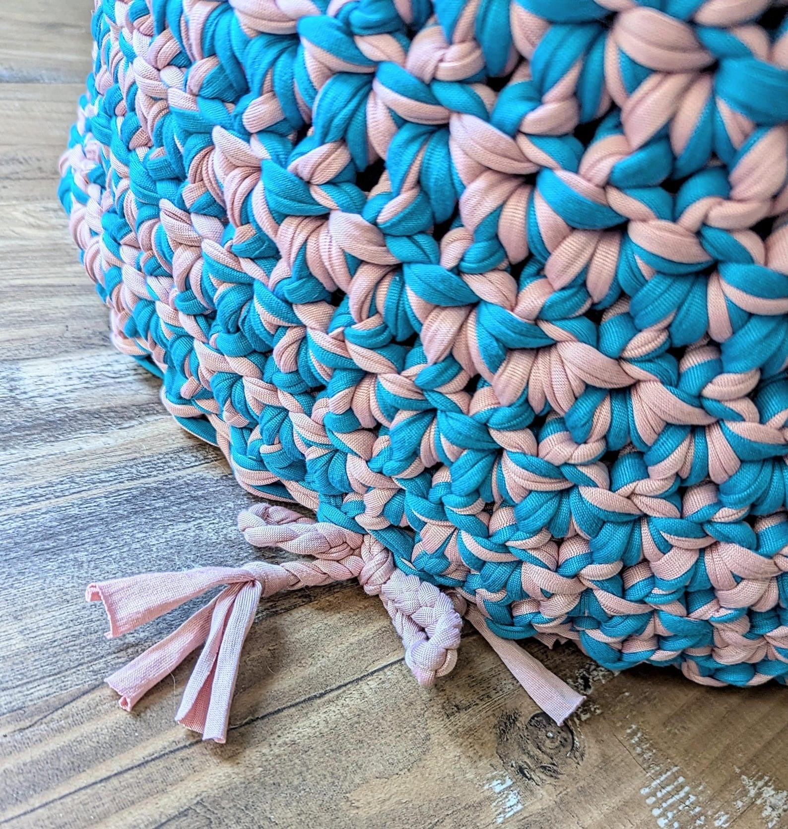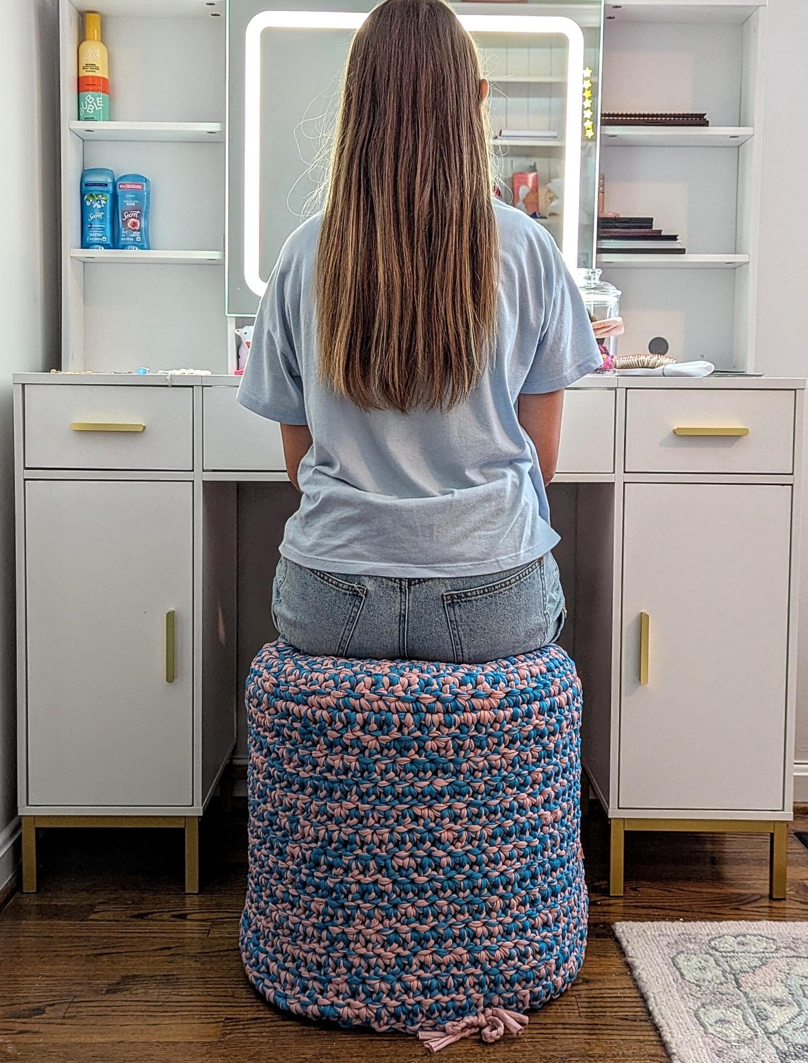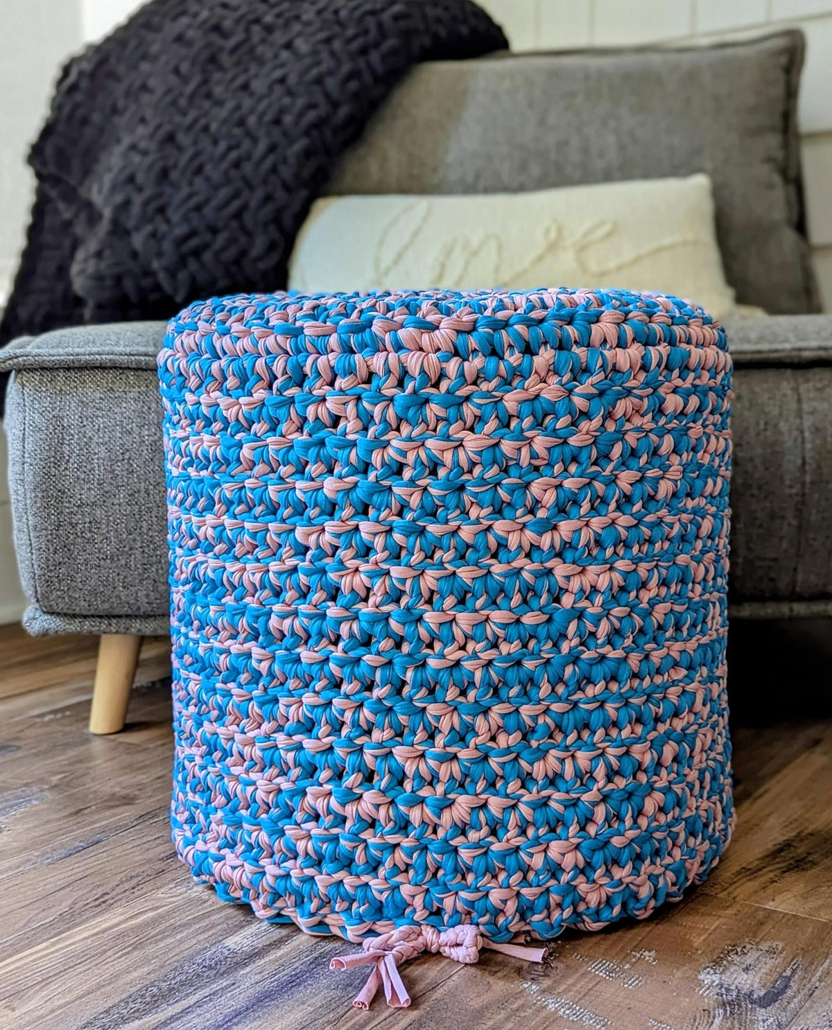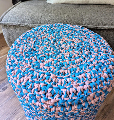 Ready to ship family room ottoman or vanity stool with a pink and turquoise soft t-shirt yarn cover. The stool has floor protection and is stable. The heavy-duty, heavy weight, handmade jersey cotton cover fits perfectly over the ottoman and is machine washable. The cover has a braided drawstring to make sure it stays snug around the bottom.
