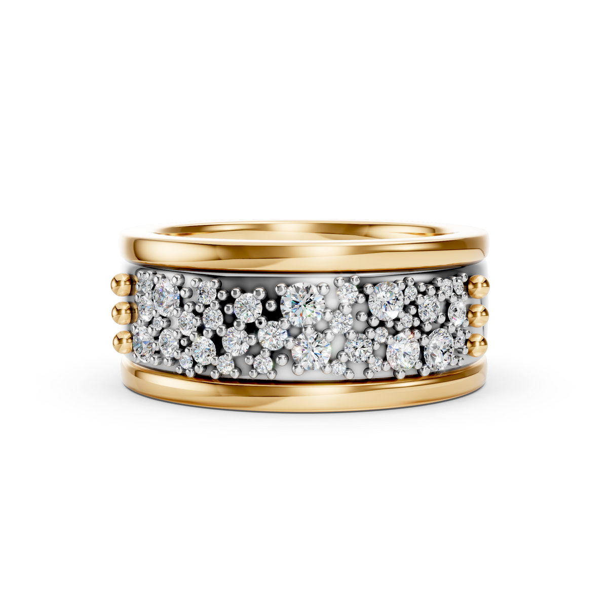 Make a powerful statement with this striking two-tone diamond band, designed for those who appreciate substantial luxury with refined detail. Crafted in luminous silver and rich yellow gold, this 8.2mm wide band features a modern silhouette that feels both architectural and timeless.