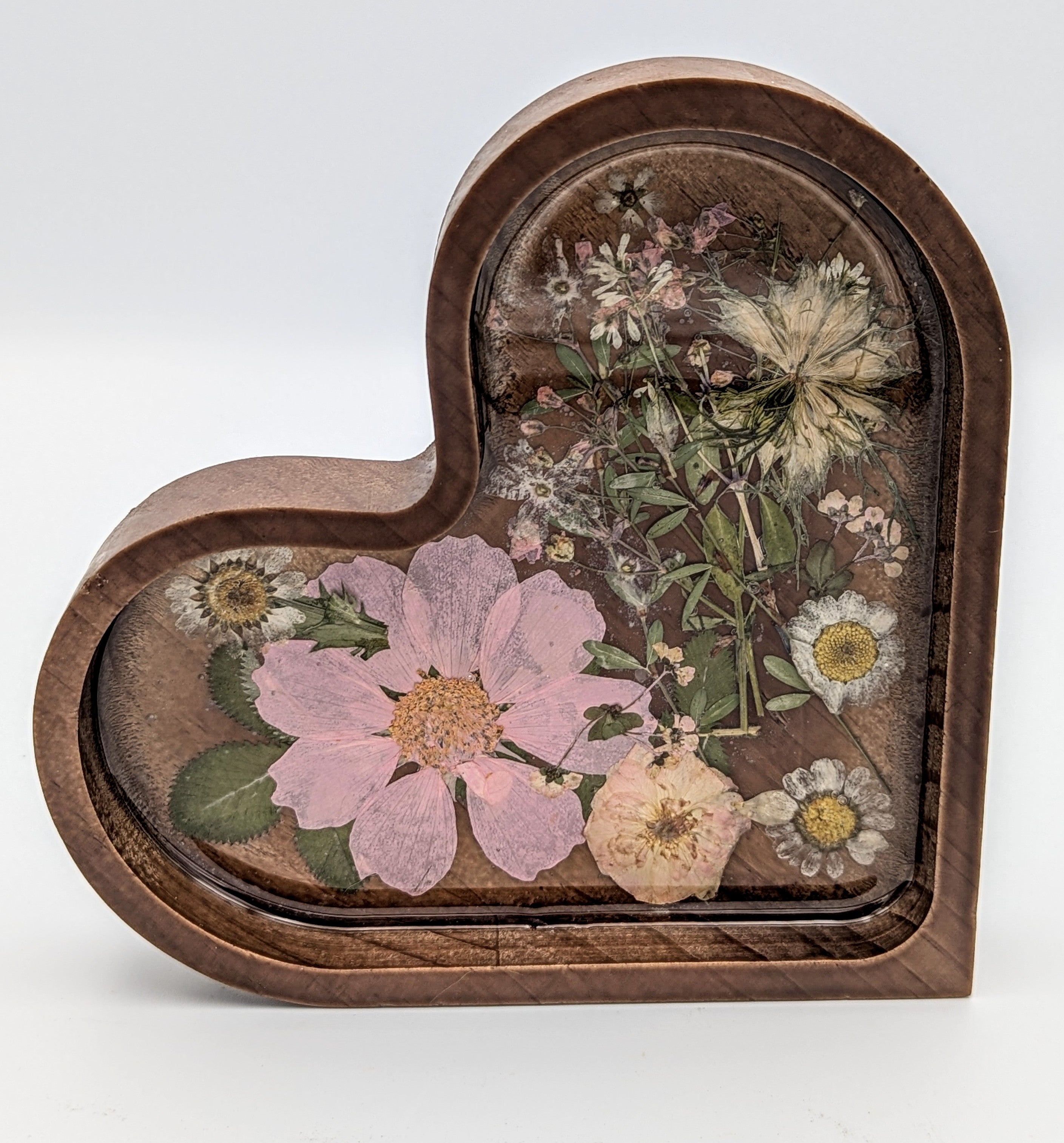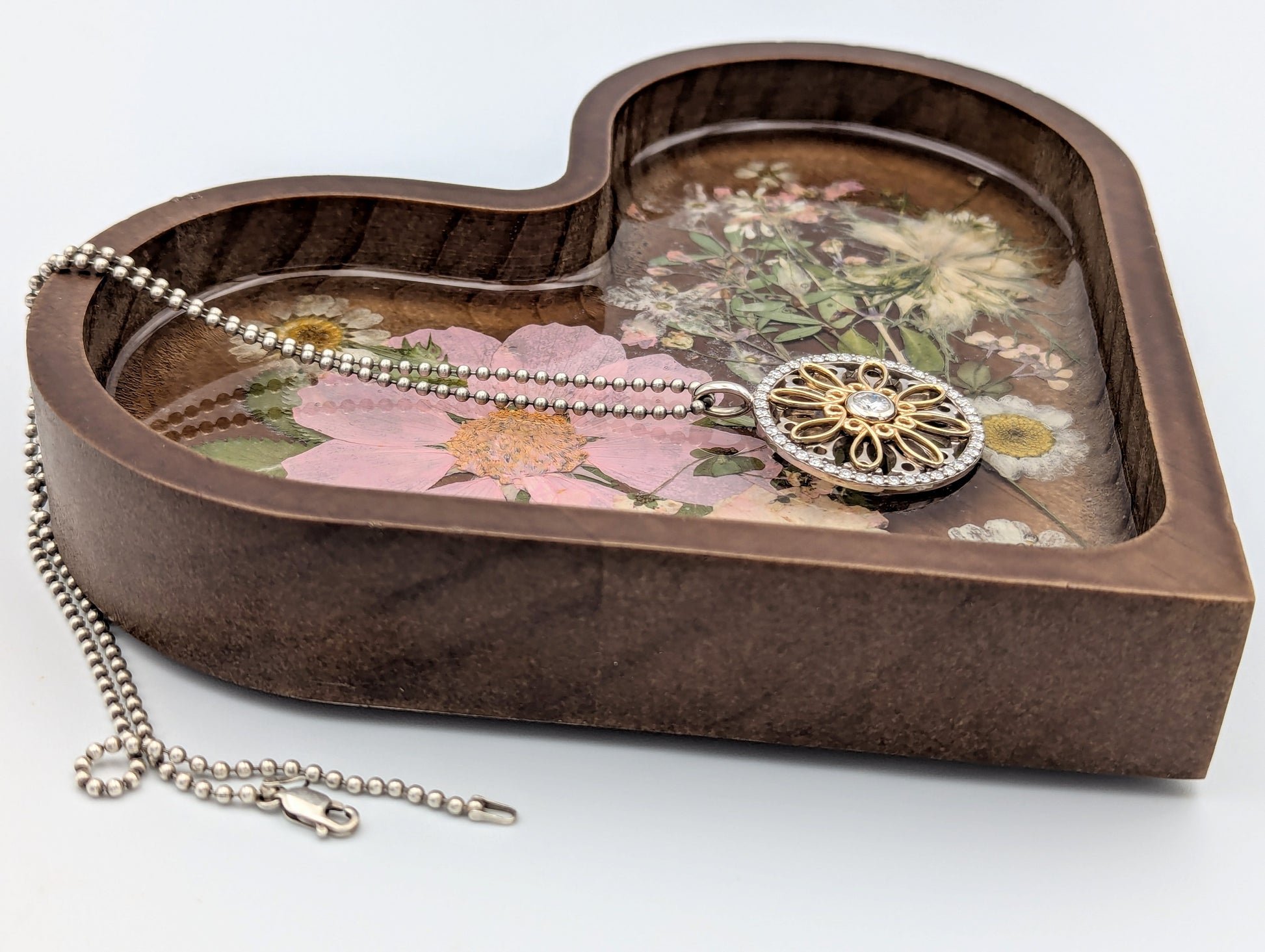 Our One-of-a-kind Wood Jewelry Dish. The handmade wood dish is adorned with dried flowers, preserved forever under clear resin. The back of the wood dish is engraved "Forever Yours, Endlessly." Keep your jewelry organized and protected.