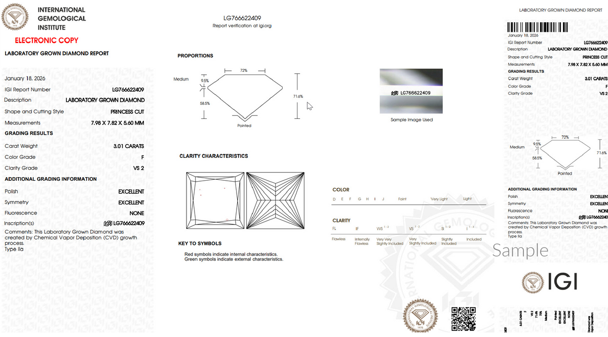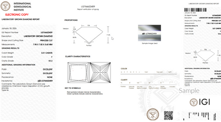 3.00 ct. IGI certified Princess Cut Lab Grown Diamond, Excellent Cut, F Color, VS2 Clarity.