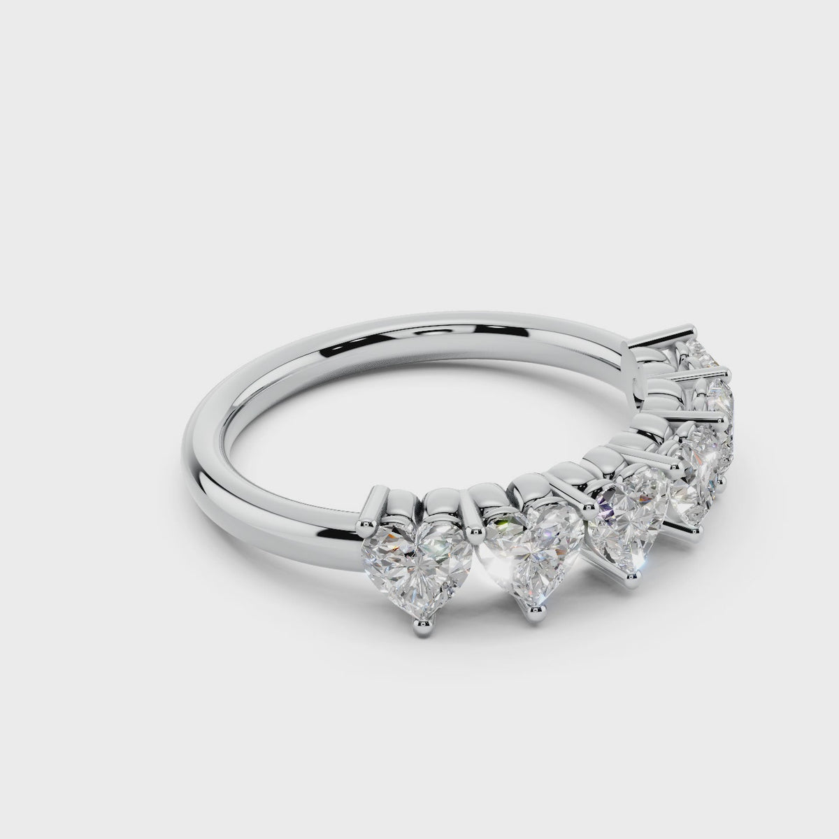 Six heart-shaped lab diamonds sparkle across this romantic anniversary ring. Crafted in solid silver, gold or platinum with F color, VS clarity 4mm heart diamonds and a comfortable 2.3mm band.