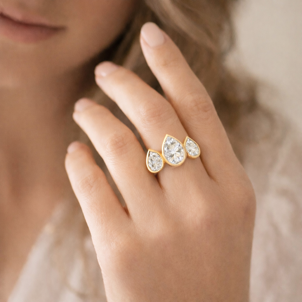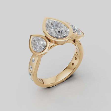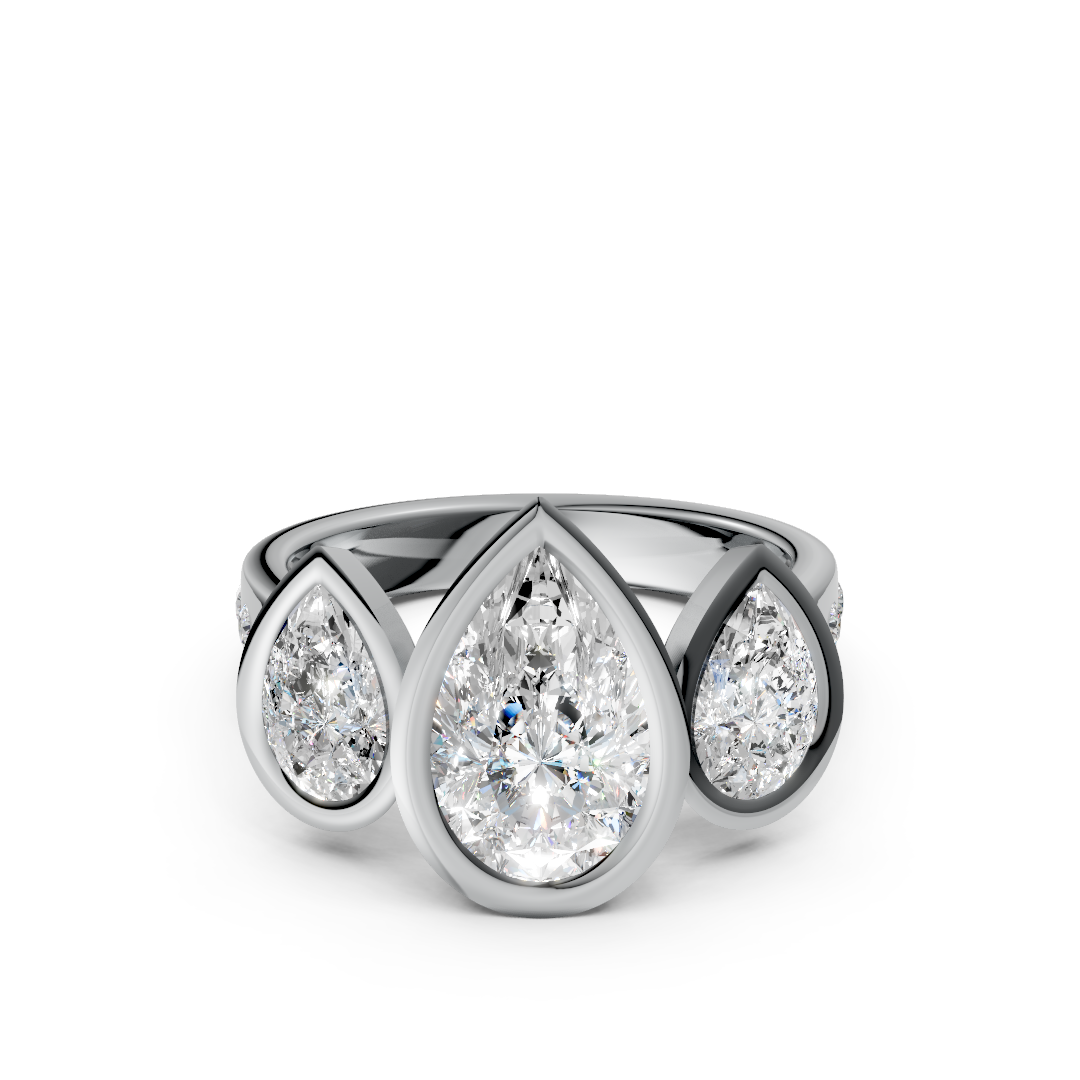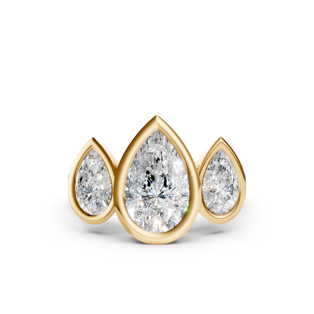 This three stone anniversary ring features three pear-shaped lab-grown diamonds in a sculptural cathedral bezel setting, accented with flush-set diamonds along the band. Elegant, symbolic, and impeccably crafted, this is timeless luxury with modern intention.