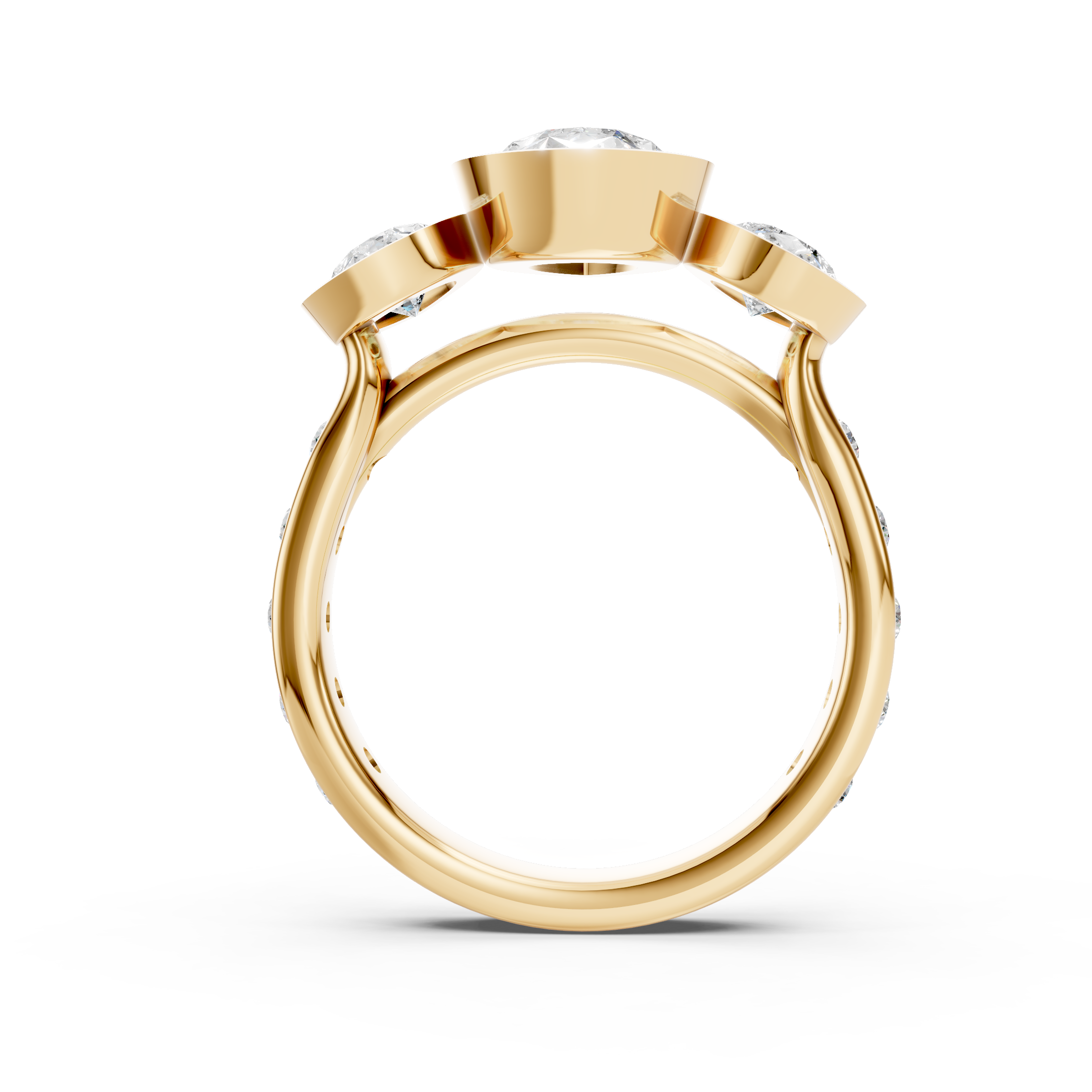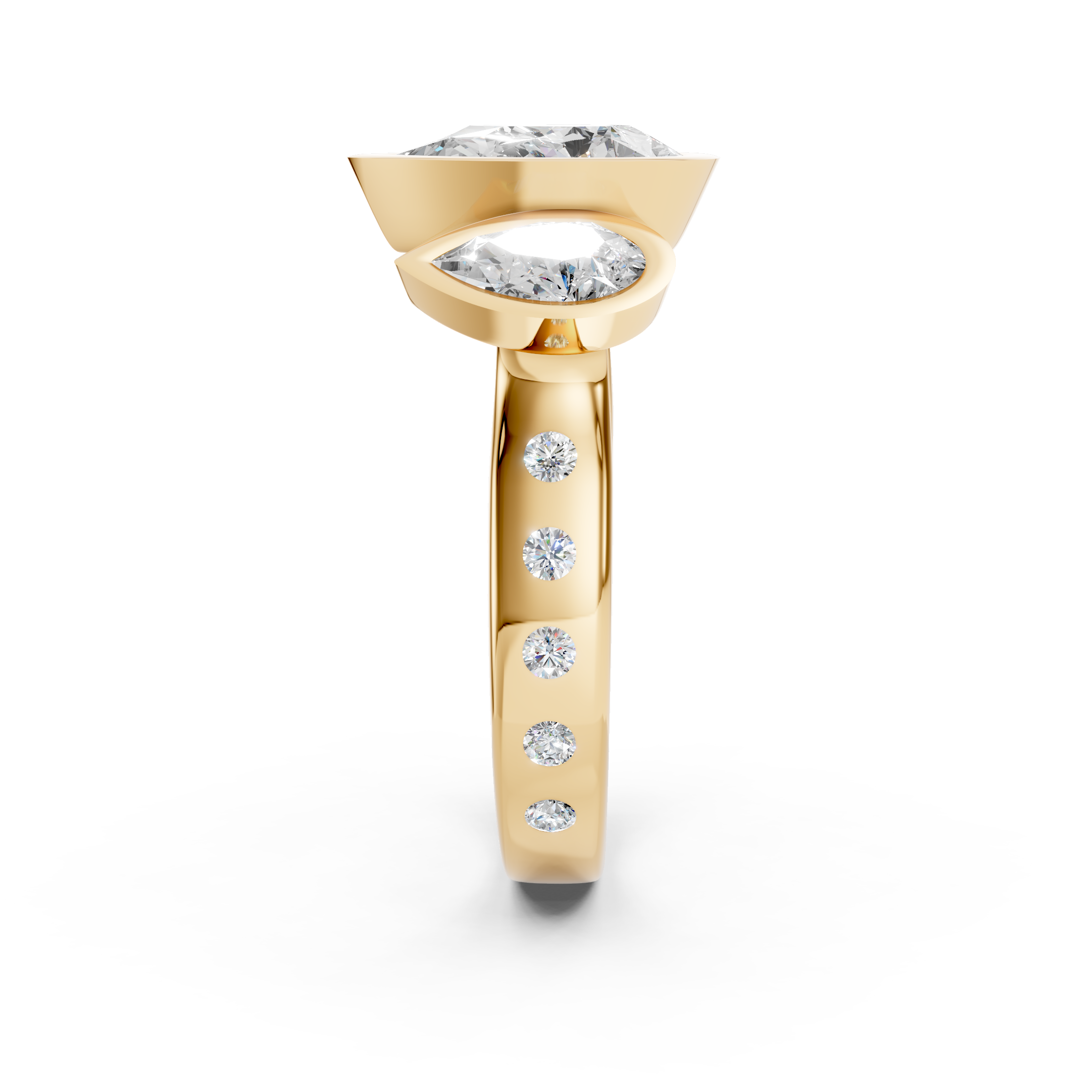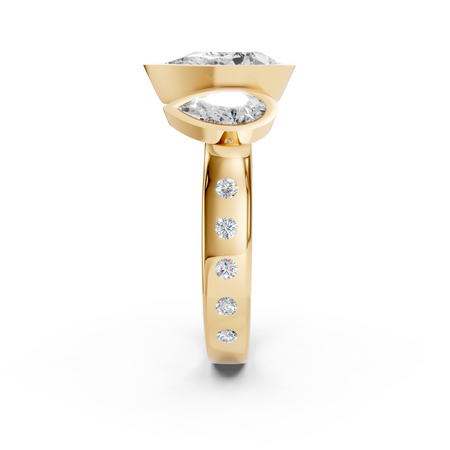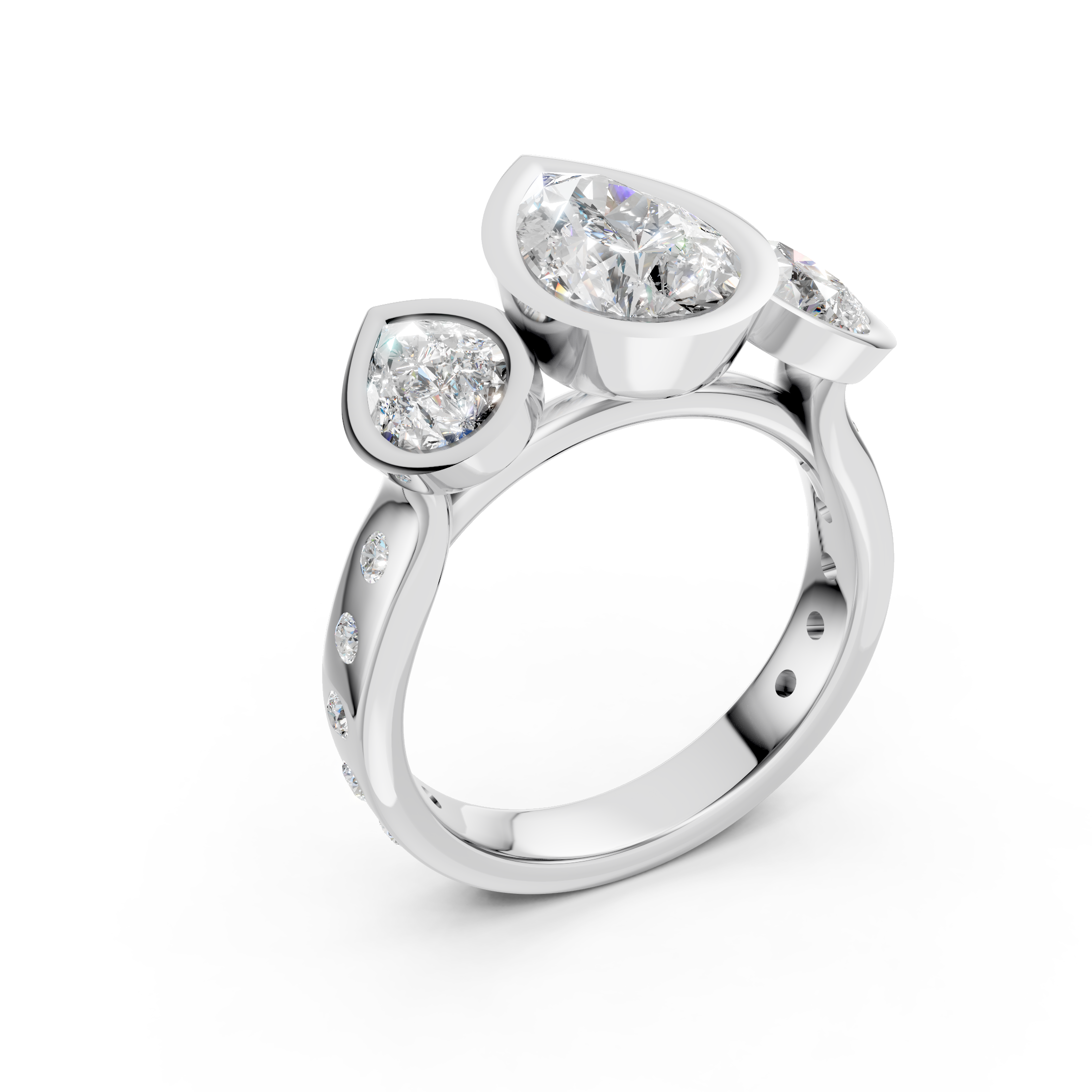 This three stone anniversary ring features three pear-shaped lab-grown diamonds in a sculptural cathedral bezel setting, accented with flush-set diamonds along the band. Elegant, symbolic, and impeccably crafted, this is timeless luxury with modern intention.