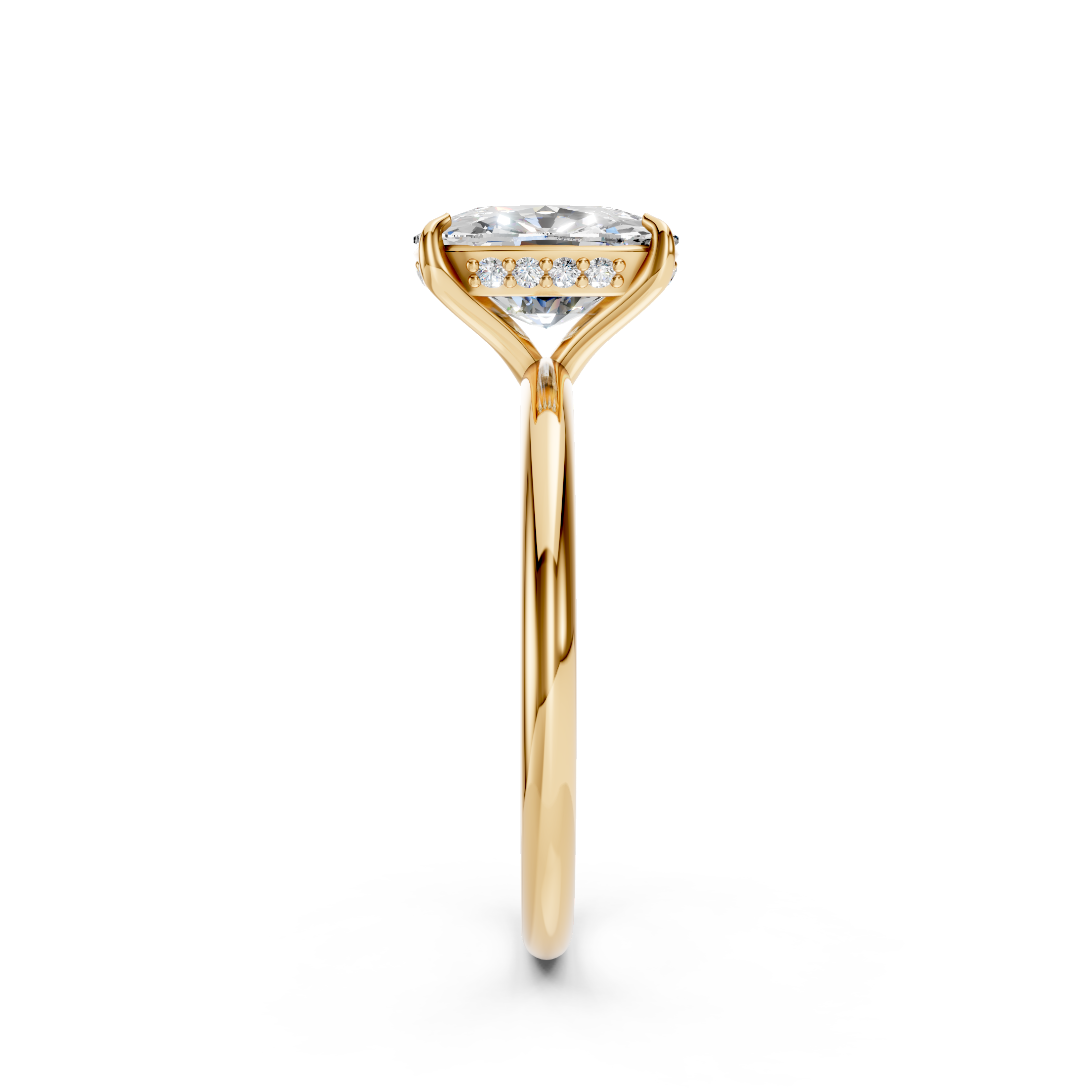 The centerpiece diamond is expertly cut for exceptional brilliance and fire, showcasing premium E color and VS clarity. A discreet hidden halo of diamonds beneath the center stone adds an unexpected touch of sparkle — visible from the side for a sophisticated, modern detail.