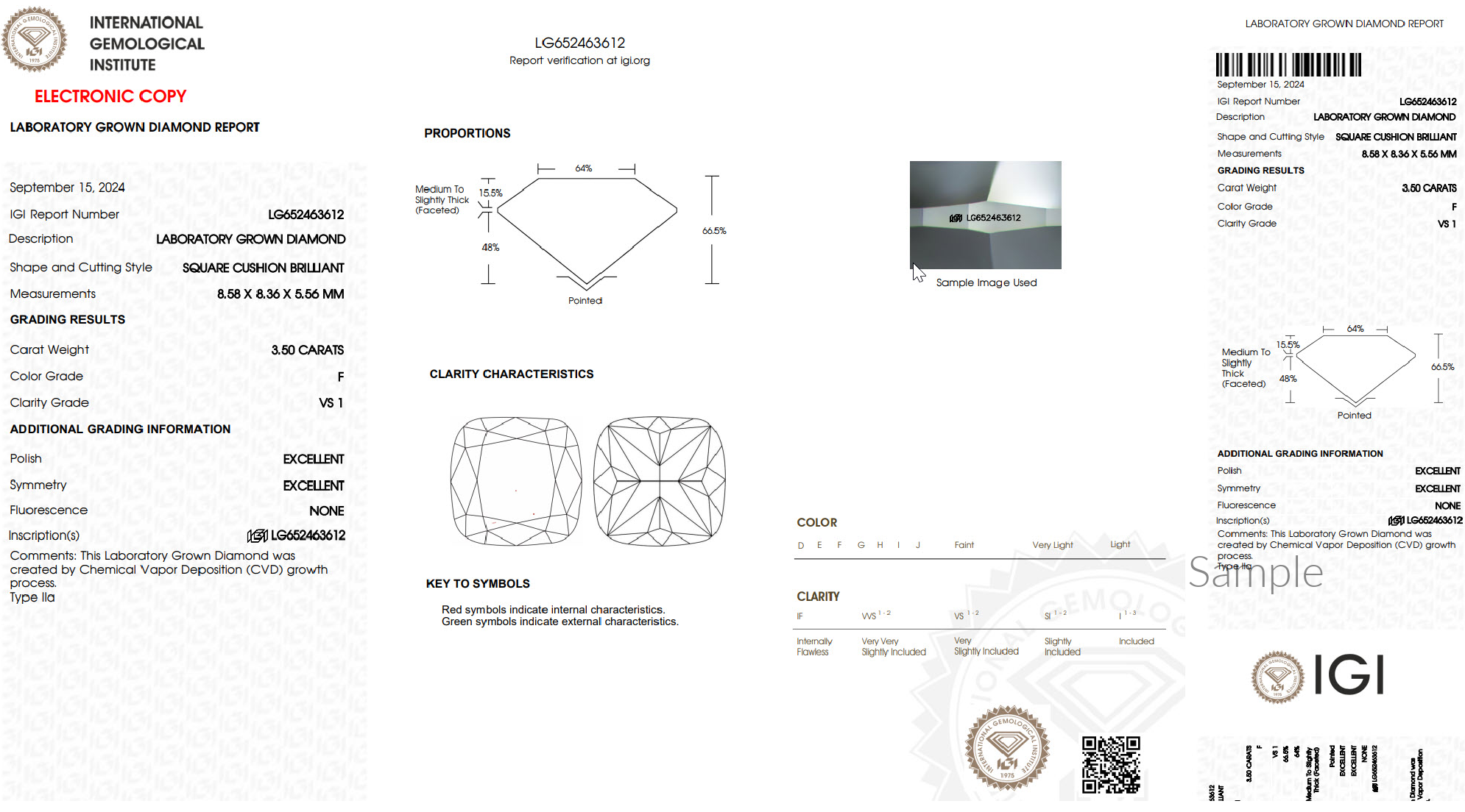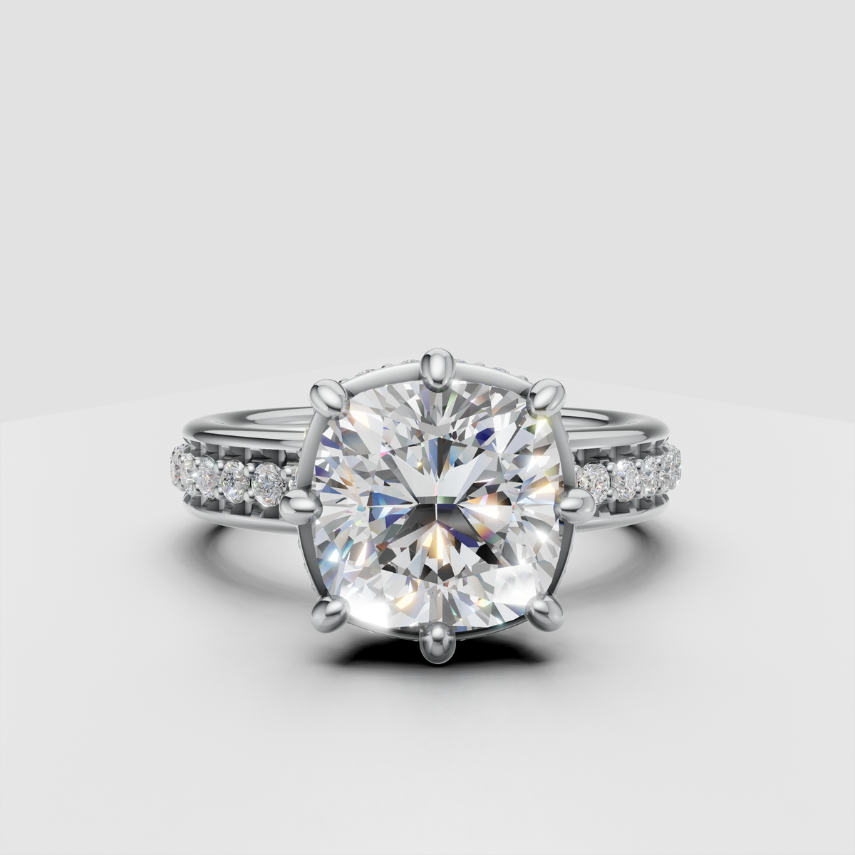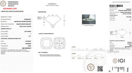 Center Stone: 3.50 ct. IGI Certified Cushion Cut Lab Grown Diamond, F Color, VS1 Clarity.