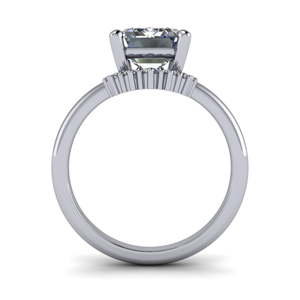 The engagement ring is set with an IGI certified 2.50 ct. emerald cut lab grown diamond engagement ring, F Color, VS1 Clarity.