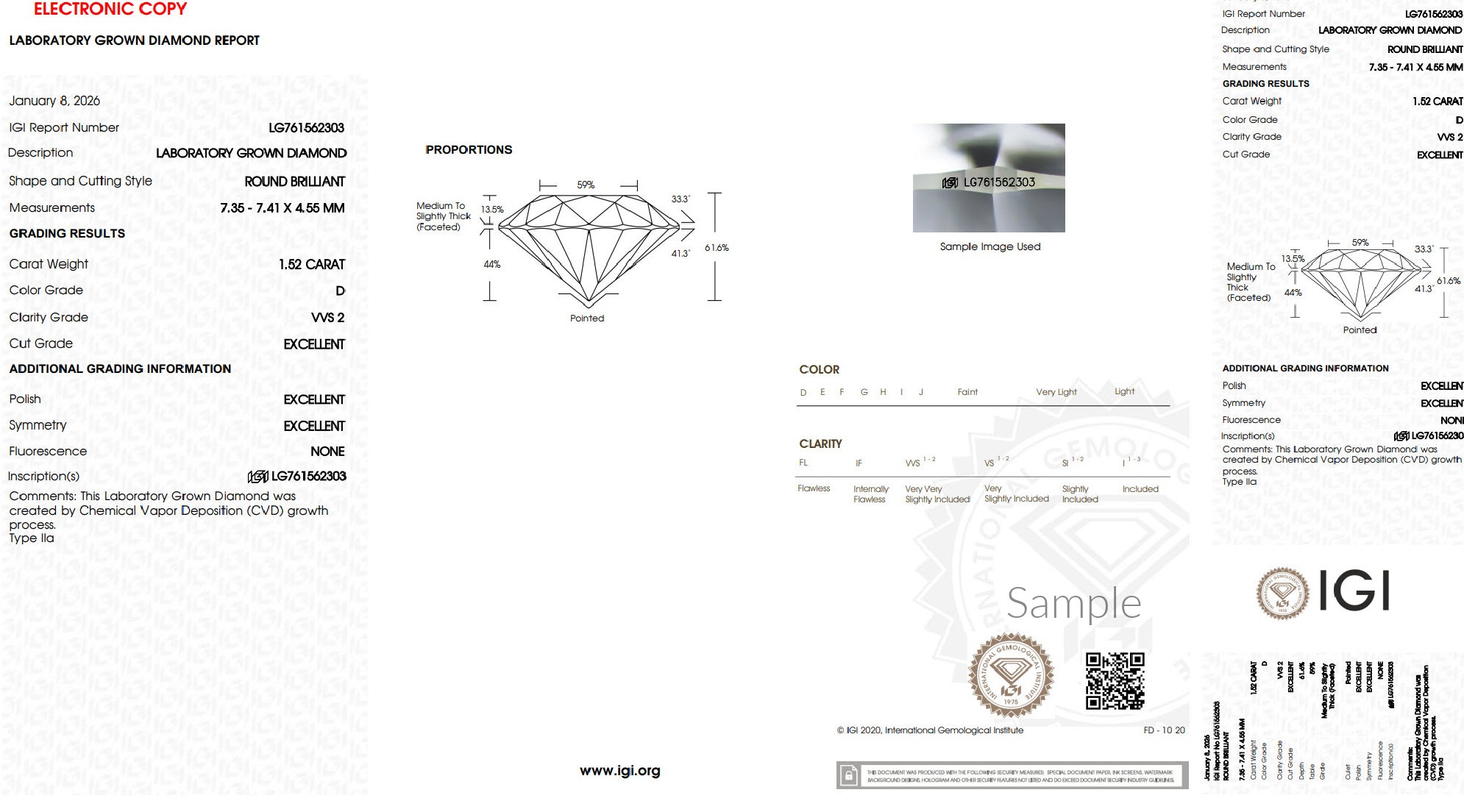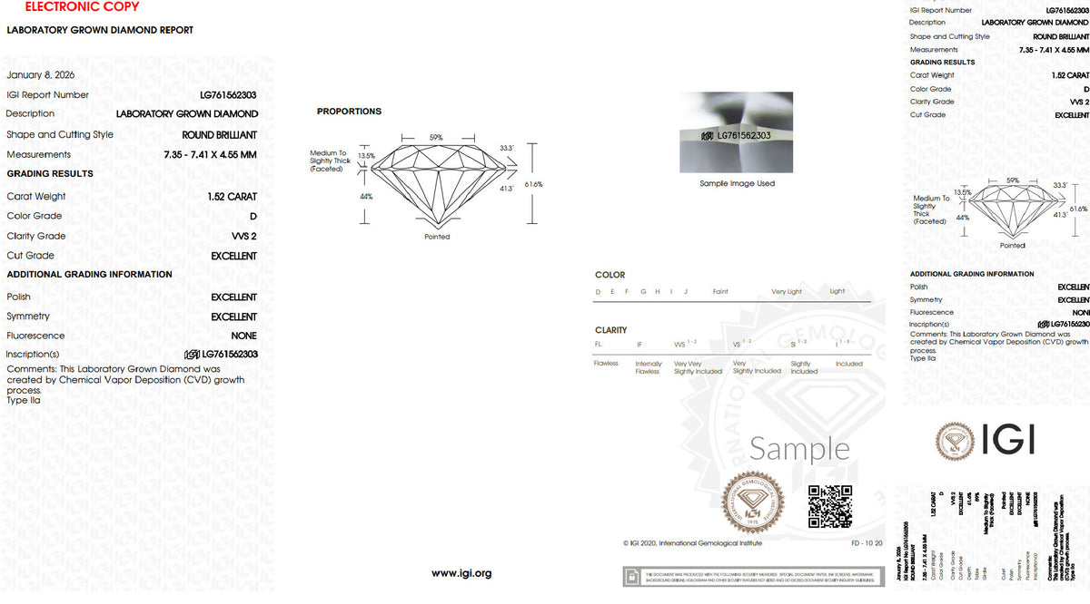 Center Stone: 1.50 ct. round lab grown diamond, Certified E Color, VSS2 Clarity.